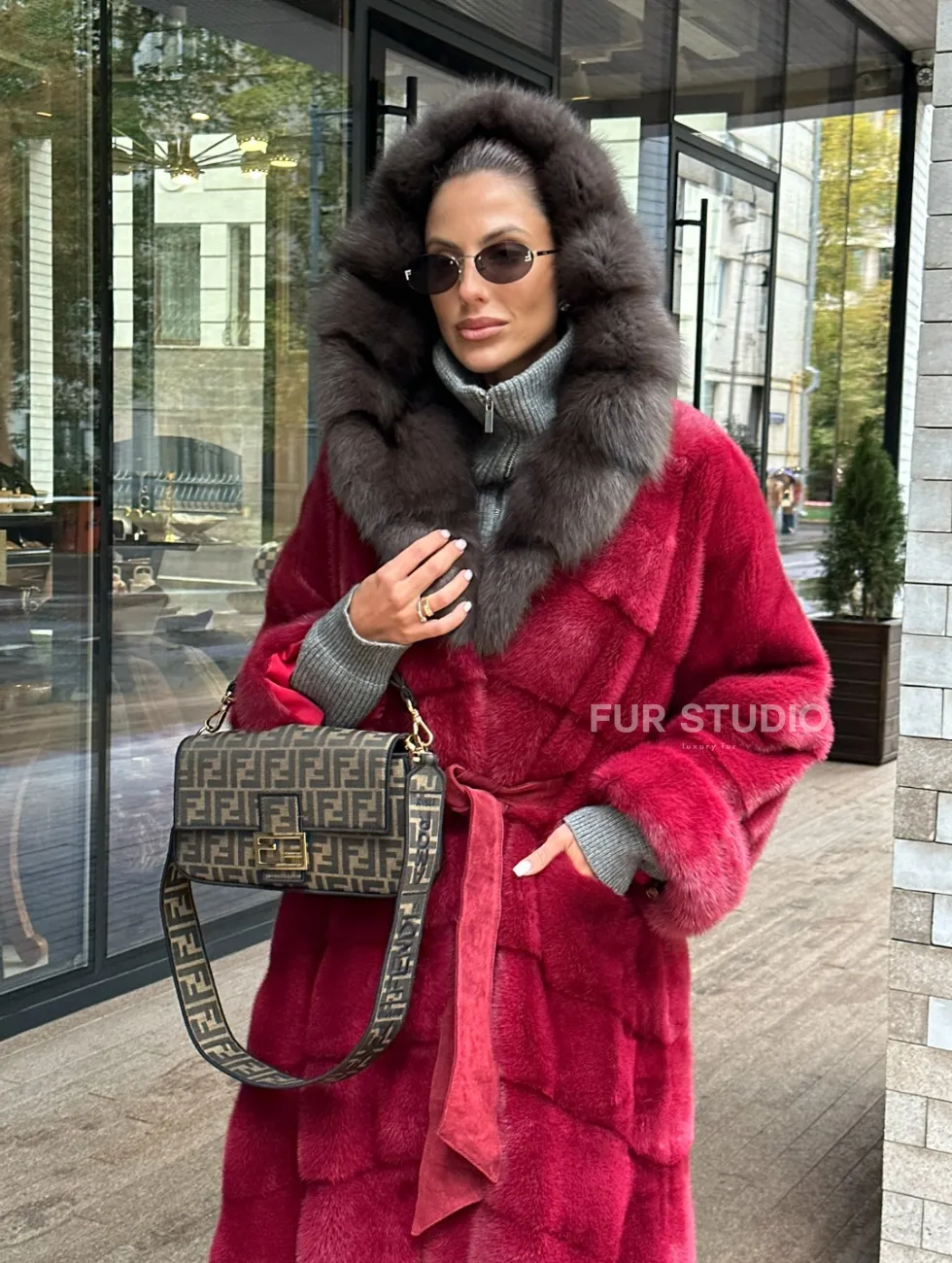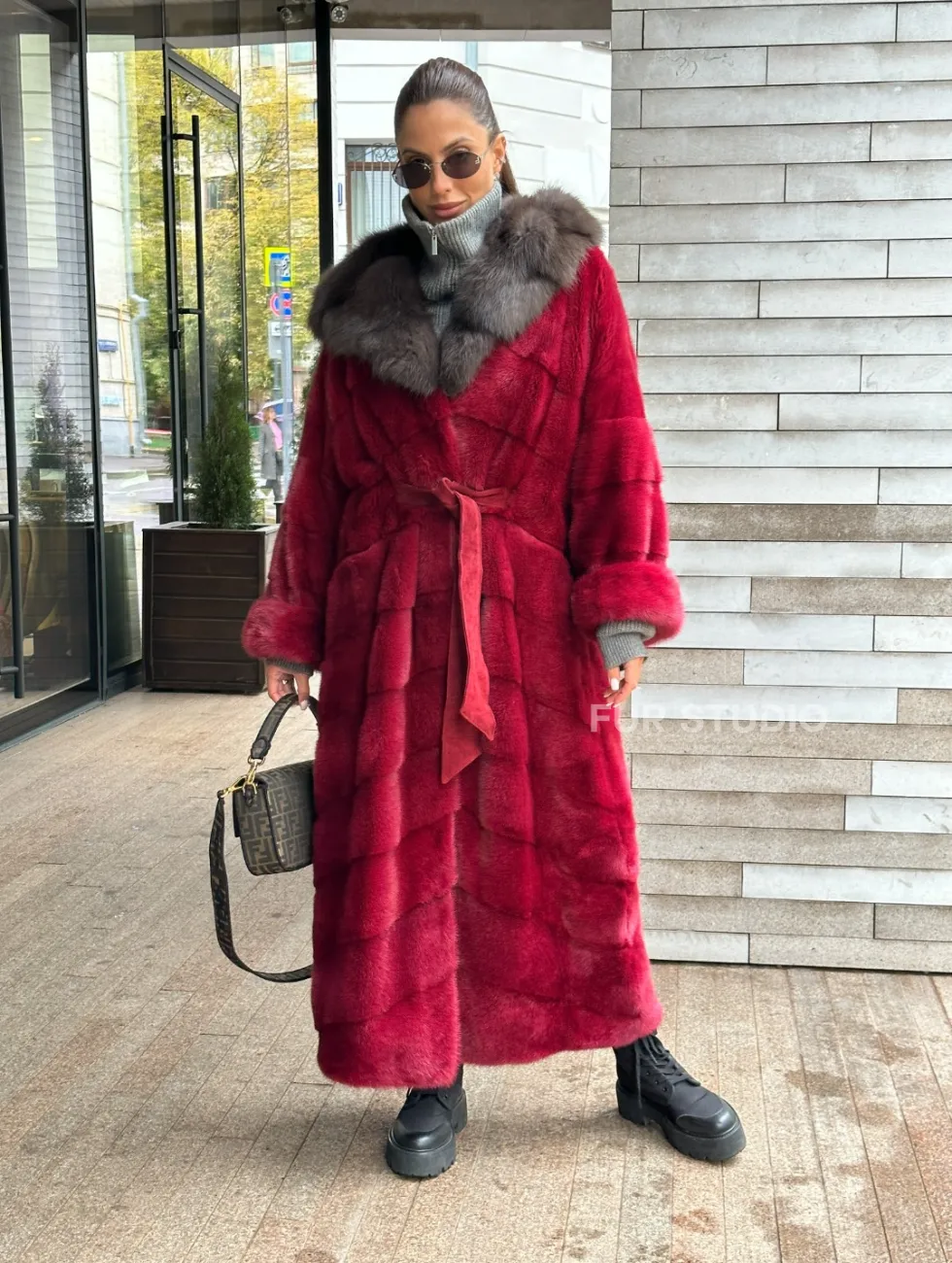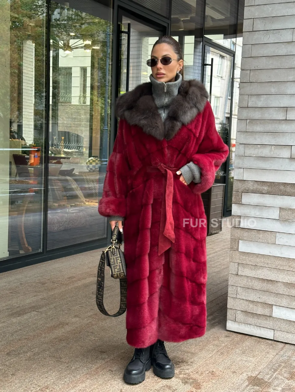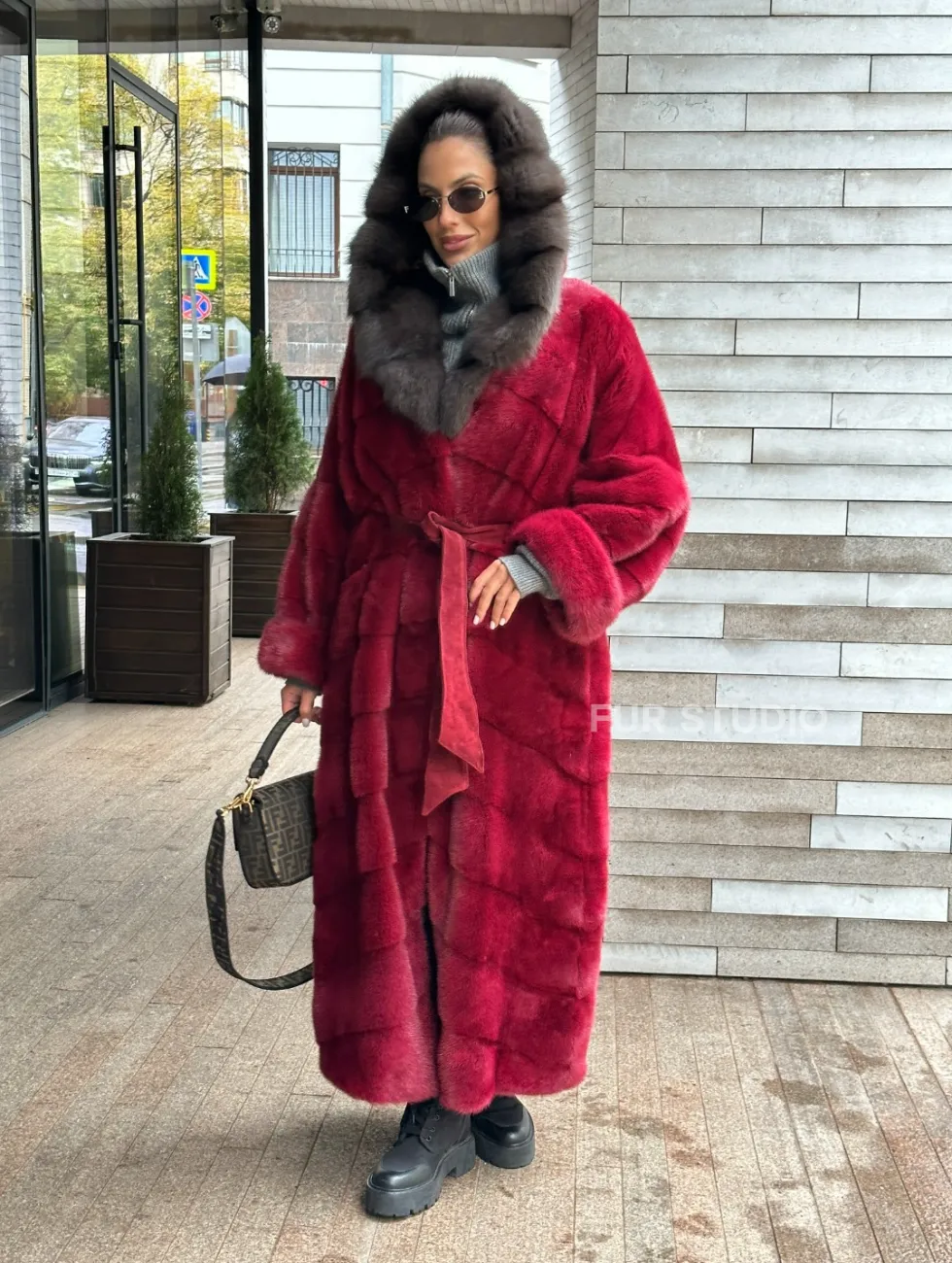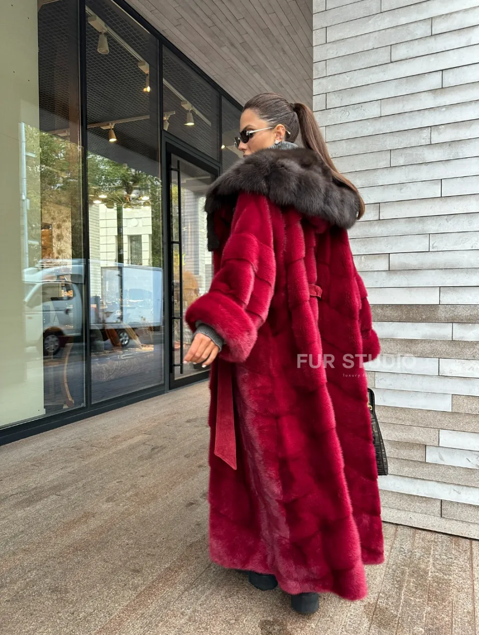 Мех данной шубы аукционная норка, цвет бордовый. Предлагается в размерах от 40 до 50. Длина модели 125-130 см, что выгодно подчеркивает фигуру девушек. Эта модель идеально подойдет для девушек и женщин, предпочитающих роскошные натуральные меха.
