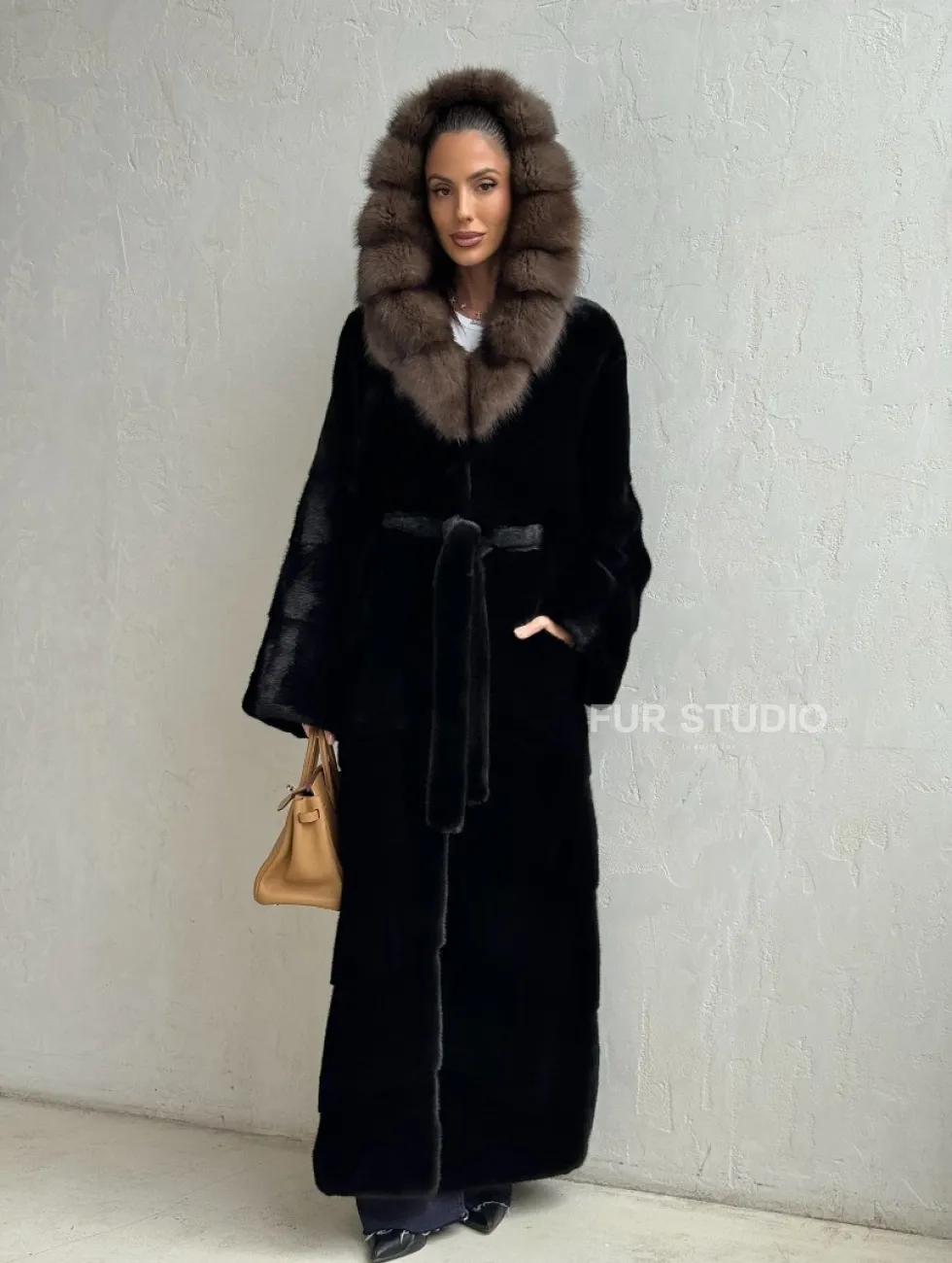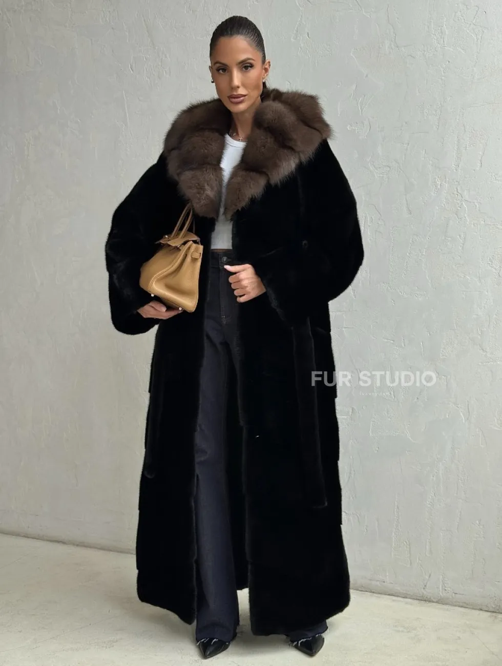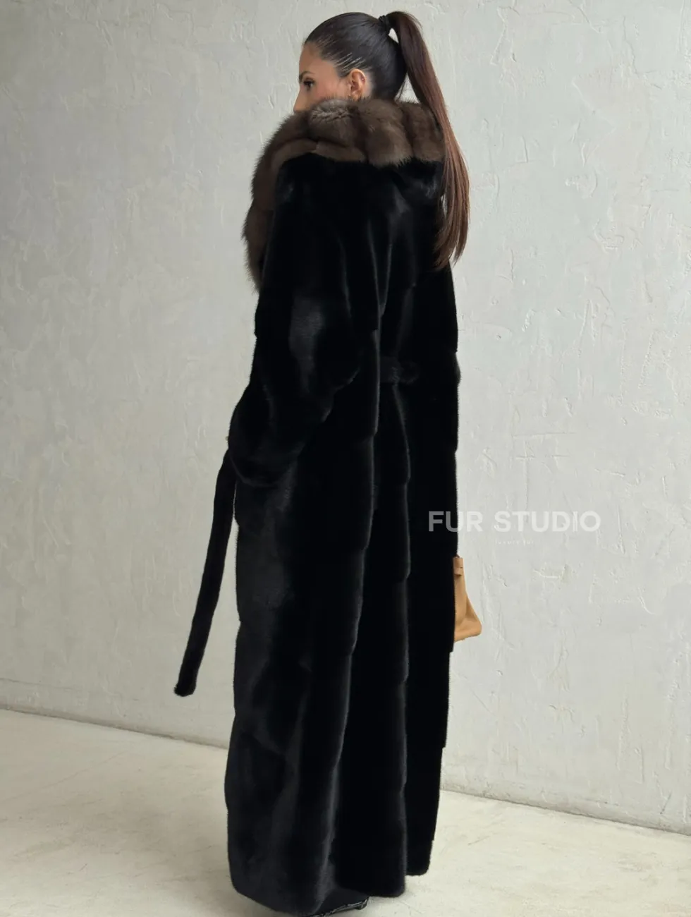 Мех данной шубы аукционная норка , цвет черный. Предлагается в размерах от 42 до 48 (oversize). Длина модели 135-140 см, что выгодно подчеркивает фигуру девушек. Эта модель идеально подойдет для девушек и женщин, предпочитающих роскошные натуральные меха.