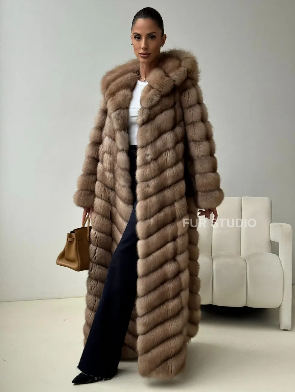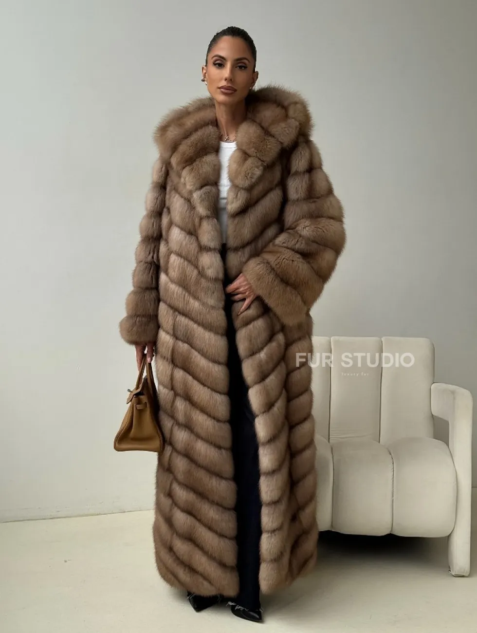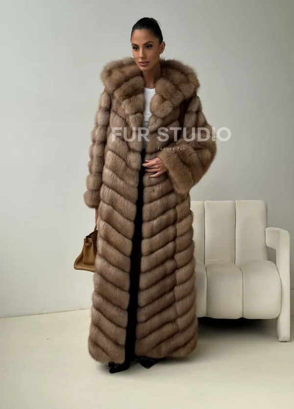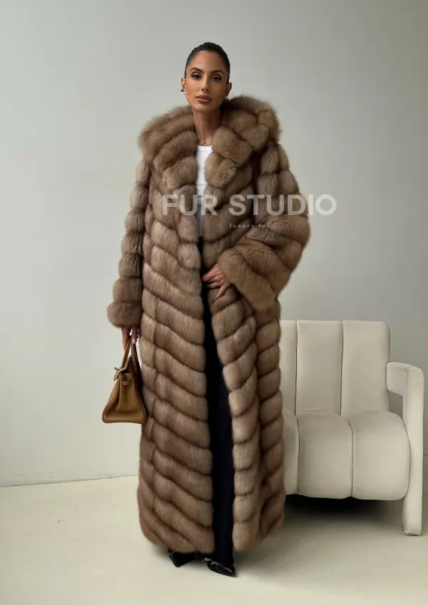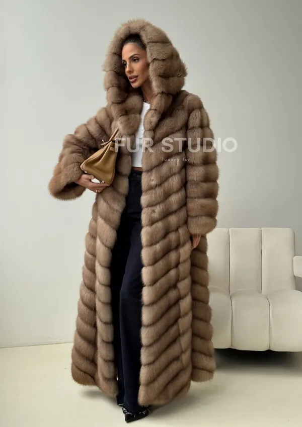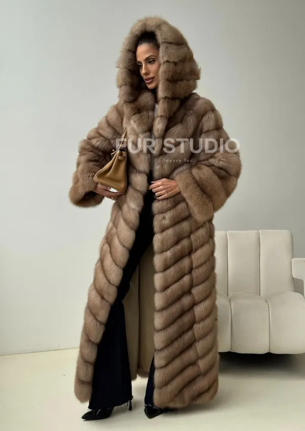 Длинная шуба из меха куницы с капюшоном доступна для покупки в нашем шоуруме Furs Studio в Чите. У нас так же есть доставка во все города России. Добавьте немного роскоши в свой гардероб с этой шубой, которая будет служить вам многие годы.