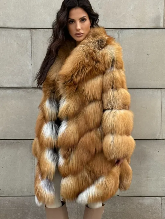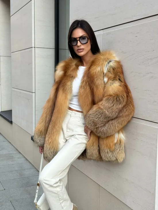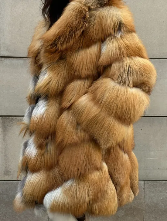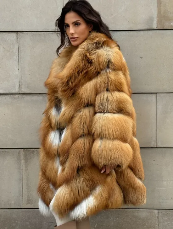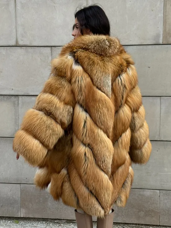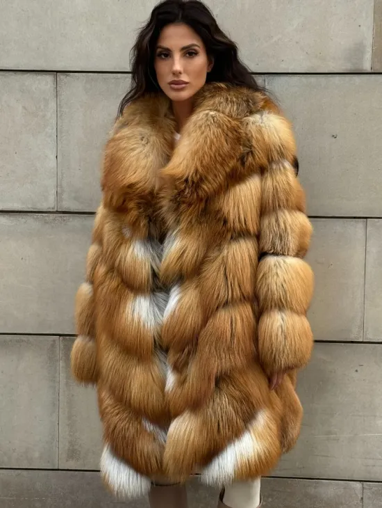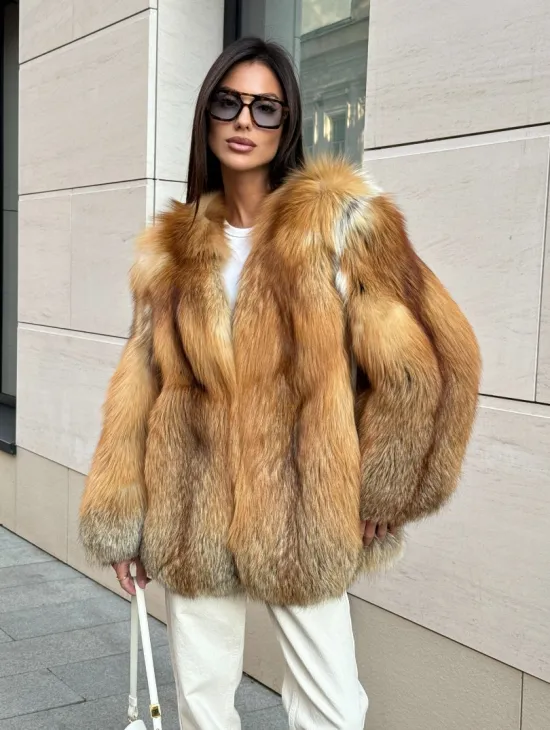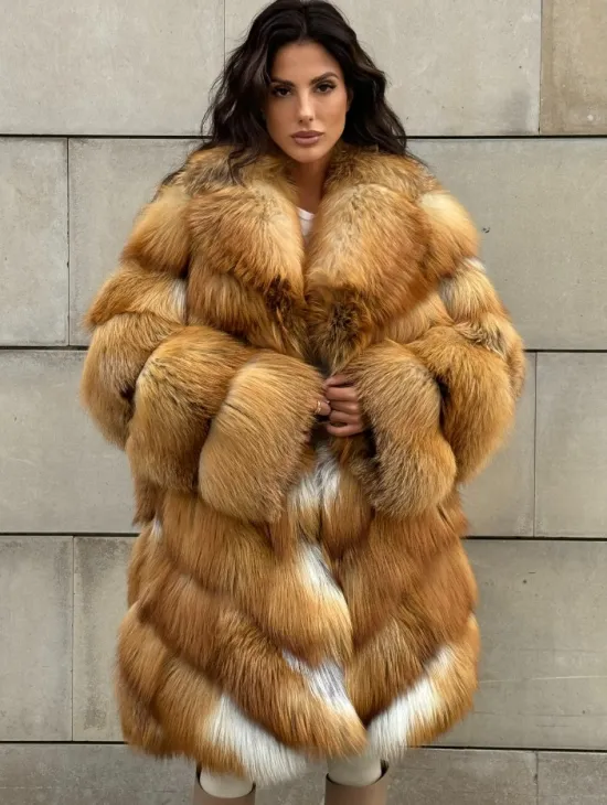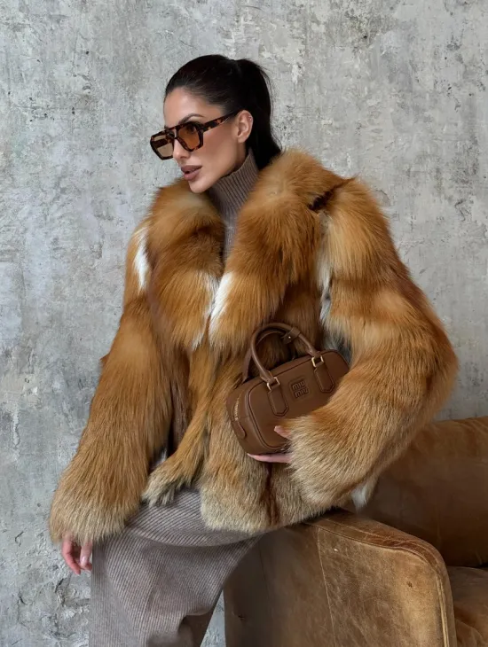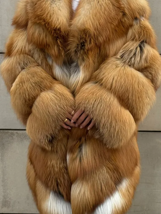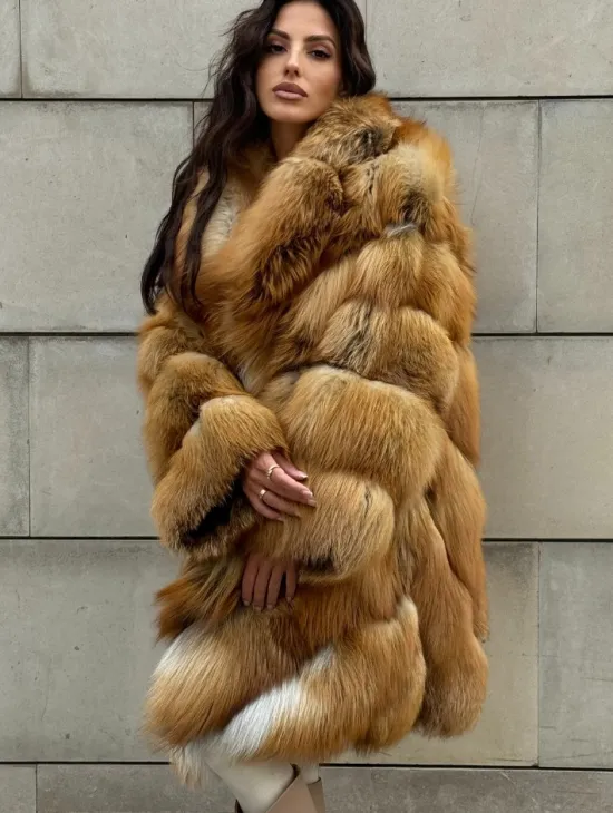 Мех данной шубы лиса, цвет рыжий. Предлагается в размерах от 40 до 50. Длина модели 115-120 см, что выгодно подчеркивает фигуру девушек. Эта модель идеально подойдет для девушек и женщин, предпочитающих роскошные натуральные меха.