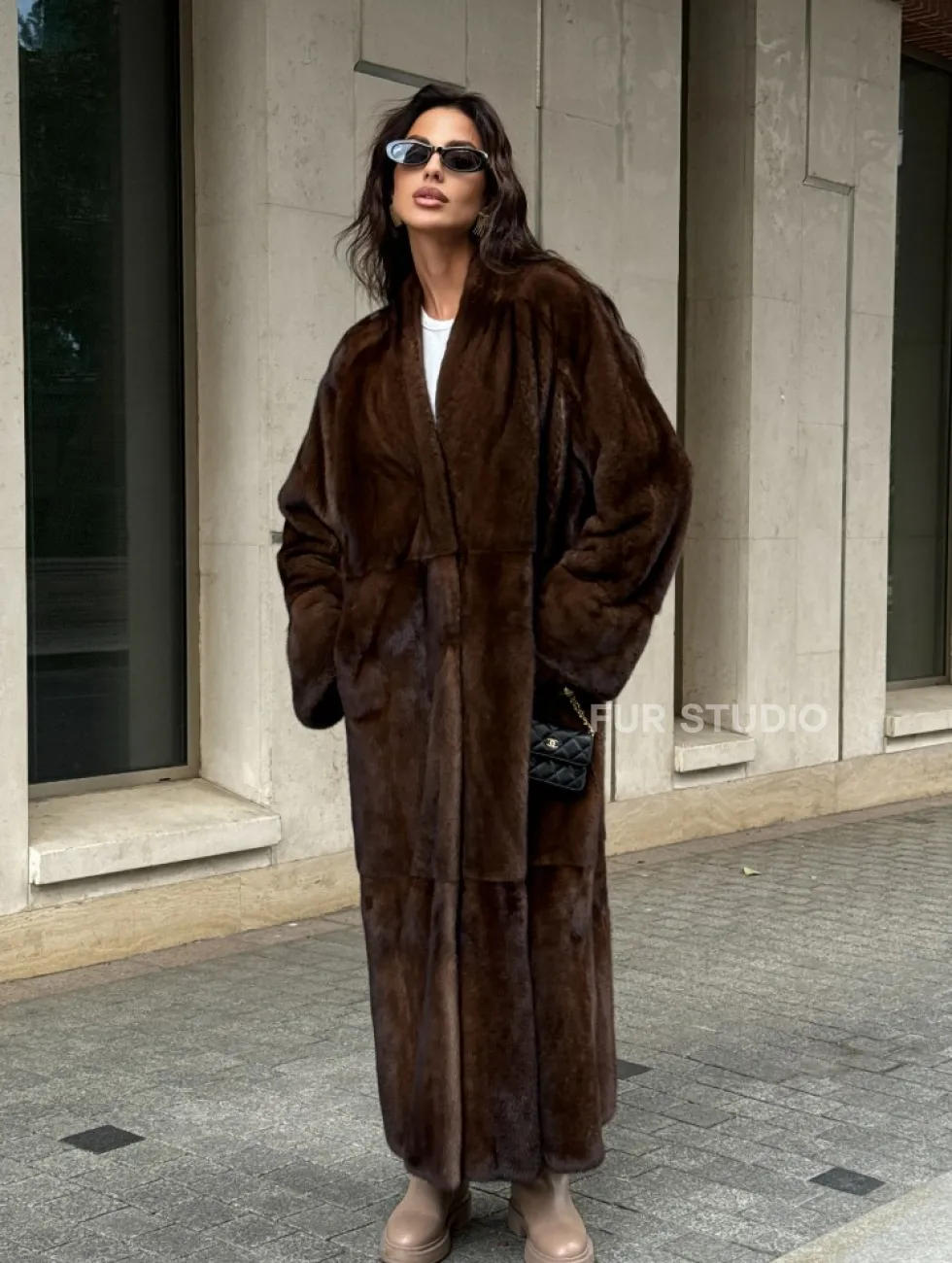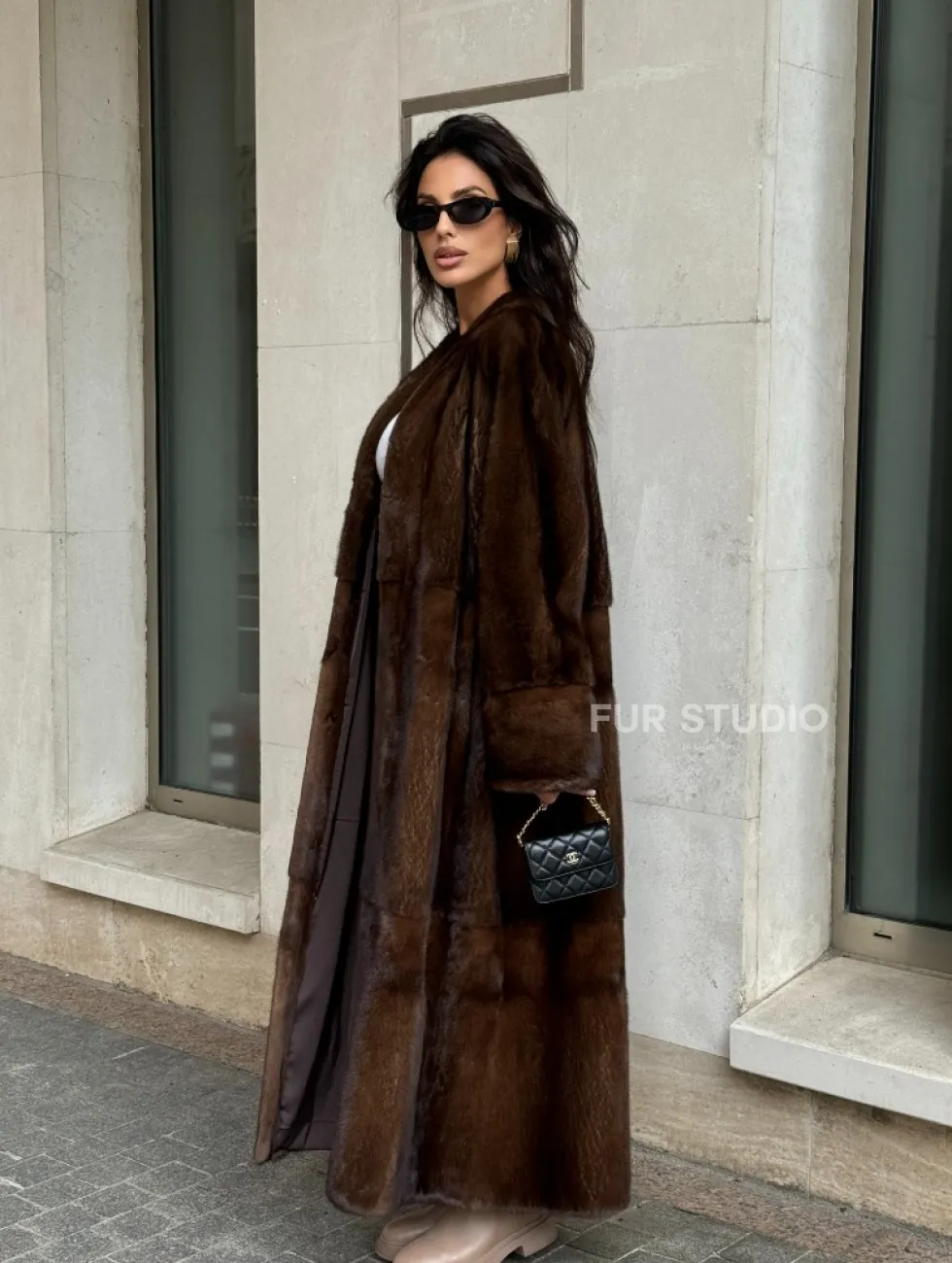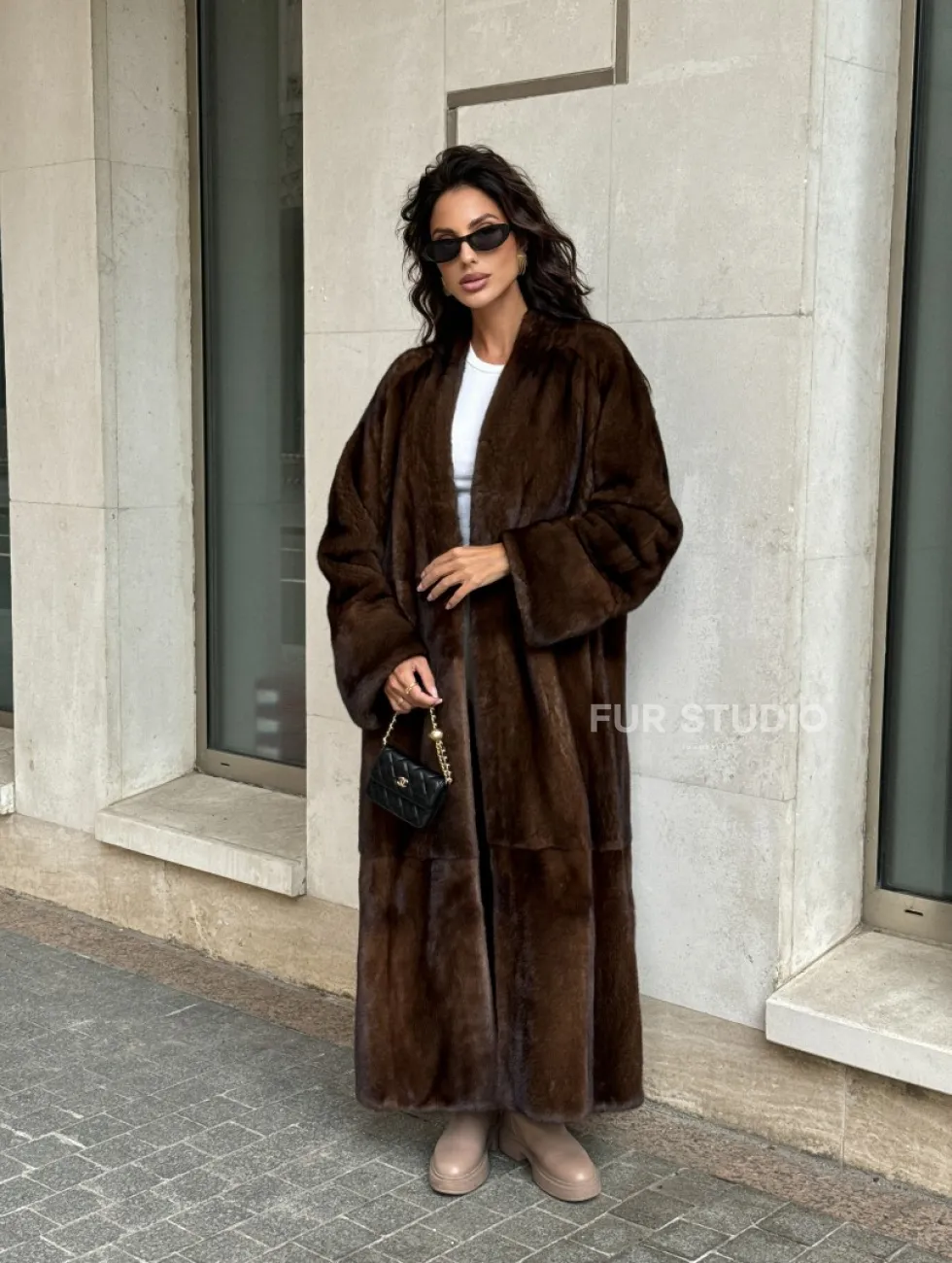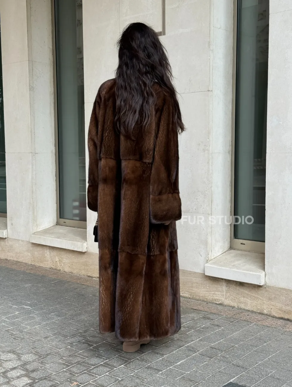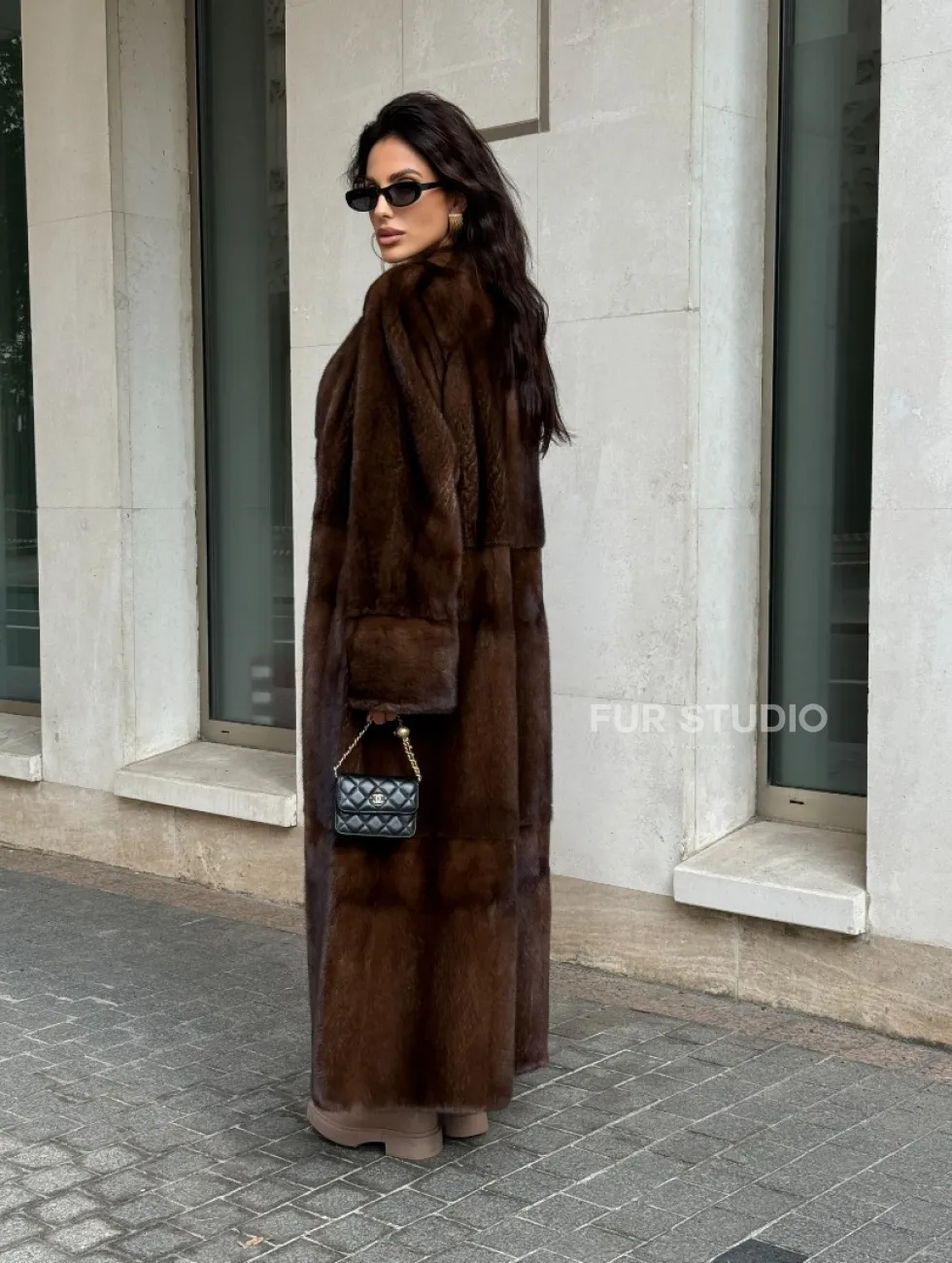 Мех данной шубы аукционная норка , цвет коричневый. Предлагается в размерах от 40 до 52. Длина модели 125-130 см, что выгодно подчеркивает фигуру девушек. Эта модель идеально подойдет для девушек и женщин, предпочитающих роскошные натуральные меха.