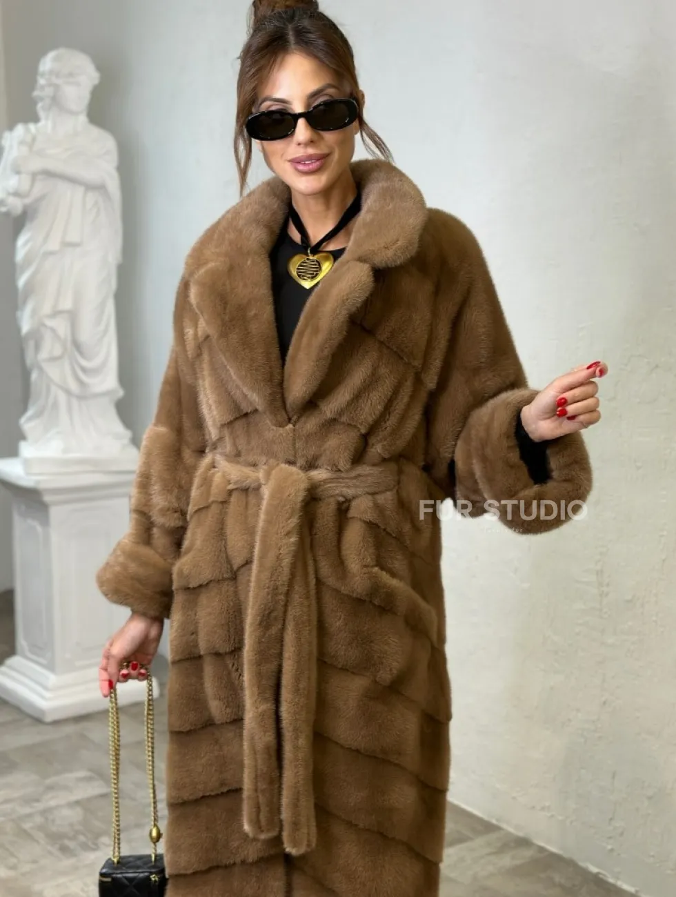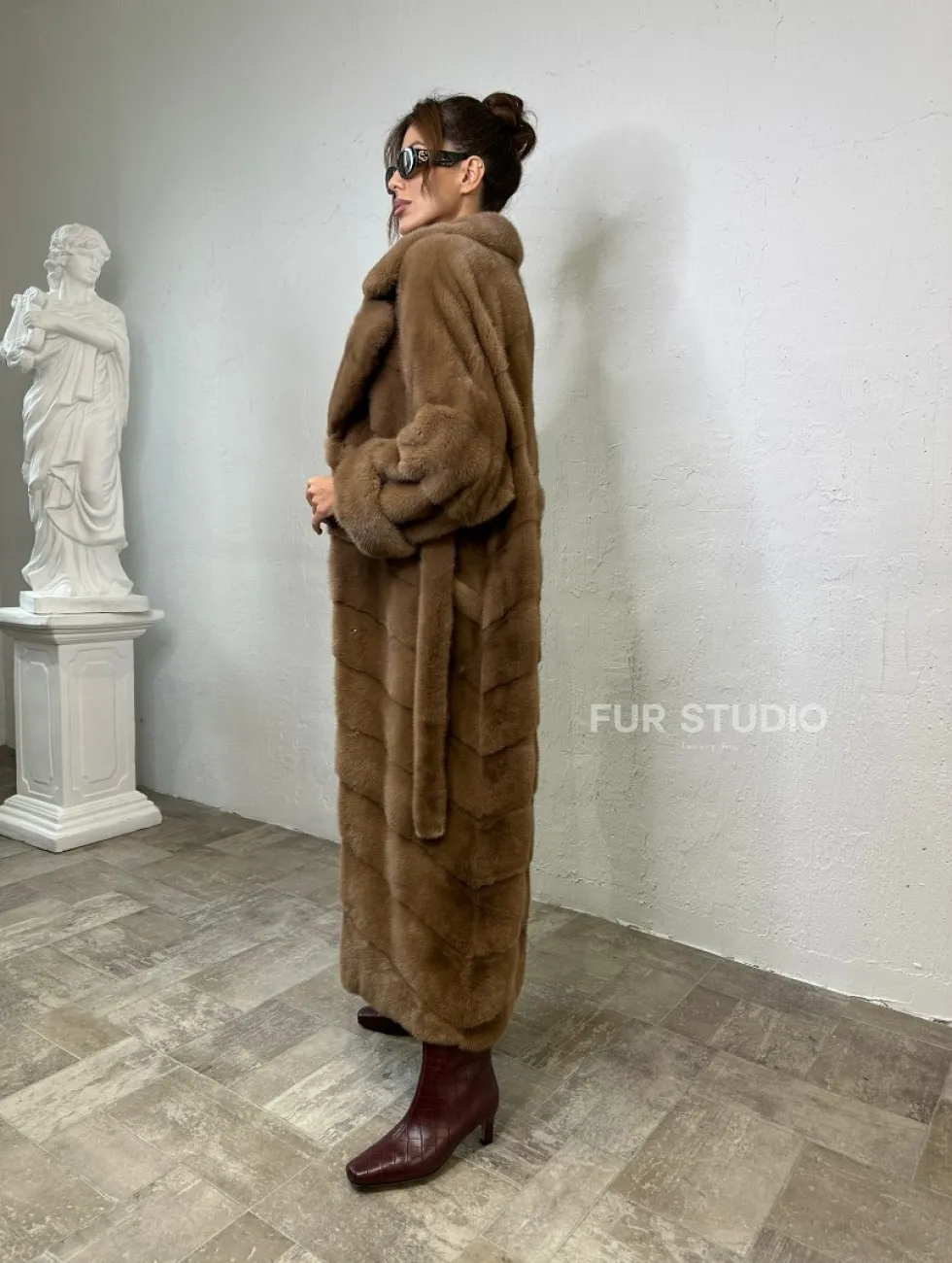 Мех данной шубы аукционная норка , цвет бежевый. Предлагается в размерах от 40 до 50. Длина модели 125-130 см, что выгодно подчеркивает фигуру девушек. Эта модель идеально подойдет для девушек и женщин, предпочитающих роскошные натуральные меха.