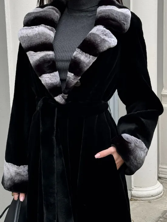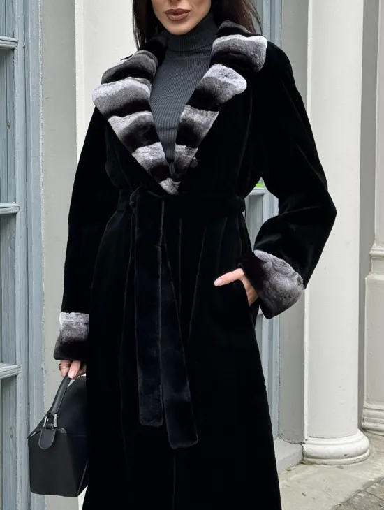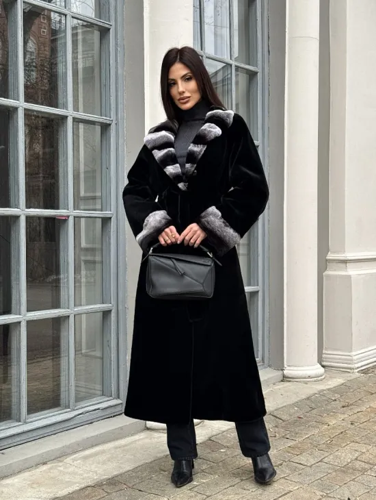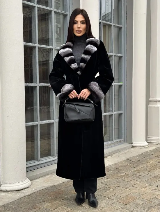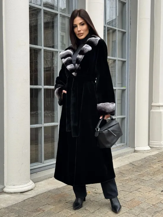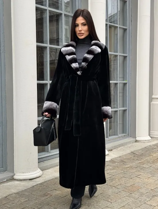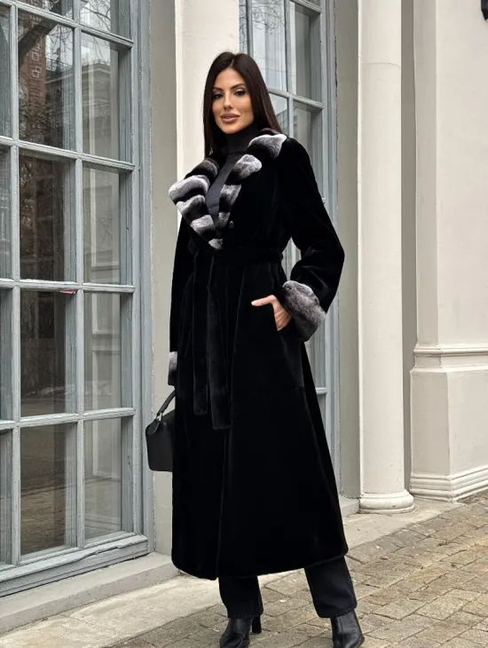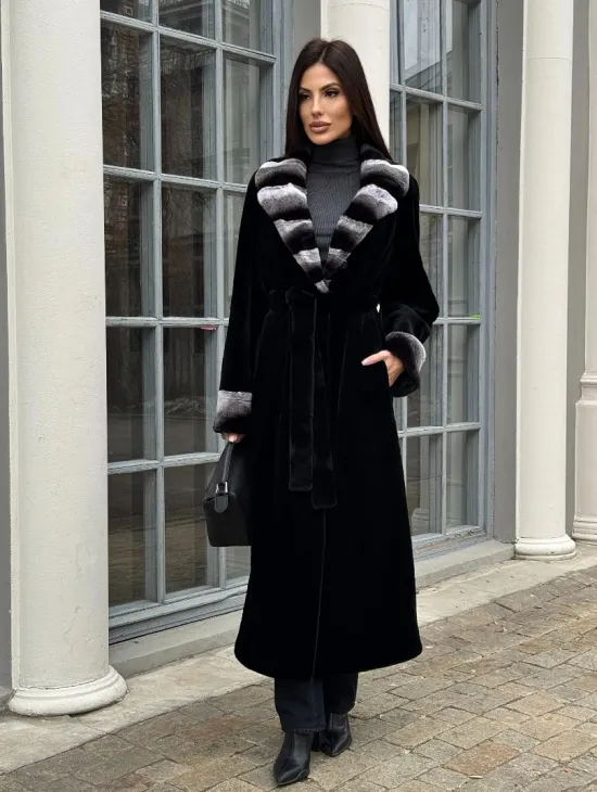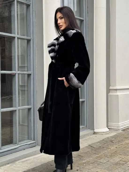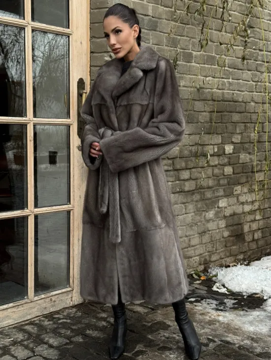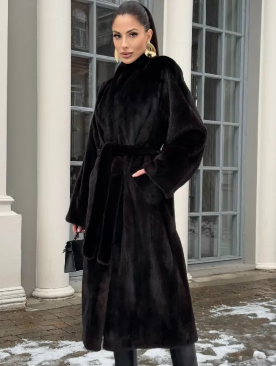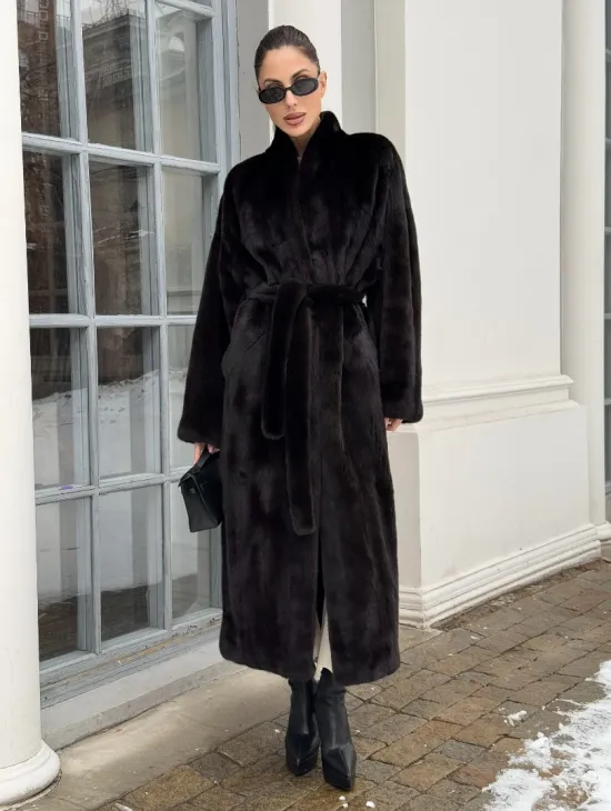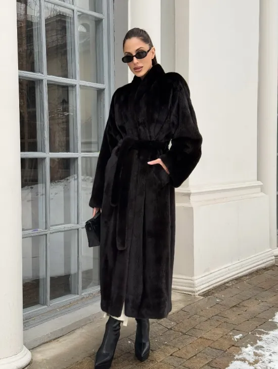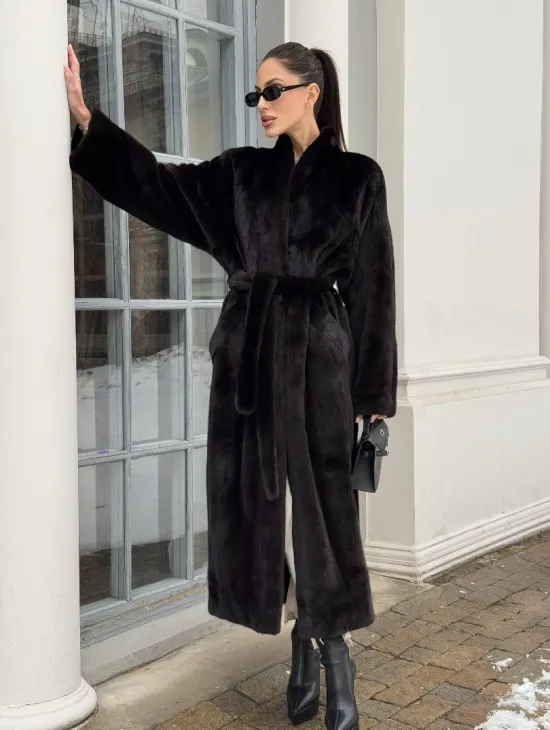 Прямая норковая шуба Luxury Line с меховым поясом и шлицами по бокам