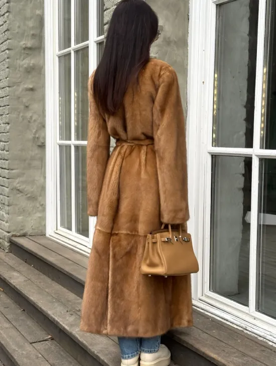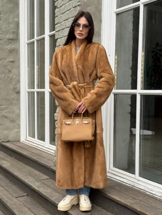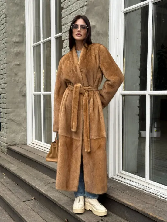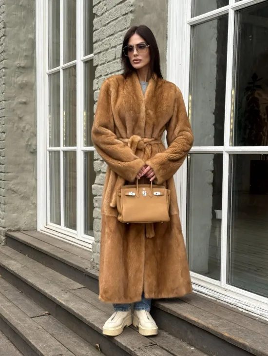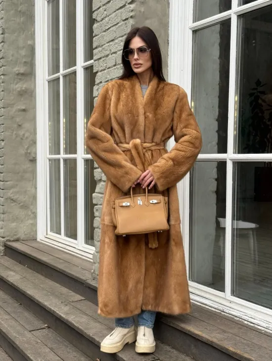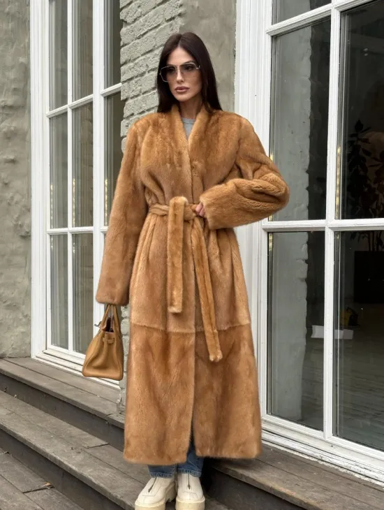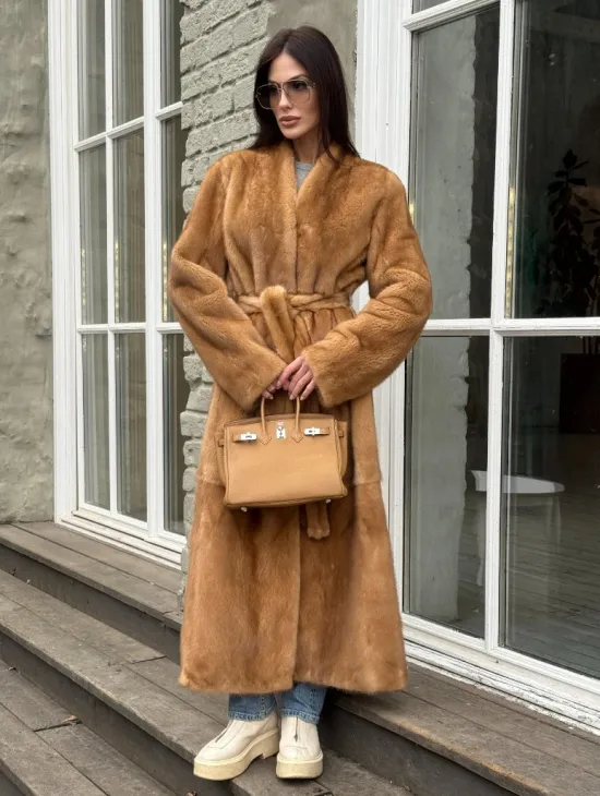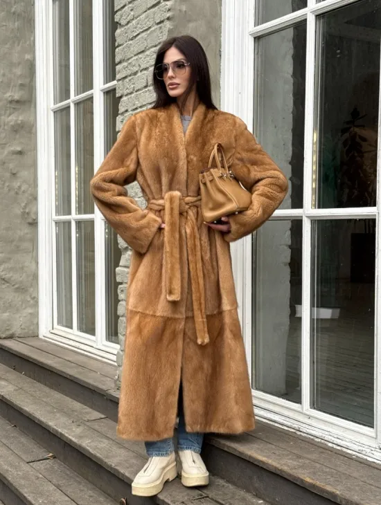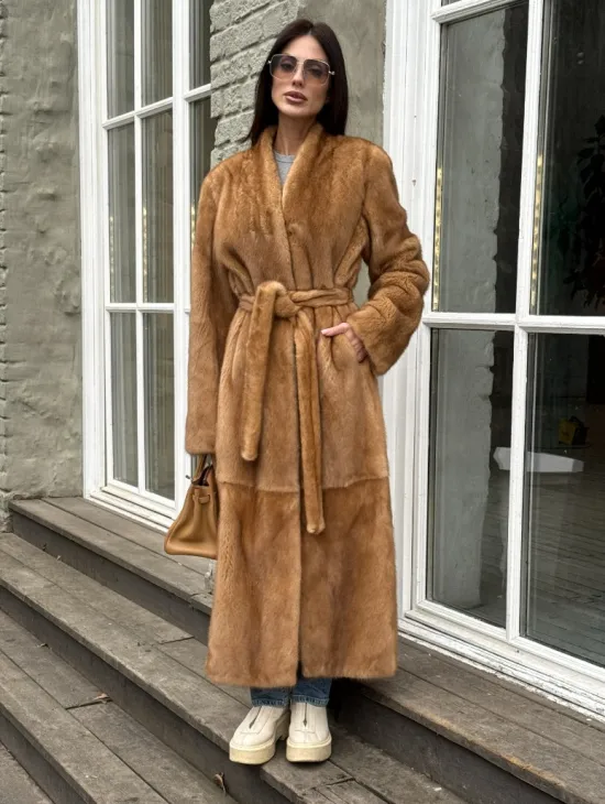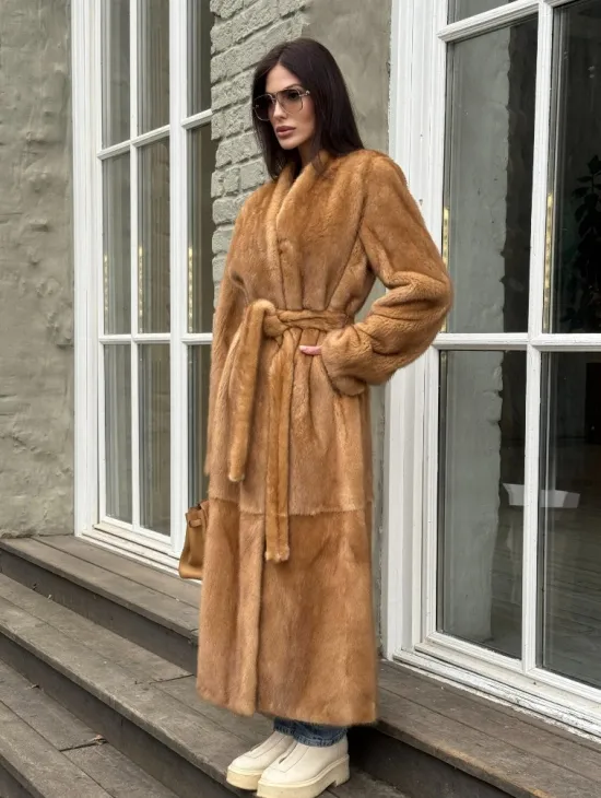 Шуба из норки «Gold» в классической выкладке с V-образным воротником и поясом