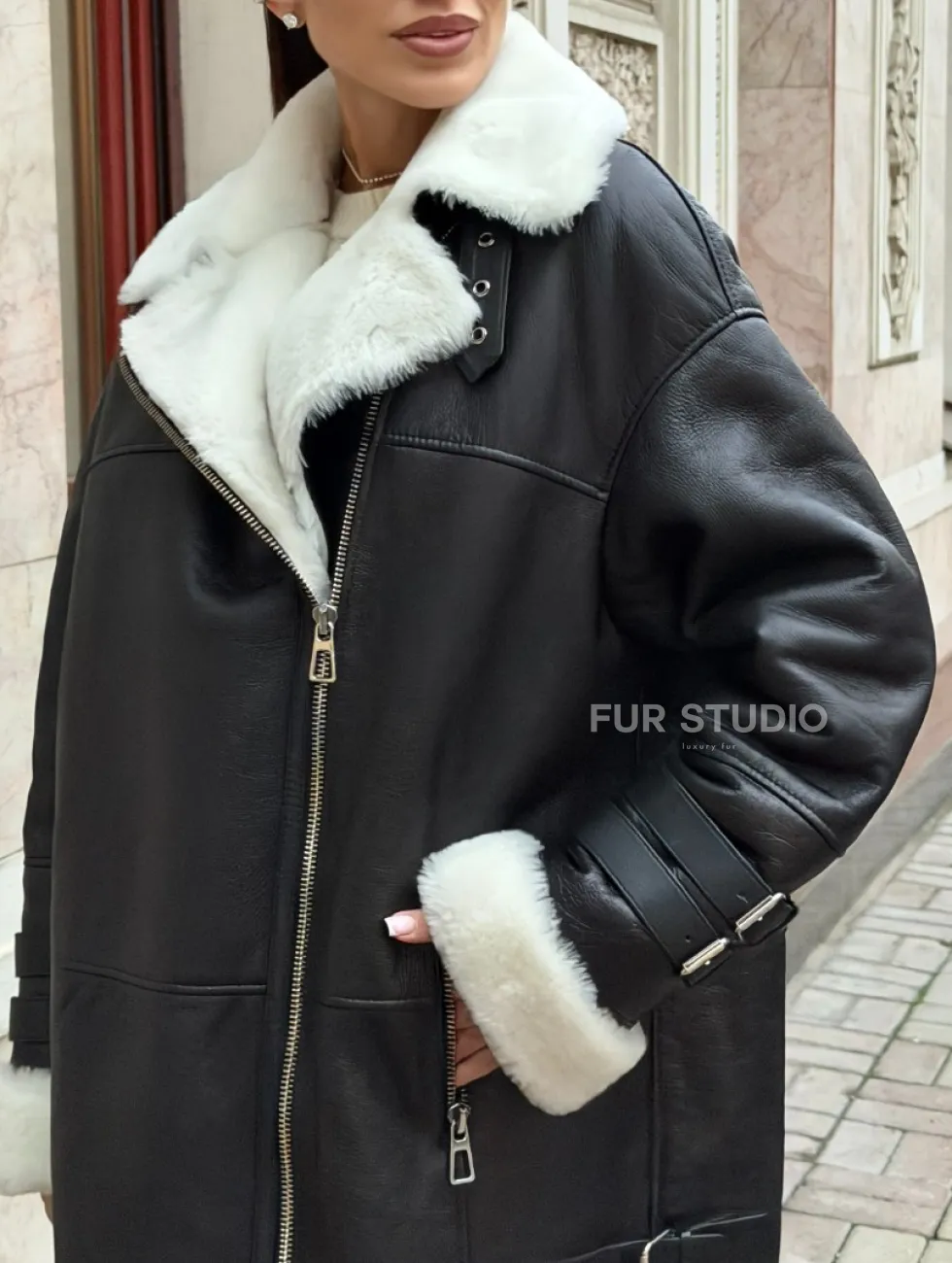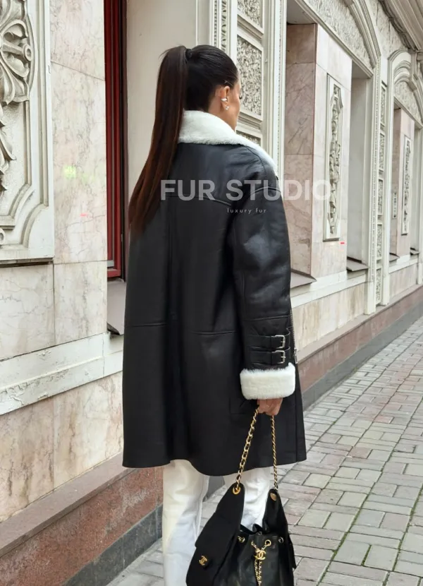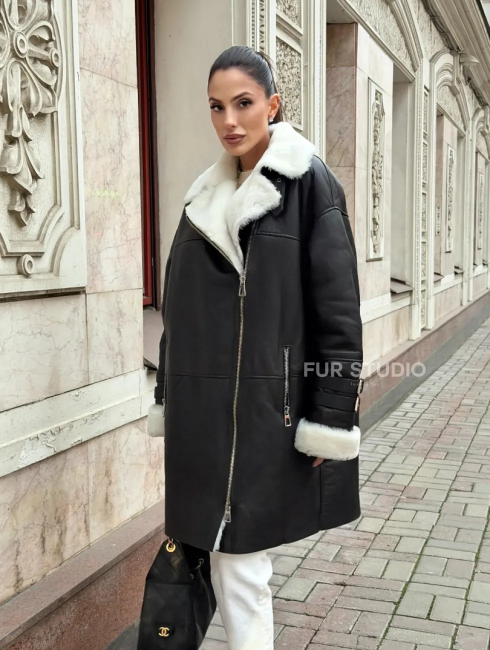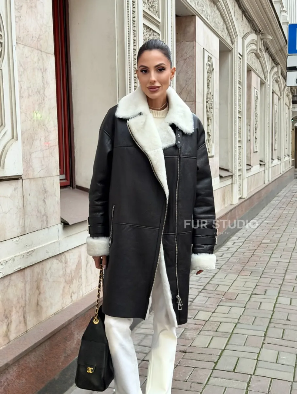 Дубленка авиатор длинная на белой овчине. Модель предлагается в размерах от 42 до 56. Оптимальная длина моделей 90-95 см подчеркивает линии вашей фигуры. Эта дубленка станет неотъемлемой частью гардероба для тех, кто предпочитает роскошь и утонченность натуральной кожи.