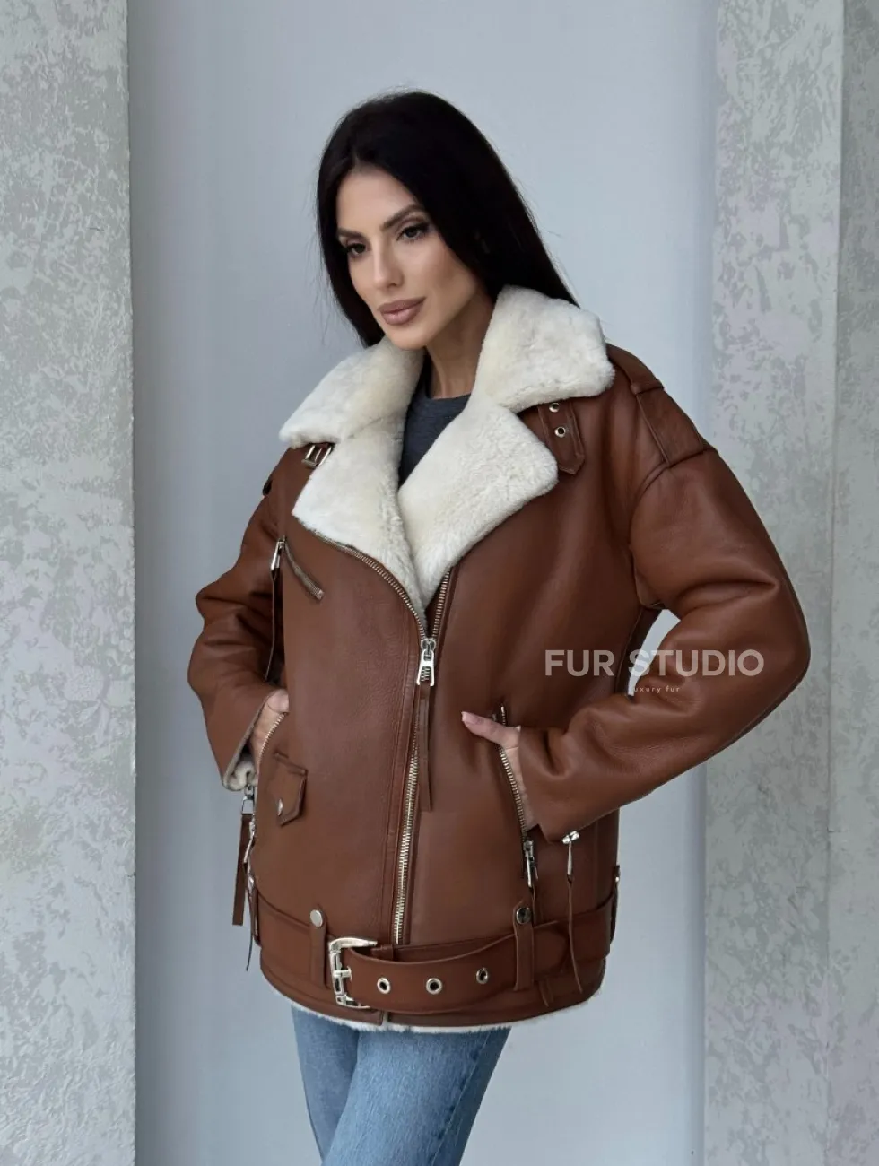 Дубленка авиатор из натуральной кожи в цвете виски – выбор современных девушек. Модель – тренд этого сезона. Мех овчины позаботится о комфортной температуре тела в прохладное время года. Необычный цвет виски подчеркнет оттенок волос и кожи владелицы. Качество изделия будет радовать хозяйку долгие годы.