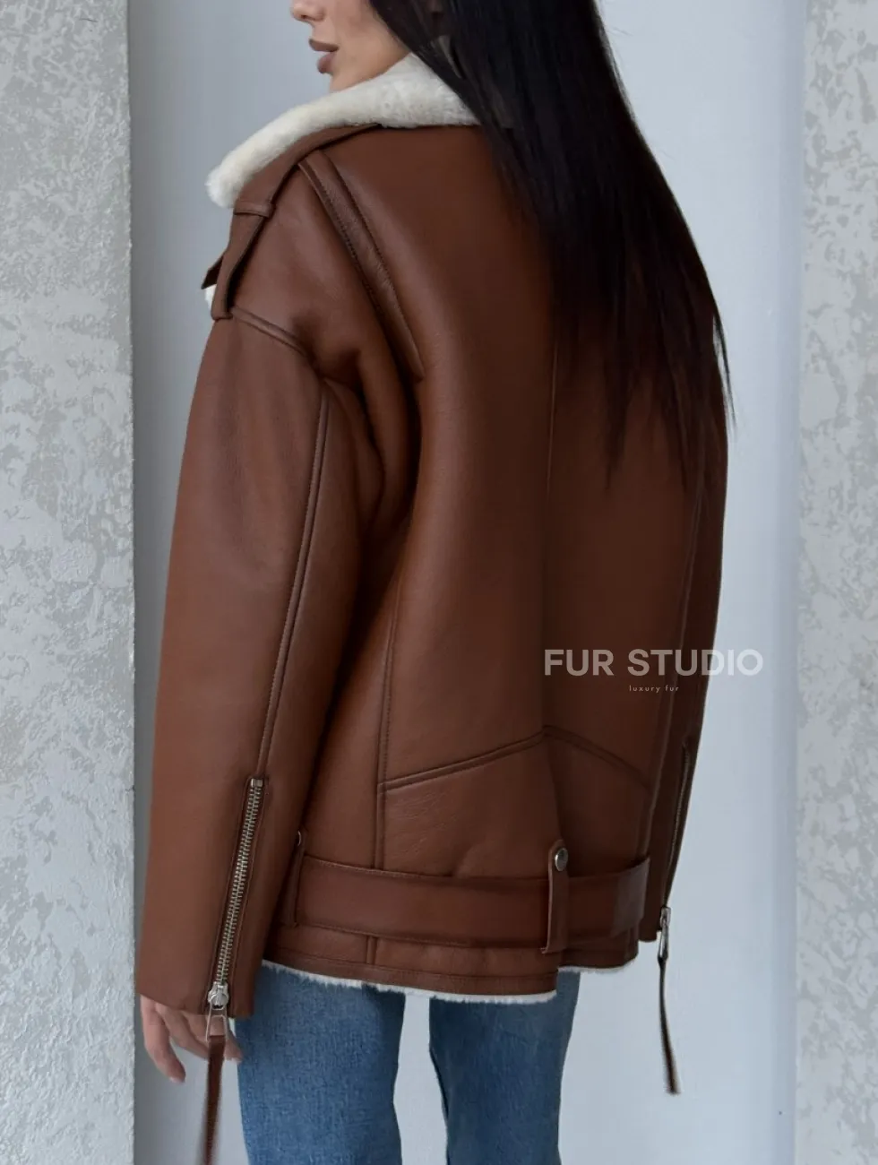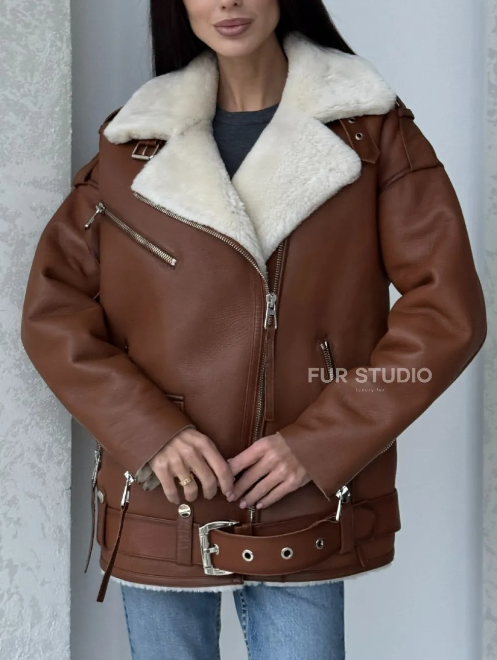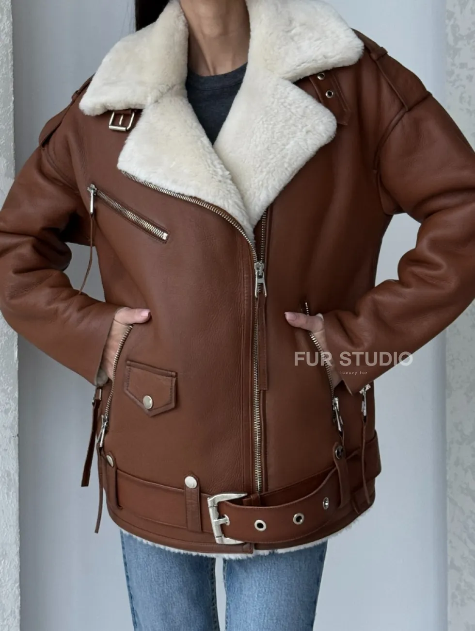 Оптимальная длина комфортна при носке. Прямой крой не сковывает движений, что удобно при вождении машины. Стильный пояс на бедрах добавляет нотку экстравагантности в образ. Модель сочетается с базовым гардеробом. Шикарный воротник не даст замерзнуть шее в непогоду. Фермуары на рукавах смотрятся оригинально. Купить дубленку авиатор из натуральной кожи в цвете виски могут женщины, которые любят выглядеть дерзко, но при этом изысканно.