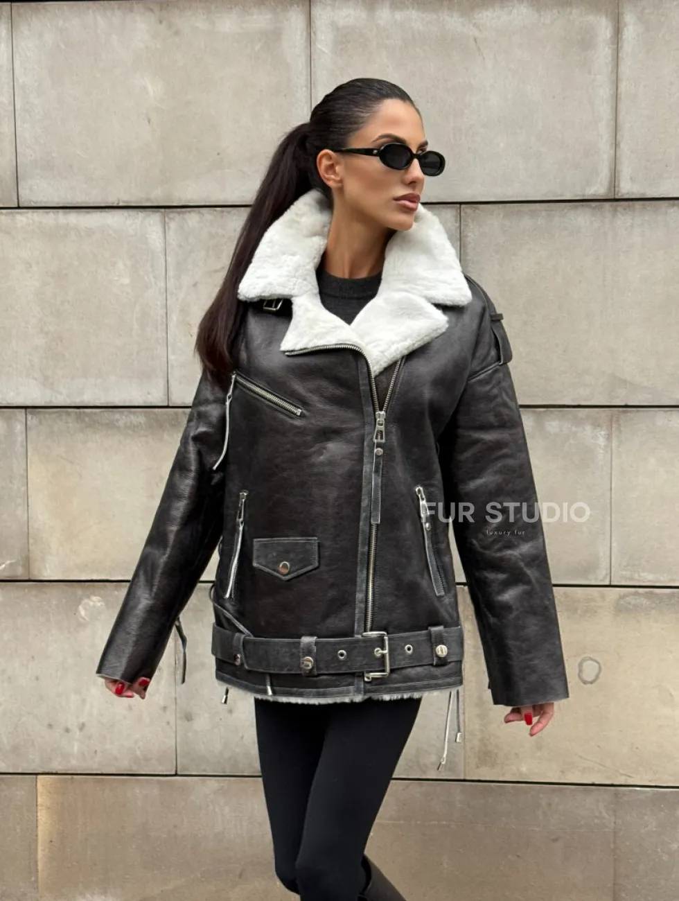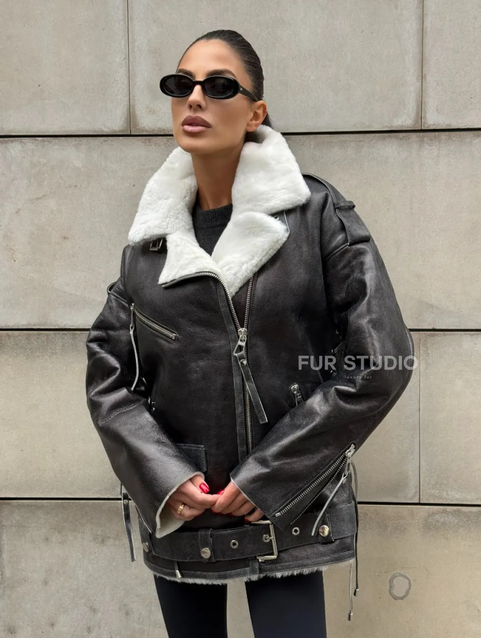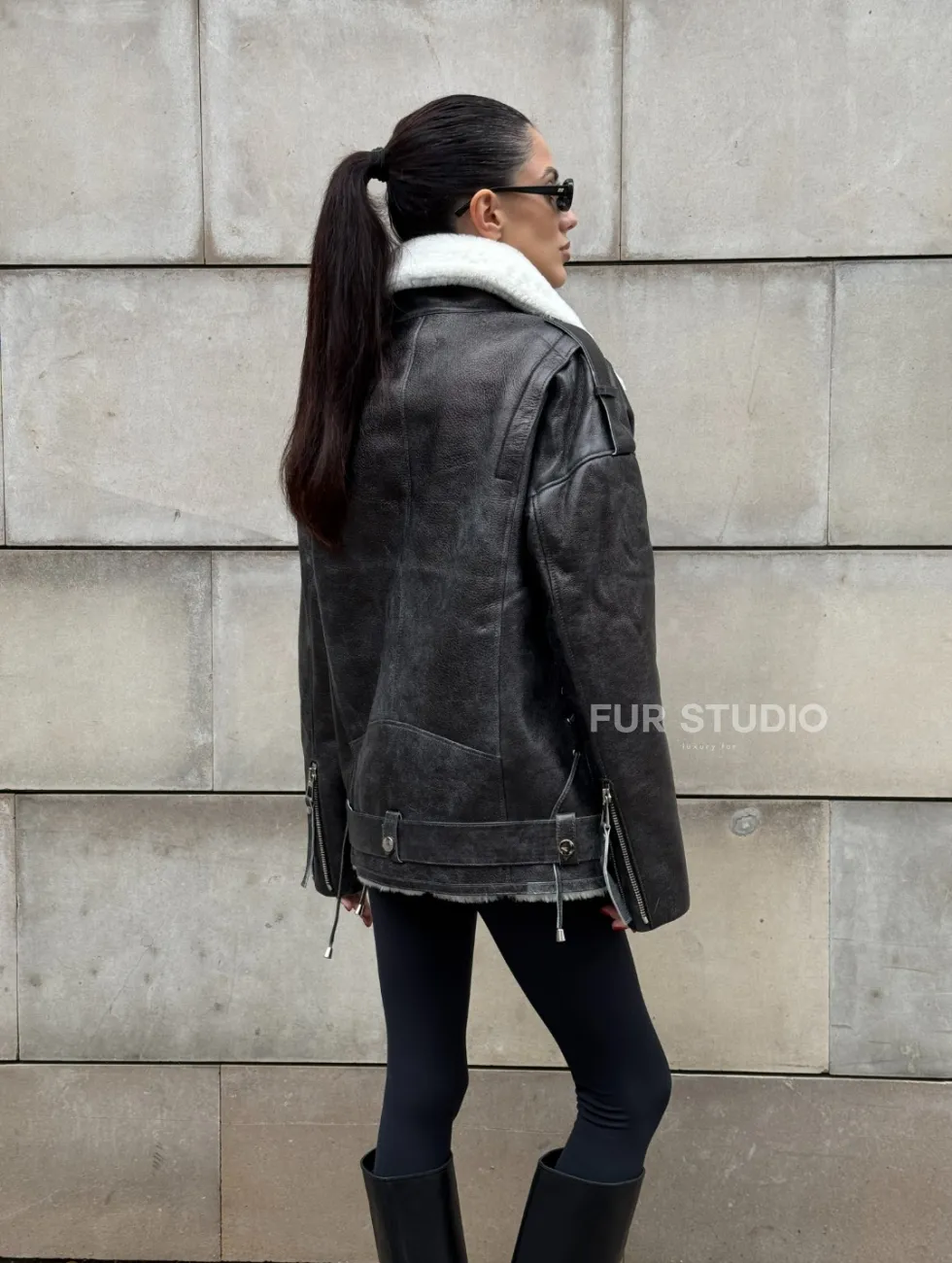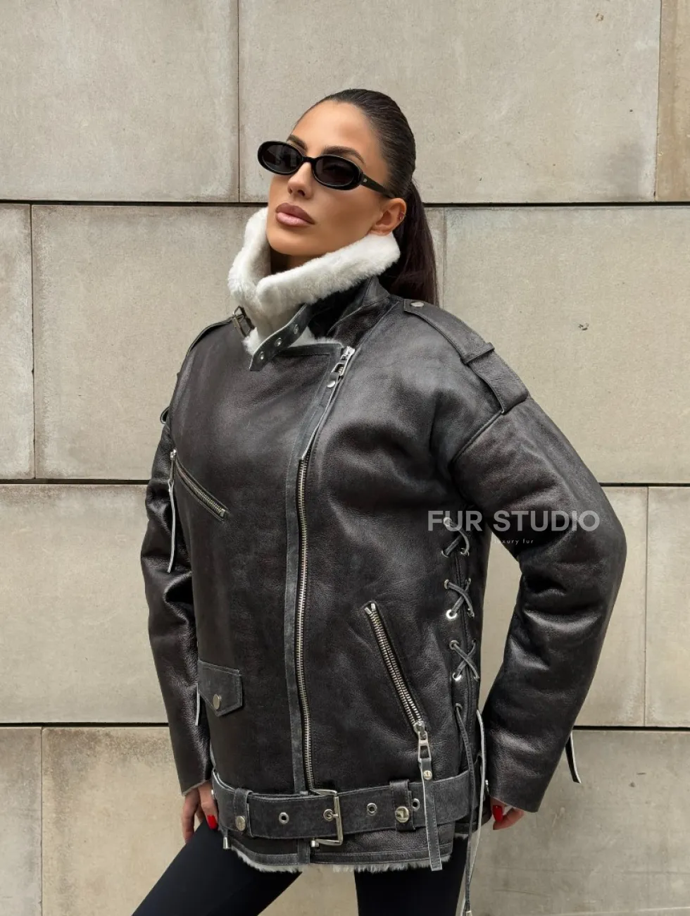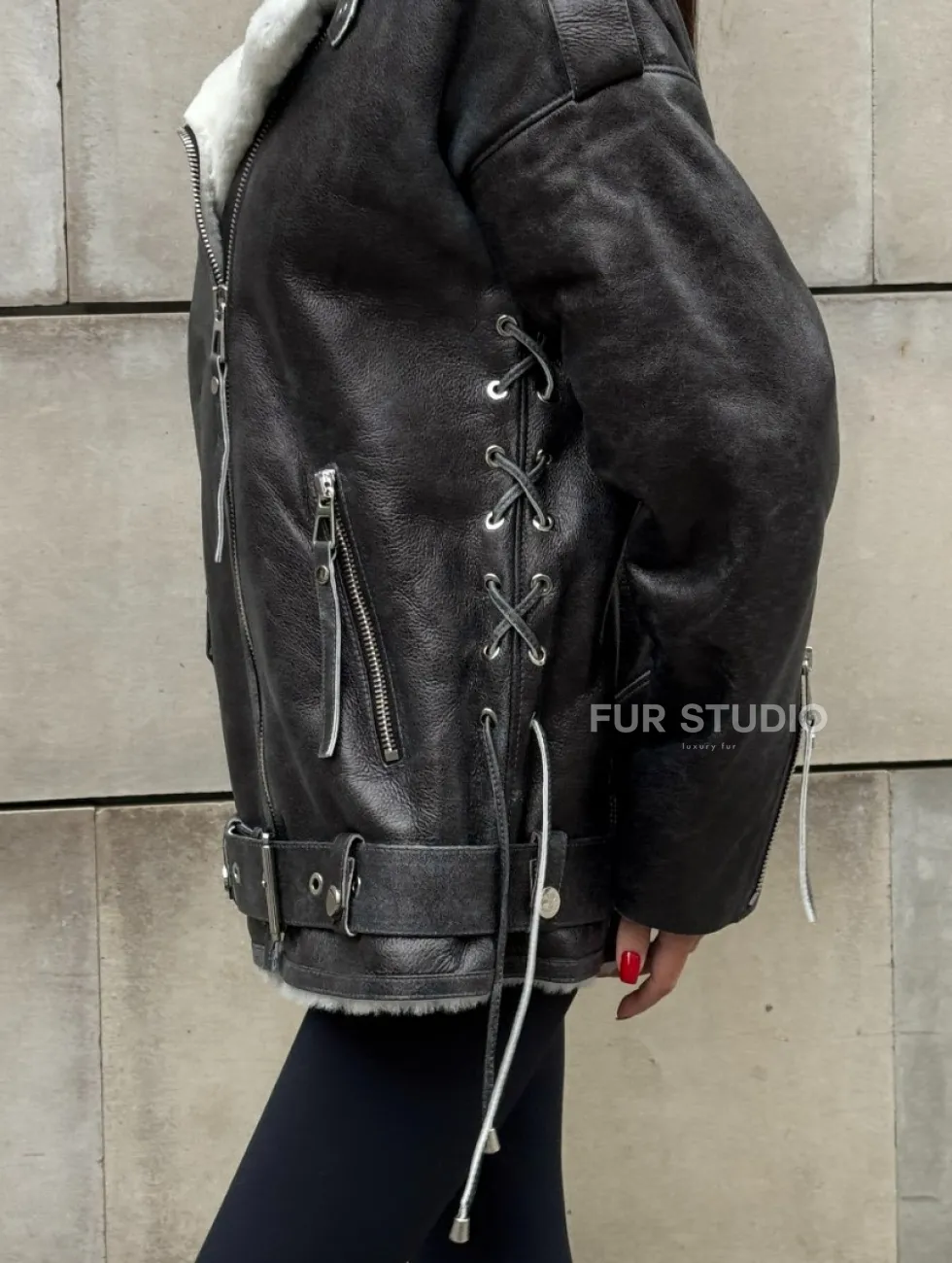 Дубленка-авиатор из натуральной овчины Dark Grey Vintage, со шнуровкой по боковому шву доступна для покупки в нашем шоуруме Furs Studio в Чите, а также предлагается удобная доставка во все города России. Обогатите свой гардероб этой дубленкой, которая прослужит вам многие годы, добавив немного роскоши в ваш повседневный образ.