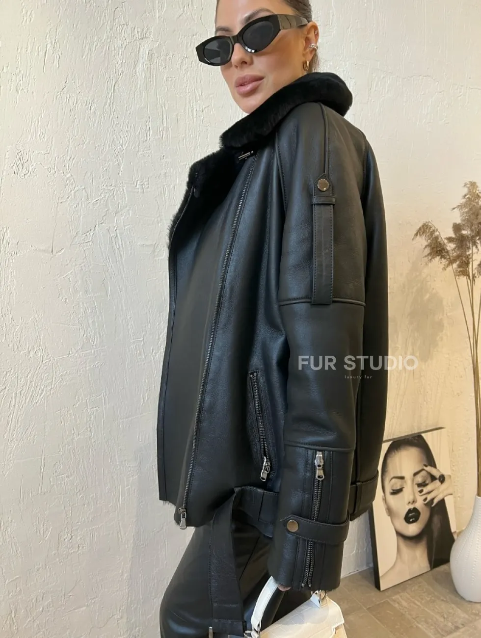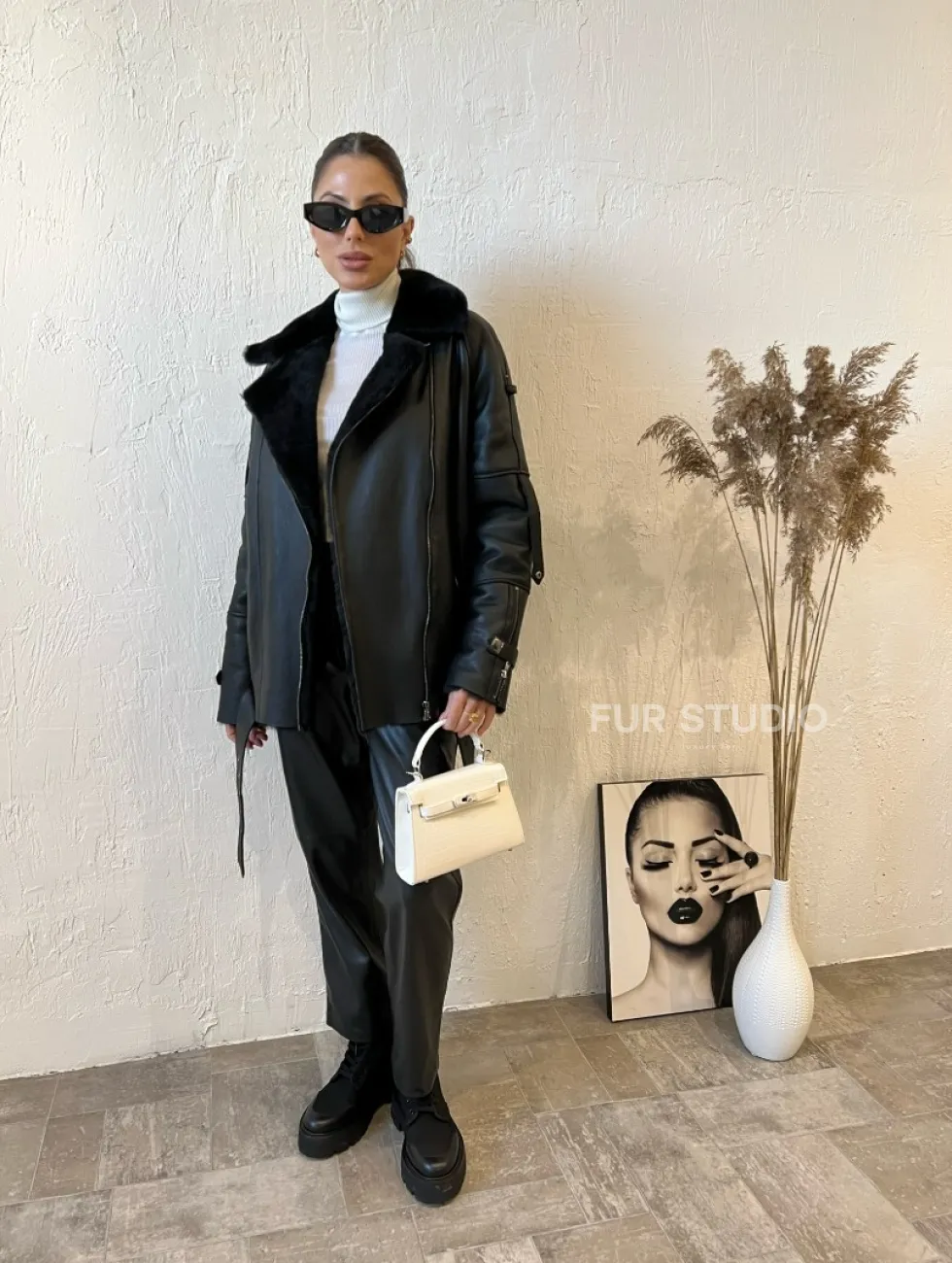 Необычный пояс по окантовке дубленки смотрится оригинально. Модель подойдет к базовому гардеробу, сочетается с джинсами и леггинсами. Если добавить к lookу грубые ботинки и кожаный рюкзак, то вы будете выглядеть, как с обложки. Купить дубленку авиатор в черном цвете из натуральной овчины могут дамы, которые разбираются в трендах и идут в ногу со временем.