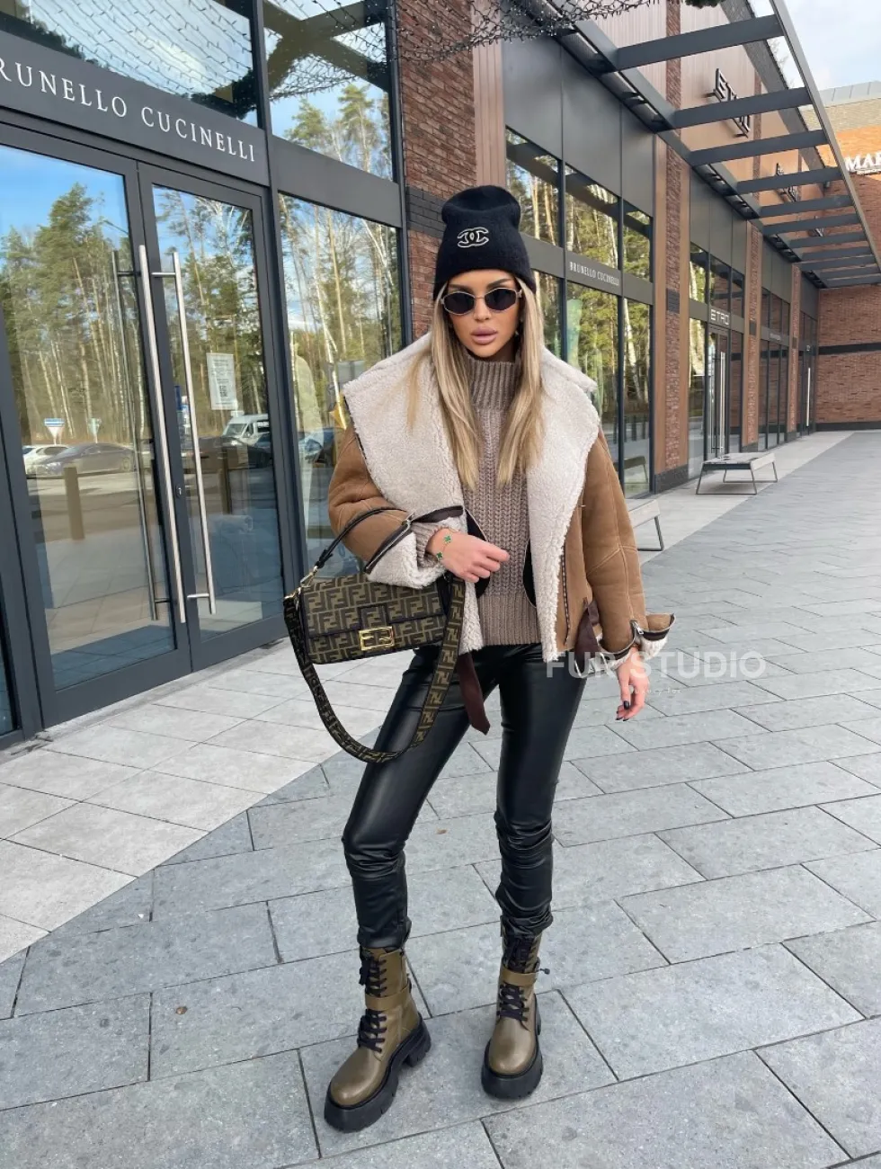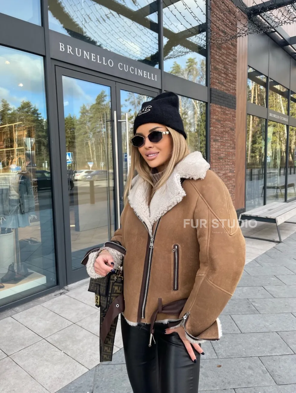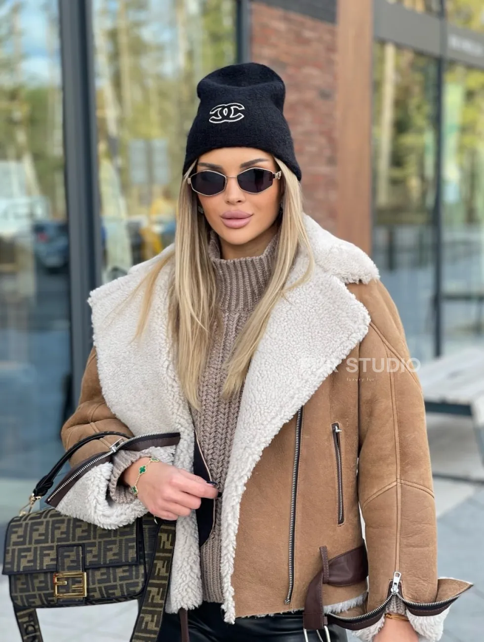 Удобный воротник позаботится о комфортной температуре шеи и подчеркнет ее изгибы. Благородная расцветка выгодно оттенит цвет глаз и волос владелицы. Оригинальный рюкзак и грубая, но стильная обувь будут гармонично сочетаться с образом. Купить дубленку – бомбер со спущенным плечом из натуральной овчины могут молодые девушки, которые хотят выглядеть стильно вне зависимости от времени года.