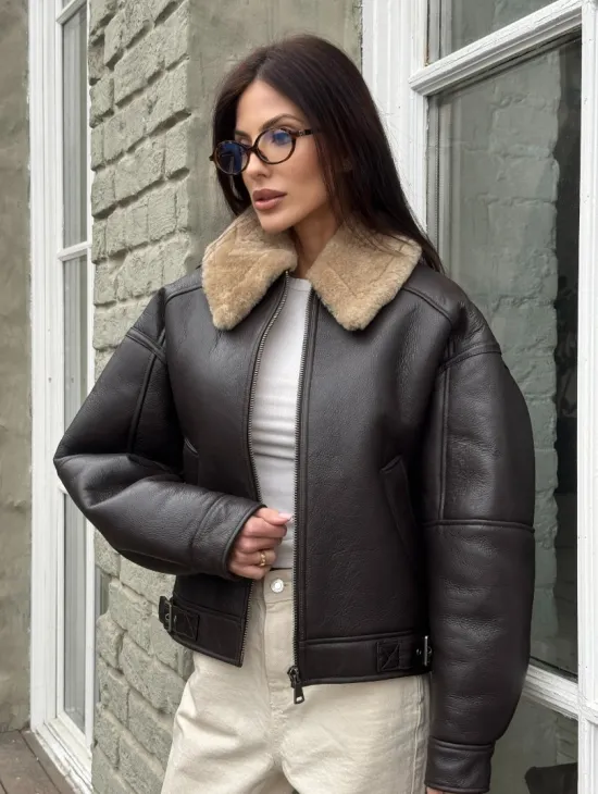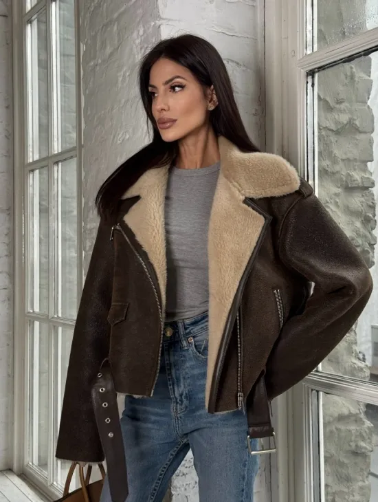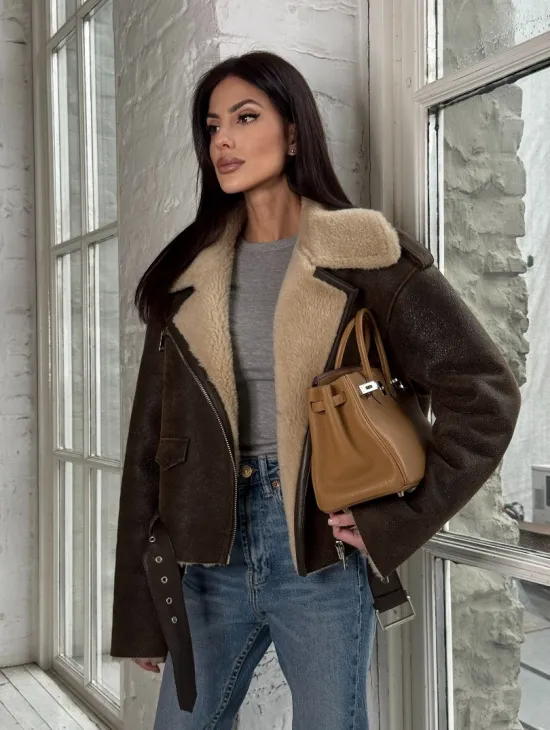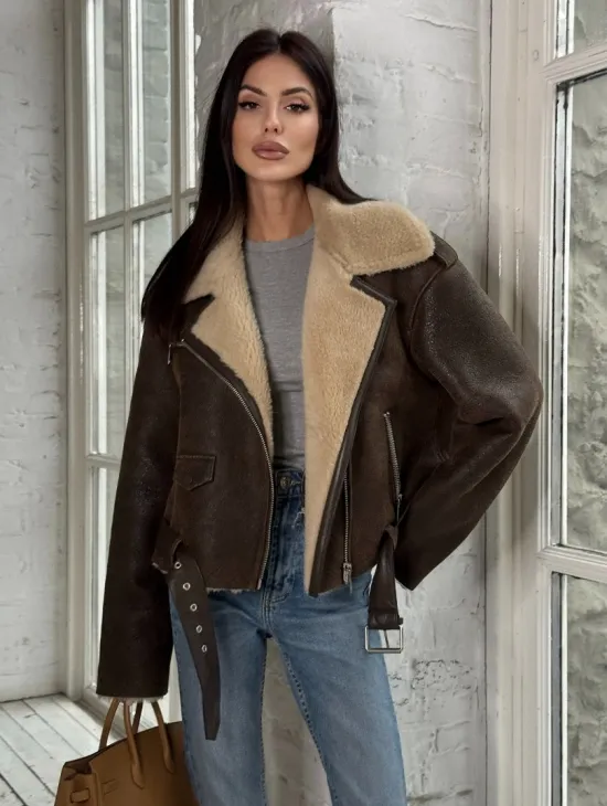 Женская короткая дубленка Brown vintage из натуральной овчины кёрли