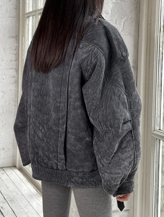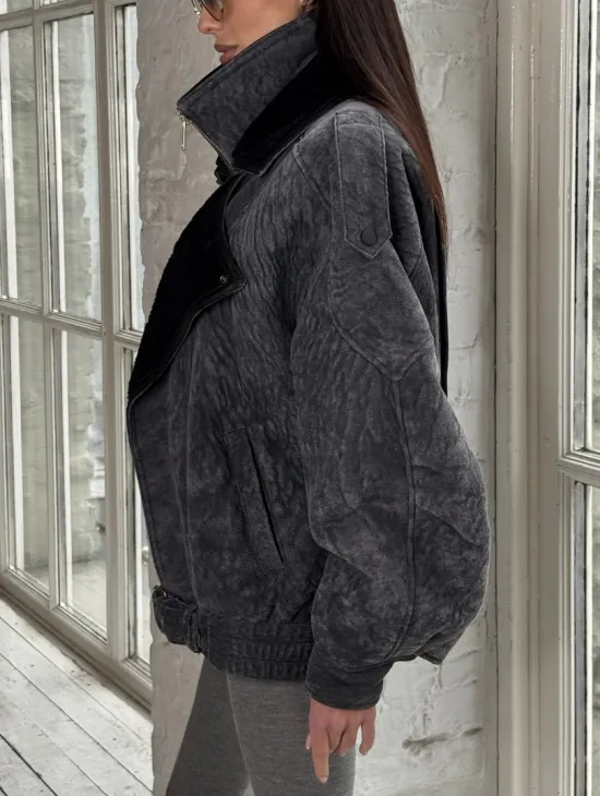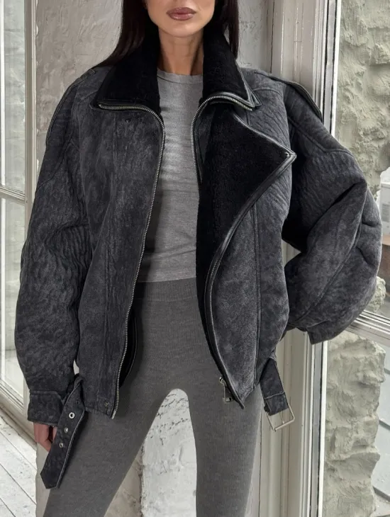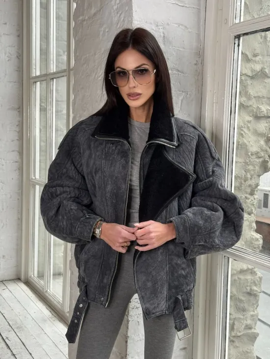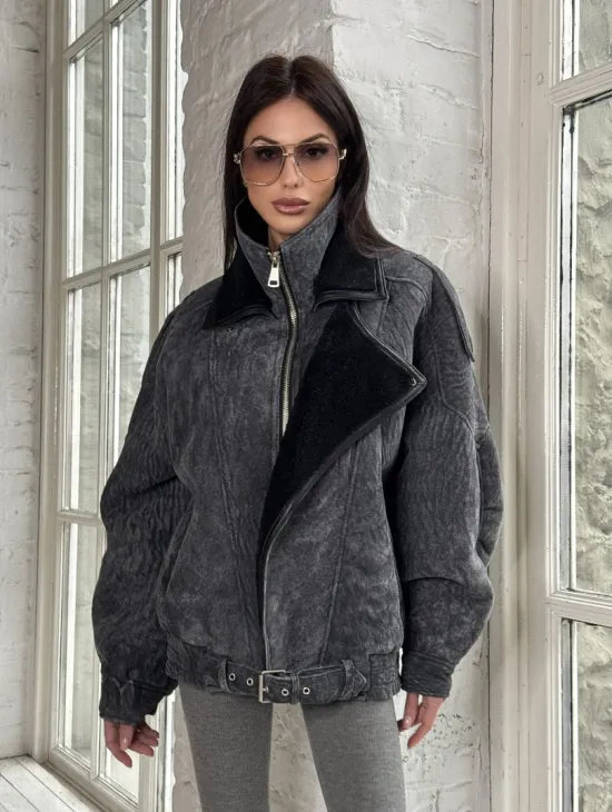 Дубленка - косуха из овчины керли "Vintage grey" с двойным воротником