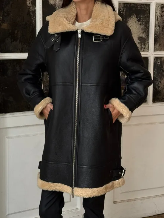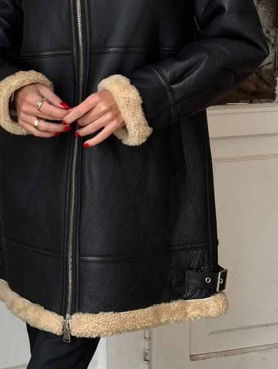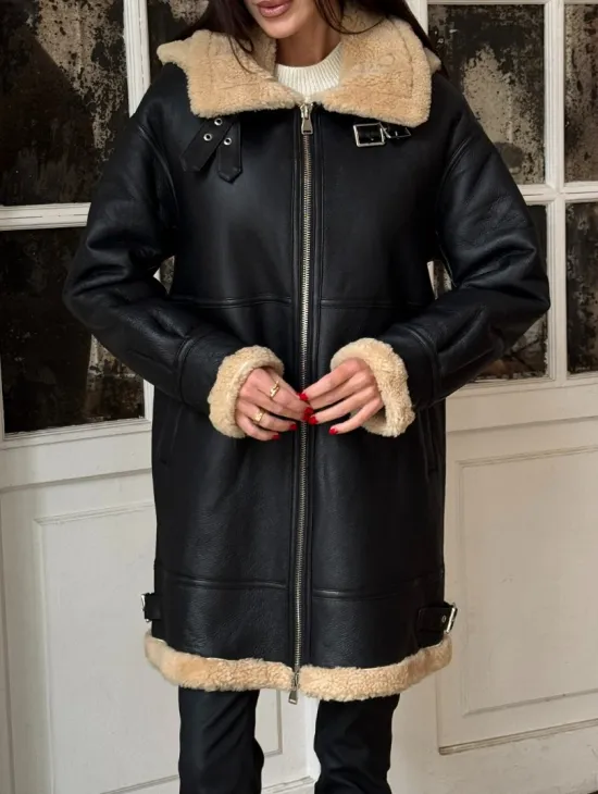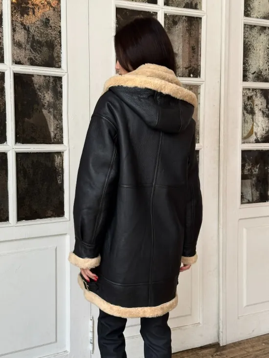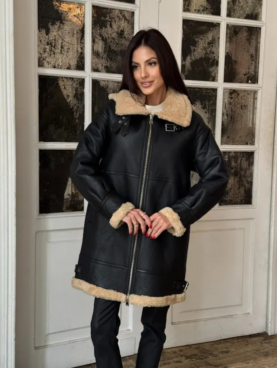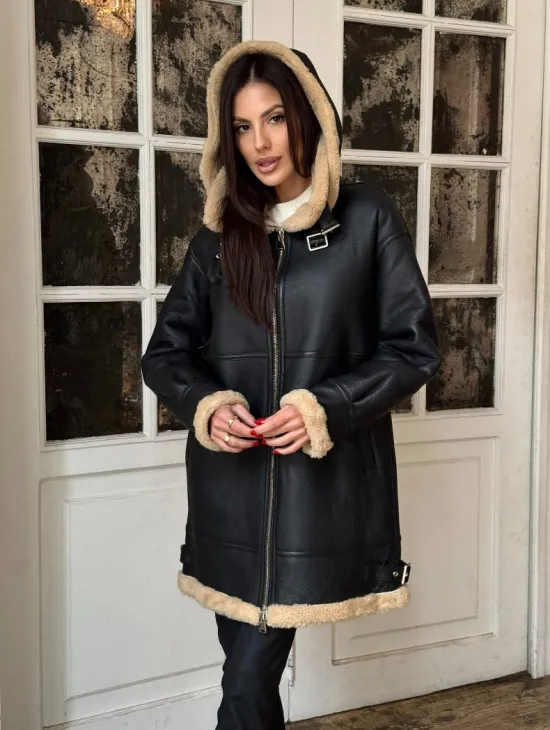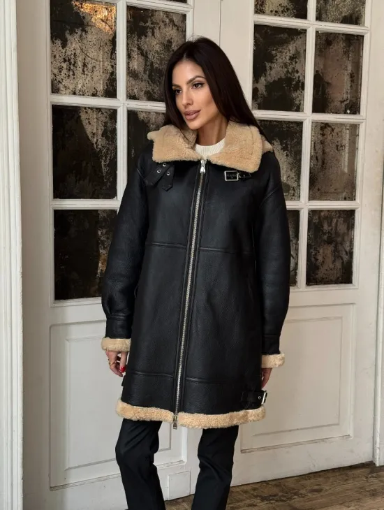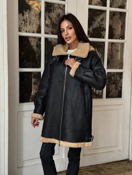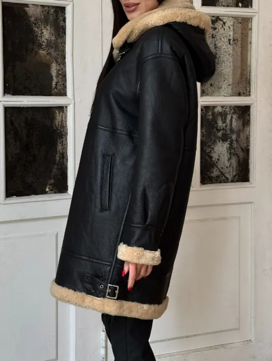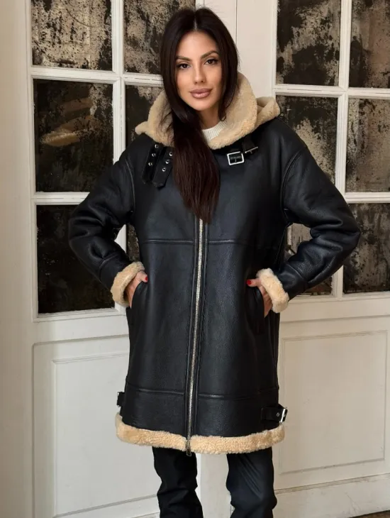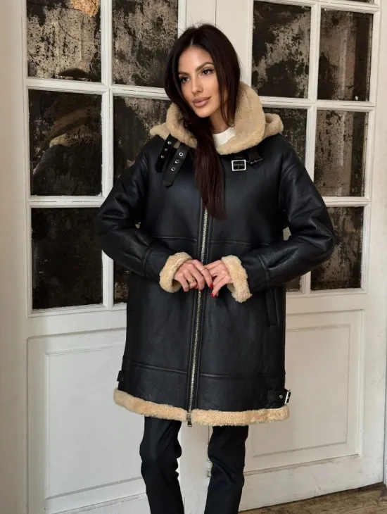 Женская удлиненная дубленка авиатор с отстегивающимся капюшоном