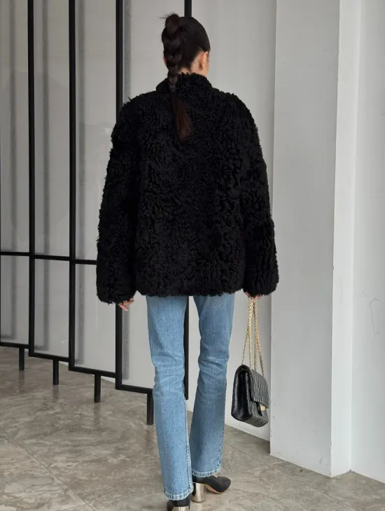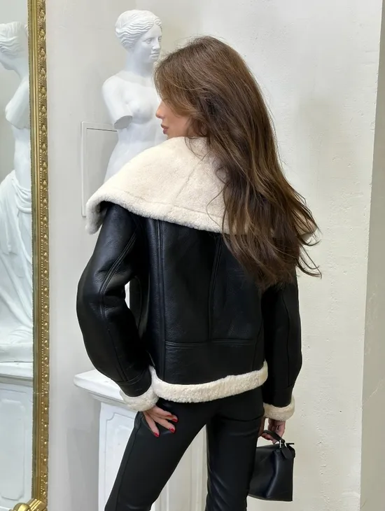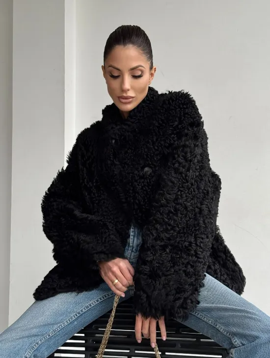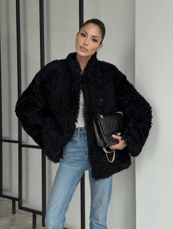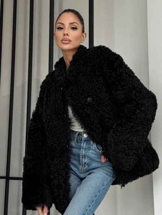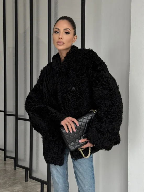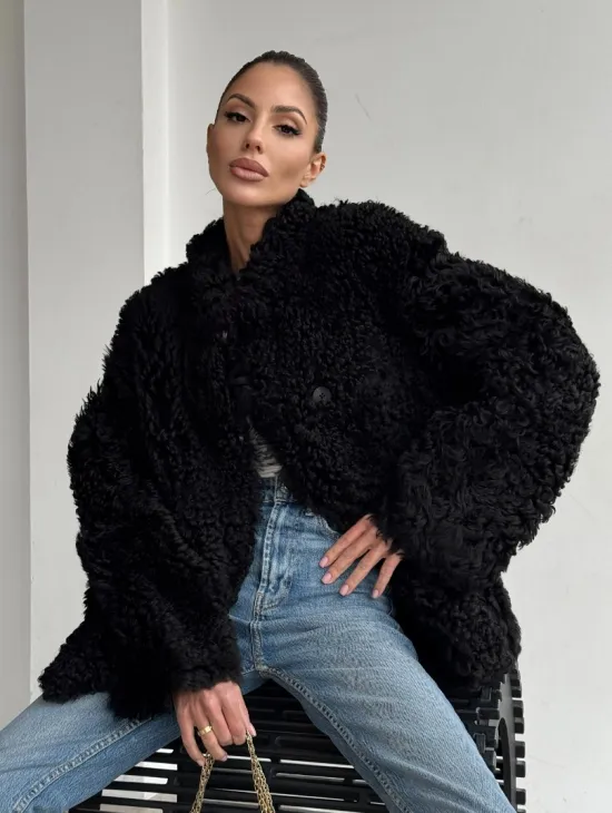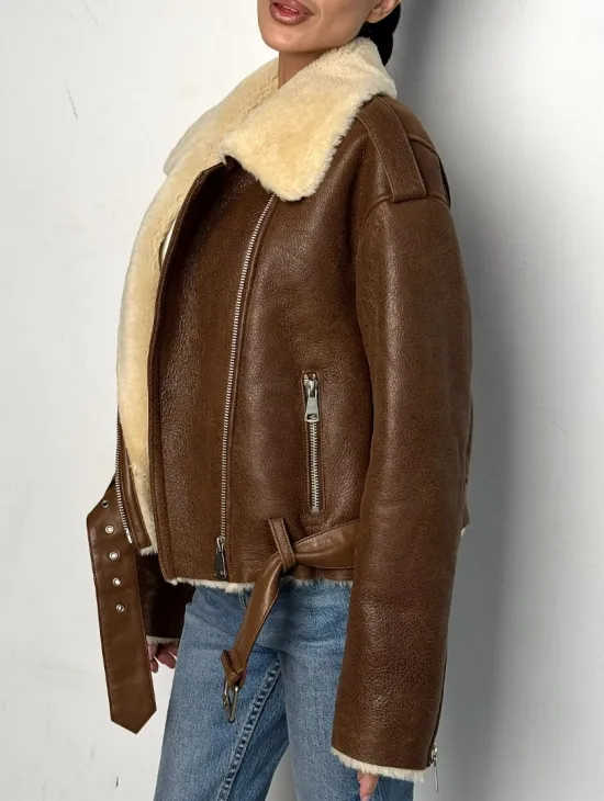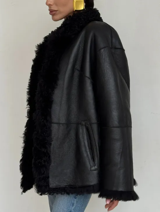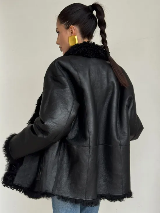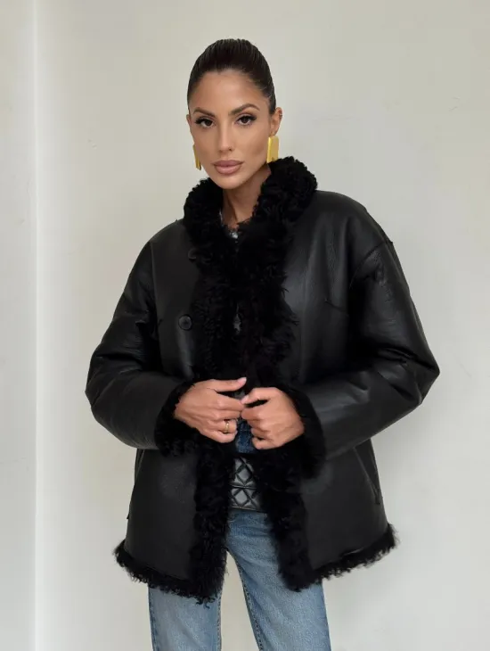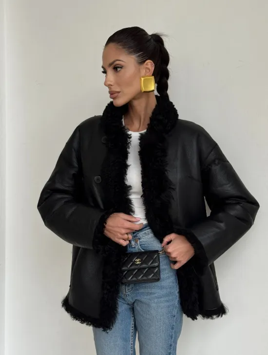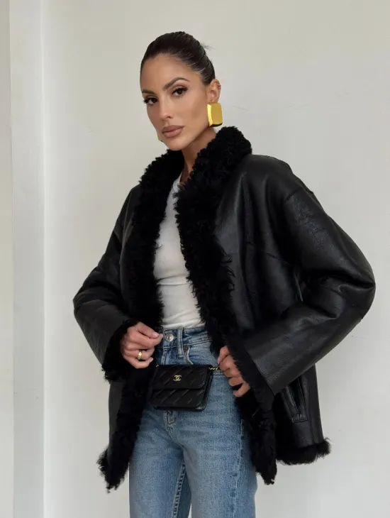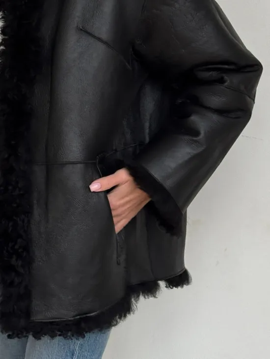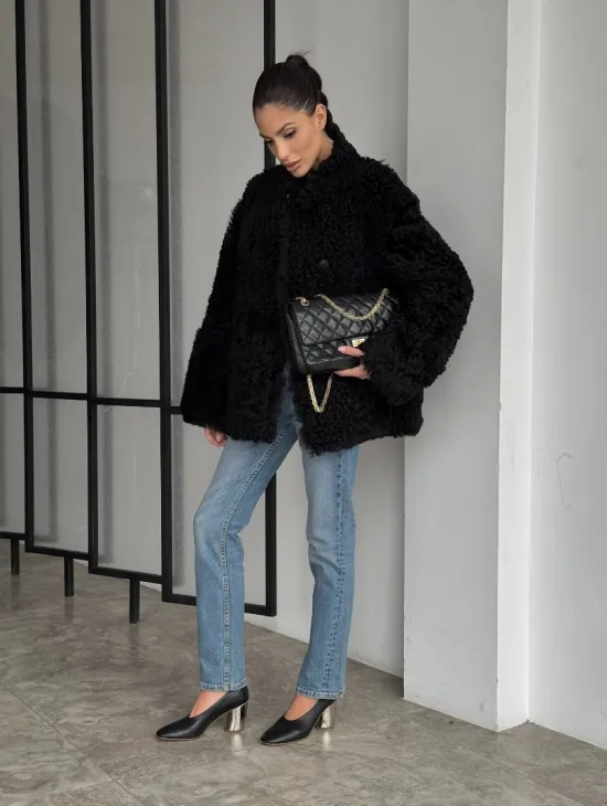 Черная куртка - дубленка из натуральной овчины на запах с поясом