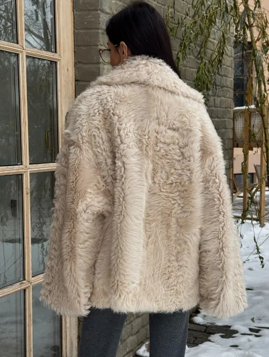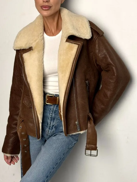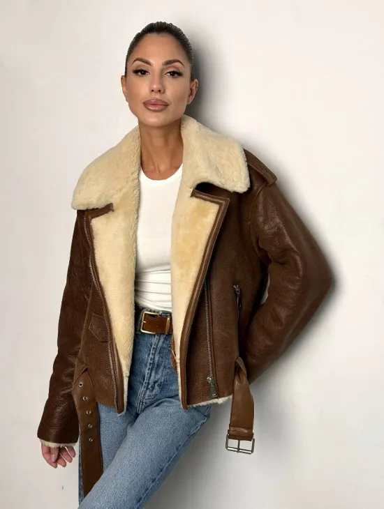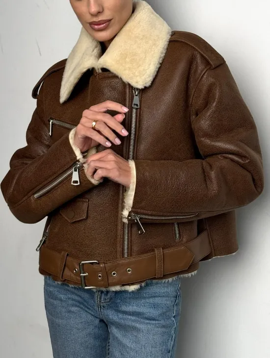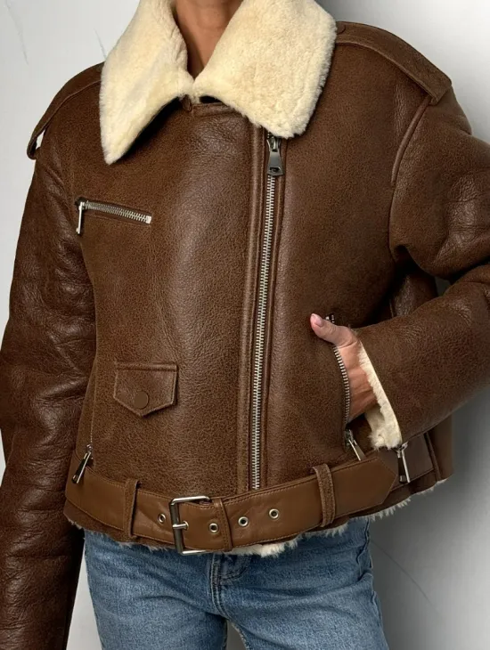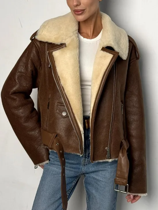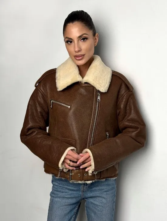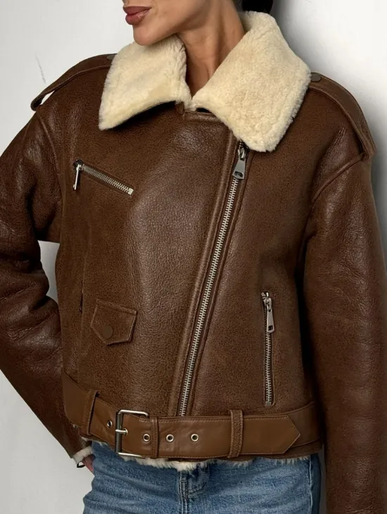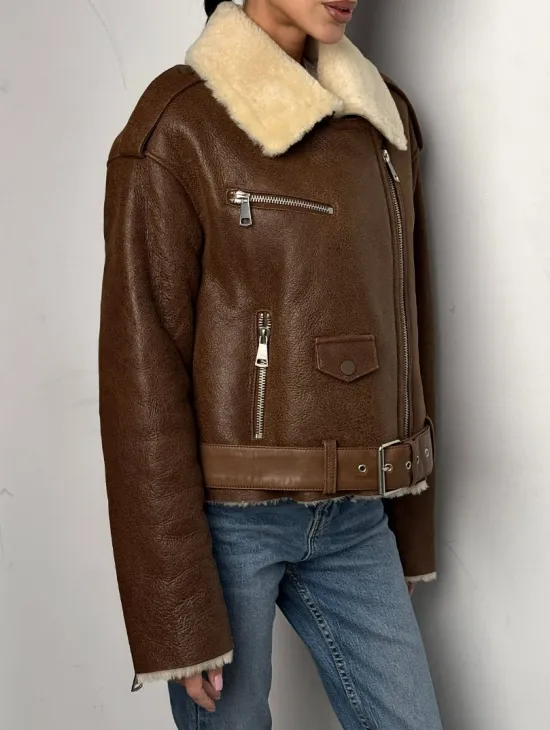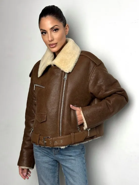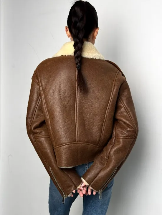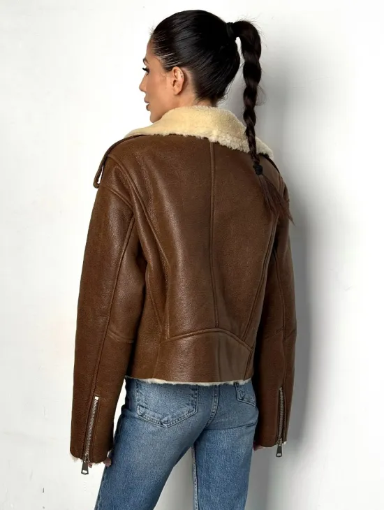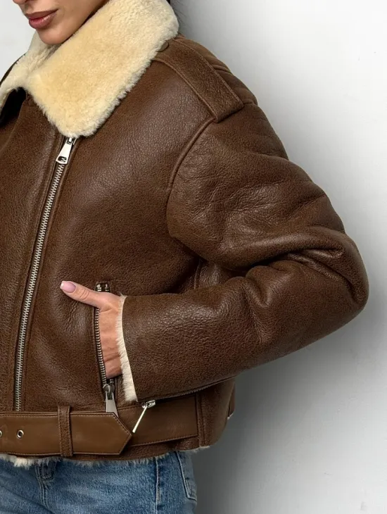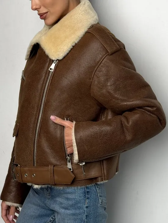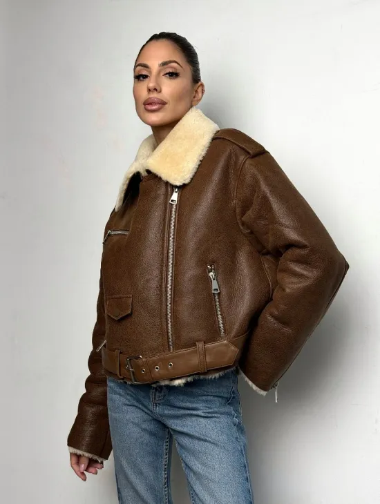 Короткая женская куртка - дубленка из натуральной кожи и мехом тосканы внутри, капюшон