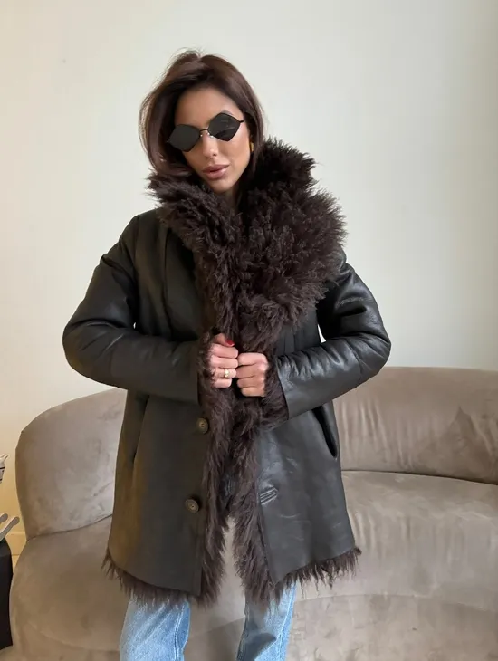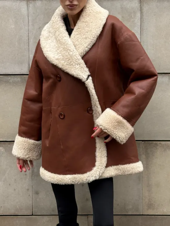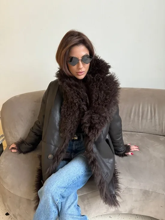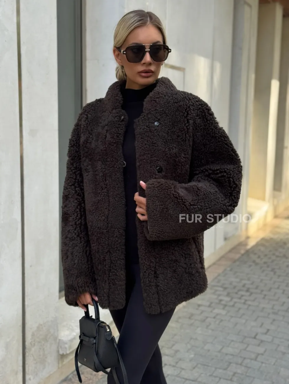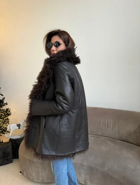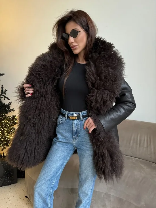 Двусторонняя коричневая дубленка из овчины. Модель предлагается в размерах от 42 до 44 от 46. Оптимальная длина моделей 55-60 см подчеркивает линии вашей фигуры. Эта дубленка станет неотъемлемой частью гардероба для тех, кто предпочитает роскошь и утонченность натуральной кожи.