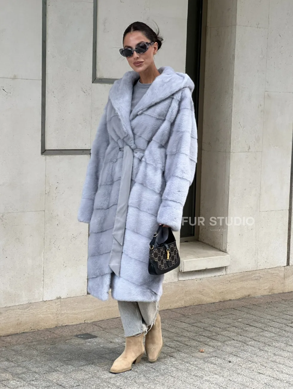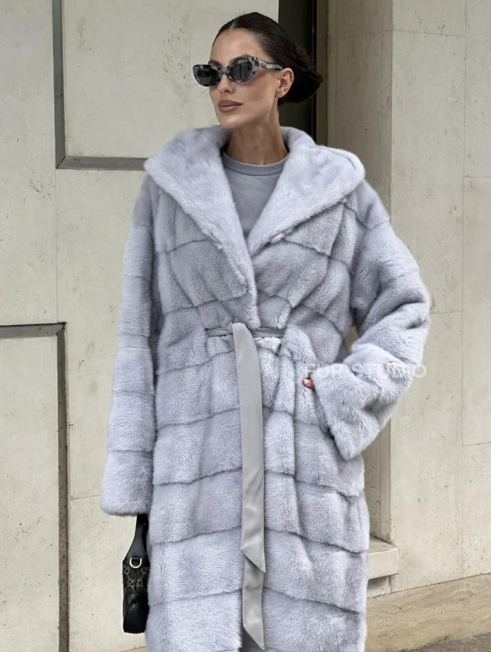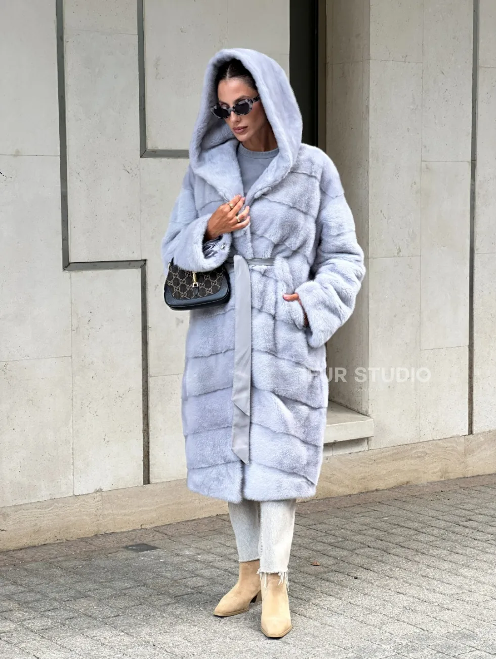 Эффектное пальто - шуба с капюшоном из меха голубой норки доступна для покупки в нашем шоуруме Furs Studio в Чите. У нас так же есть доставка во все города России. Добавьте немного роскоши в свой гардероб с этой шубой, которая будет служить вам многие годы.