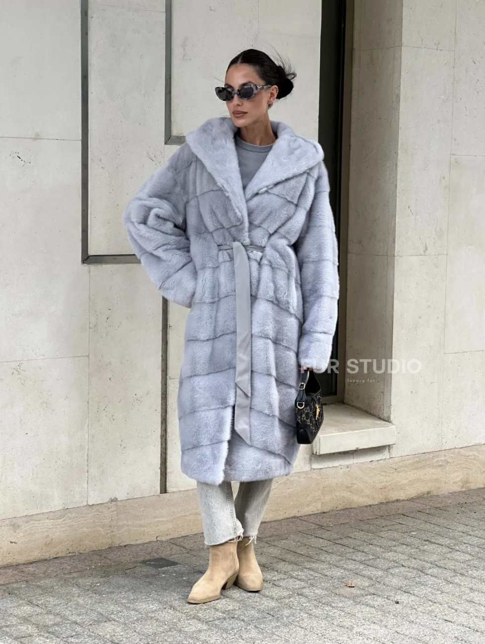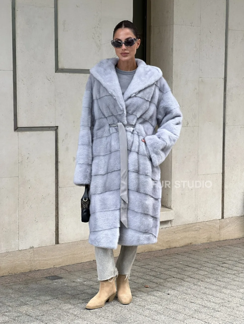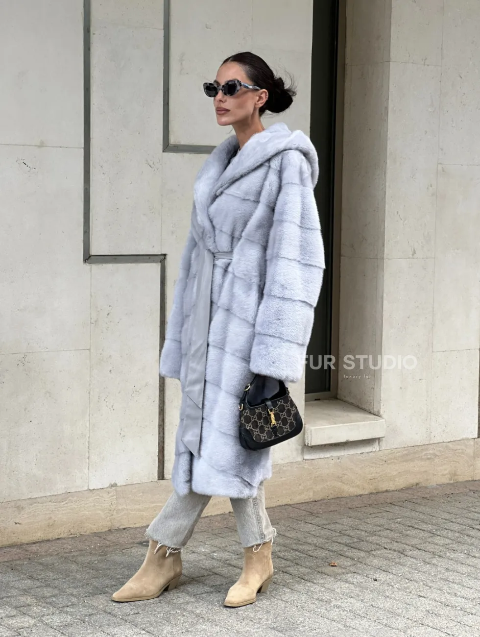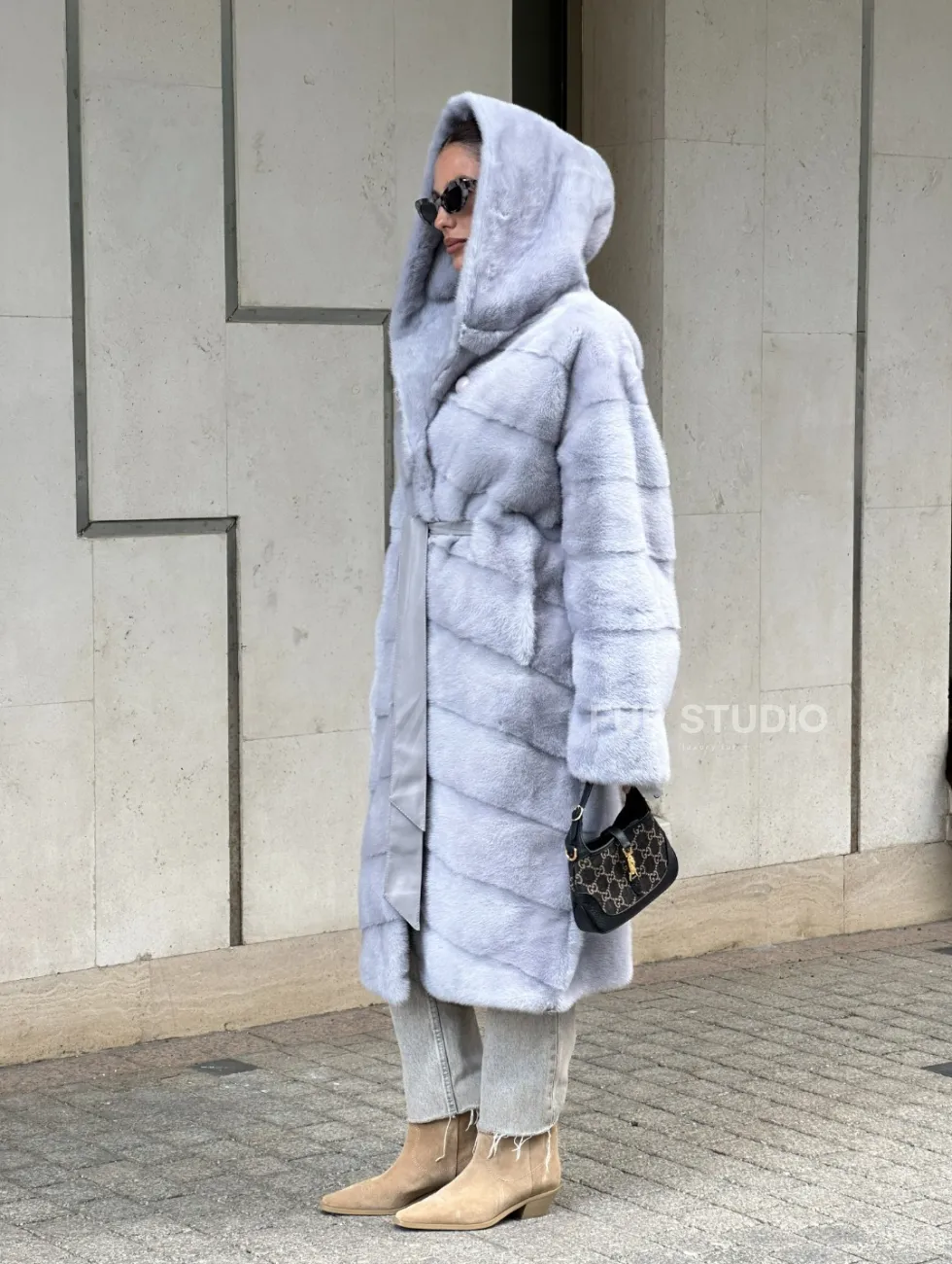 Эффектное пальто - шуба с капюшоном из меха голубой норки доступна для покупки в нашем шоуруме Furs Studio в Чите. У нас так же есть доставка во все города России. Добавьте немного роскоши в свой гардероб с этой шубой, которая будет служить вам многие годы.