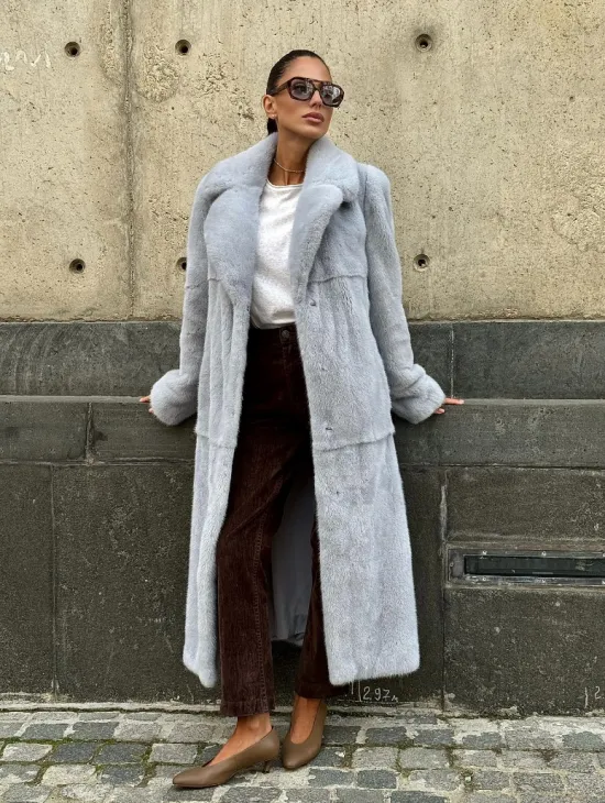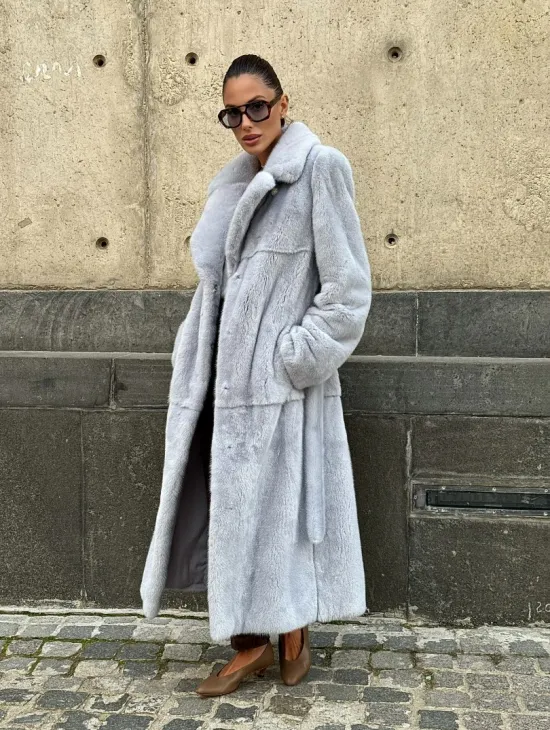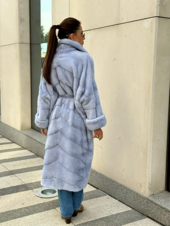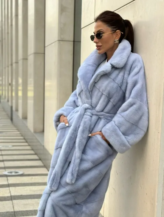 Мех данной шубы аукционная норка , цвет голубой. Предлагается в размерах от 42 до 52 (инд.пошив от 54 до 68). Длина модели 65-70 см, что выгодно подчеркивает фигуру девушек. Эта модель идеально подойдет для девушек и женщин, предпочитающих роскошные натуральные меха.