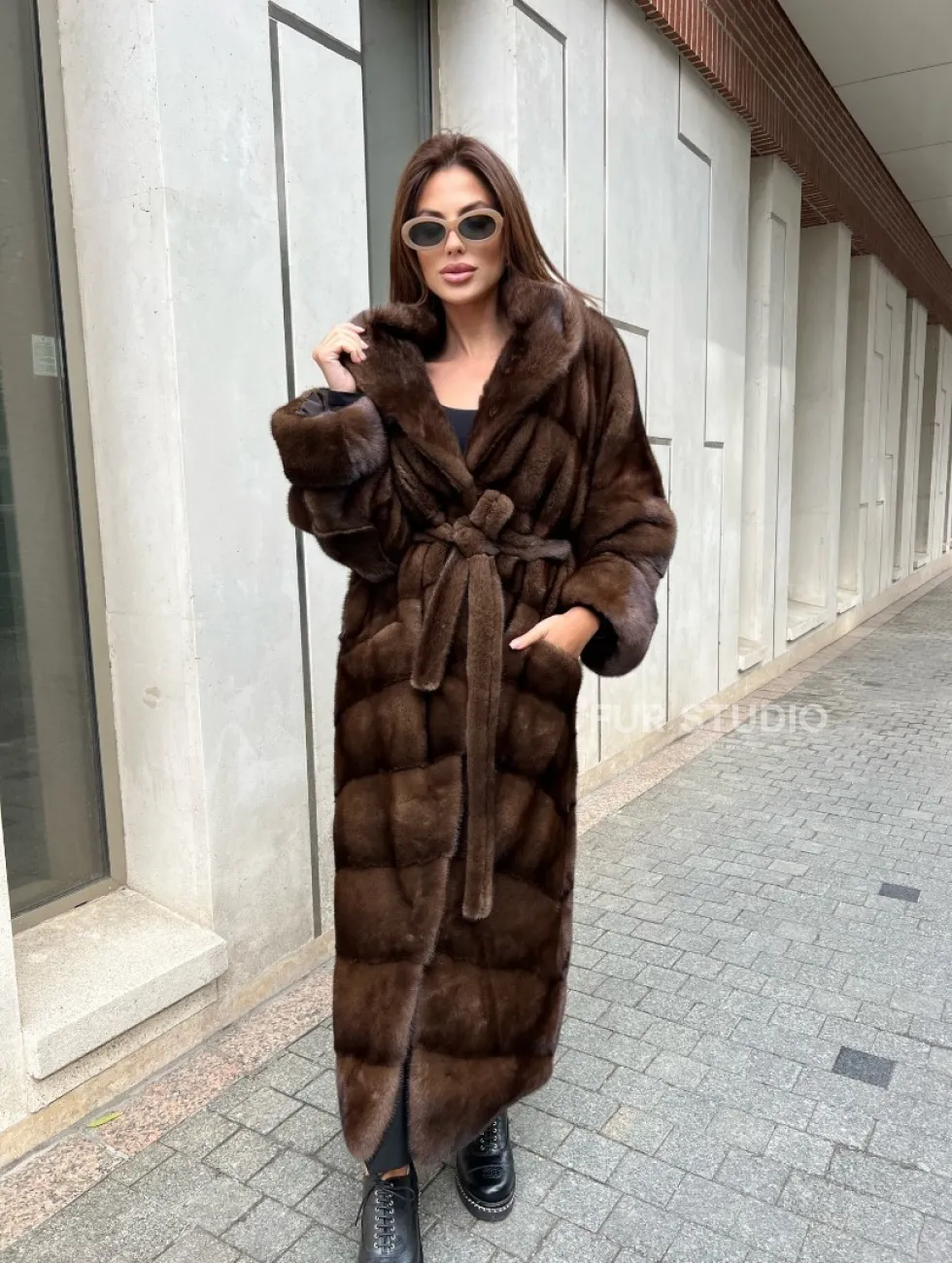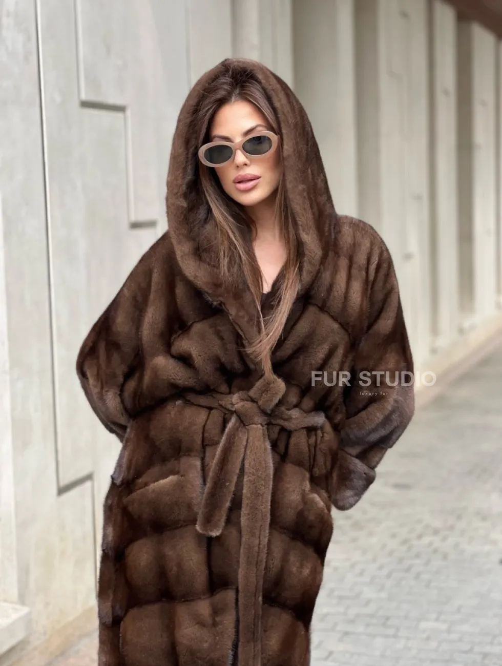 Пояс подчеркнет изящество силуэта. Изделие не сковывает движение. Носить шубу вы будете долго и с удовольствием. Купить элитную норковую шубу в цвете соболь с капюшоном могут только женщины, которые ценят свой комфорт и при этом выглядят как королевы.