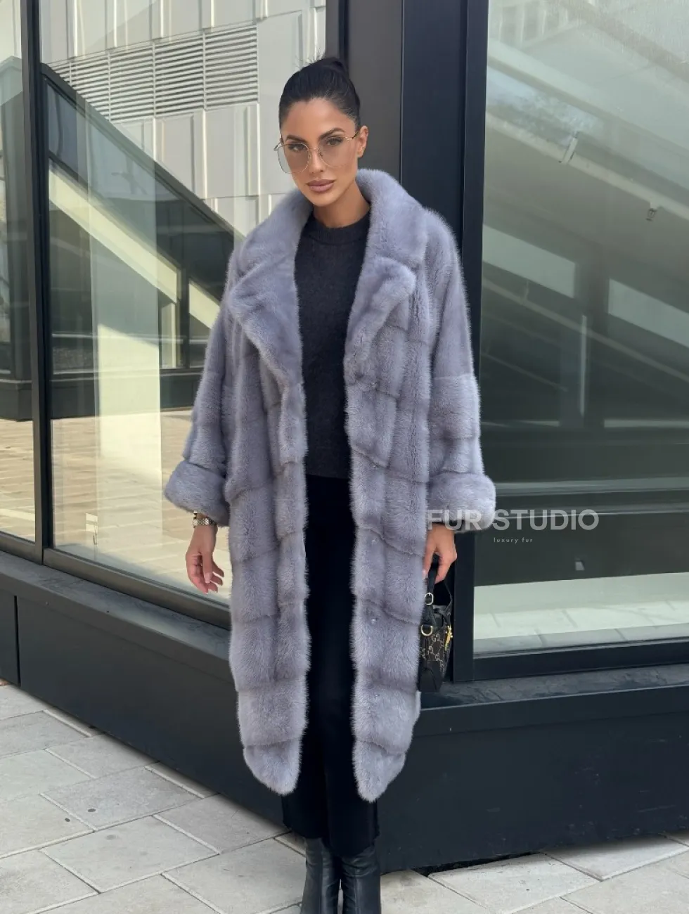 Мех данной шубы аукционная норка, цвет голубой. Предлагается в размерах от 40 до 50 с 52. Длина модели 105-110 см, что выгодно подчеркивает фигуру девушек. Эта модель идеально подойдет для девушек и женщин, предпочитающих роскошные натуральные меха.