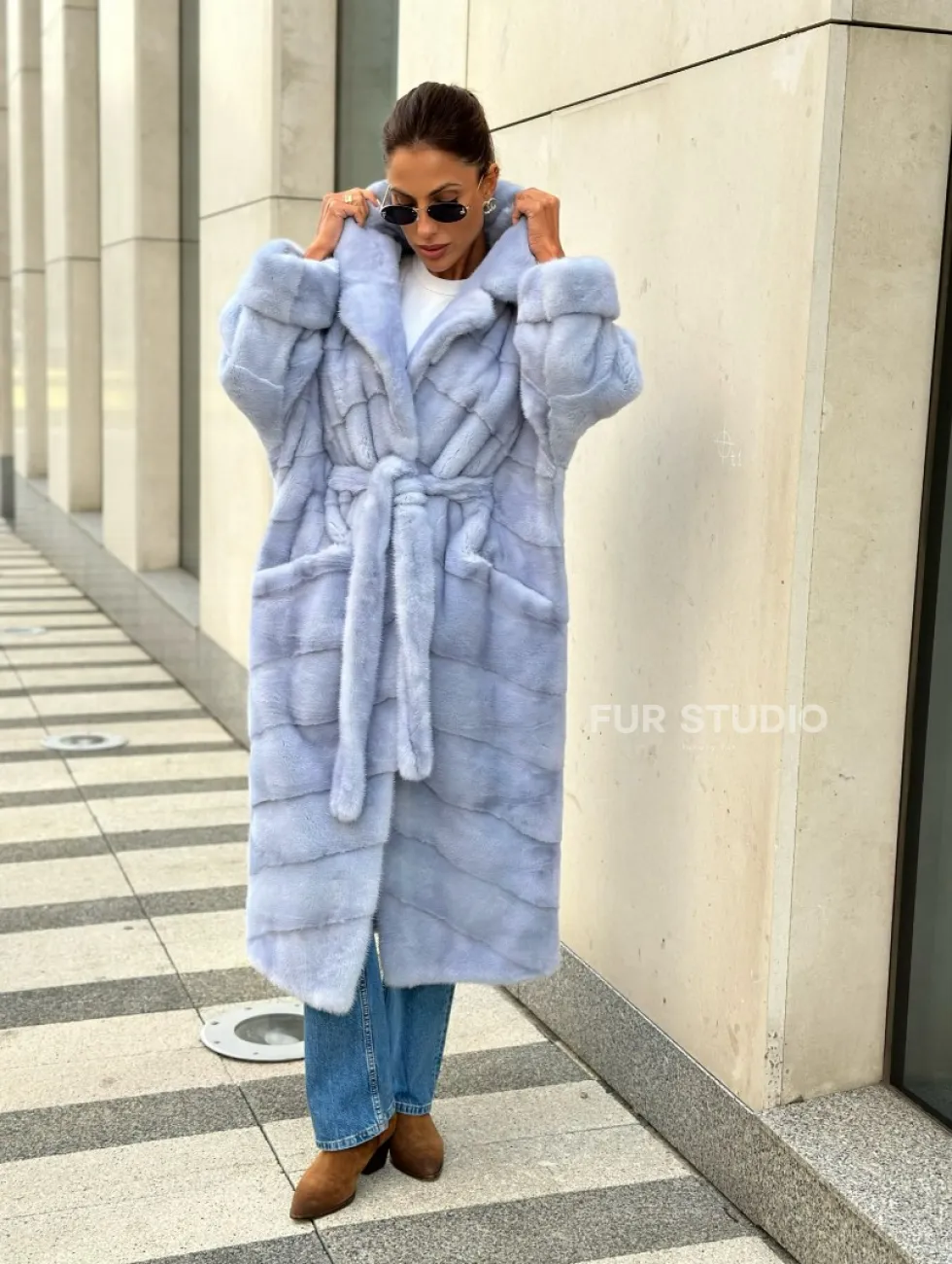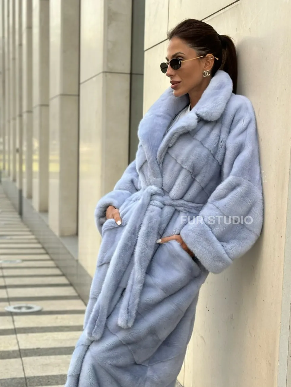Голубая шуба из плюшевой норки, английский воротник доступна для покупки в нашем шоуруме Furs Studio в Чите. У нас так же есть доставка во все города России. Добавьте немного роскоши в свой гардероб с этой шубой, которая будет служить вам многие годы.