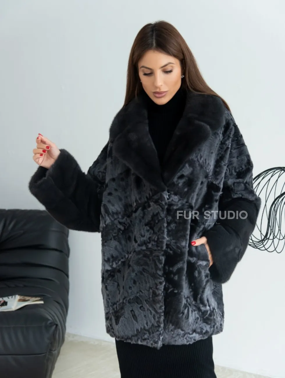 Графит полушубок из каракульчи с отделкой из меха норки доступна для покупки в нашем шоуруме Furs Studio в Чите. У нас так же есть доставка во все города России. Добавьте немного роскоши в свой гардероб с этой шубой, которая будет служить вам многие годы.