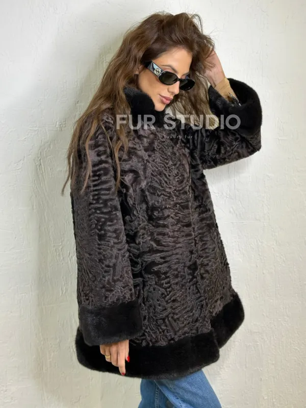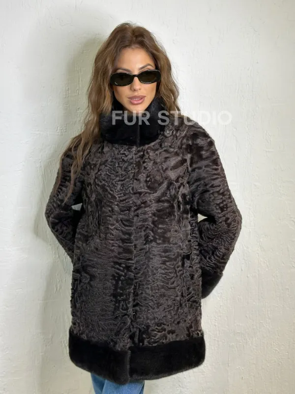 Каракульча стойка воротник отделка норка доступна для покупки в нашем шоуруме Furs Studio в Чите. У нас так же есть доставка во все города России. Добавьте немного роскоши в свой гардероб с этой шубой, которая будет служить вам многие годы.