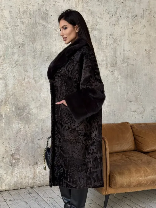 Мех данной шубы каракульча, цвет коричневый. Предлагается в размерах от 44 до 50 с 52. Длина модели 70-75 см, что выгодно подчеркивает фигуру девушек. Эта модель идеально подойдет для девушек и женщин, предпочитающих роскошные натуральные меха.
