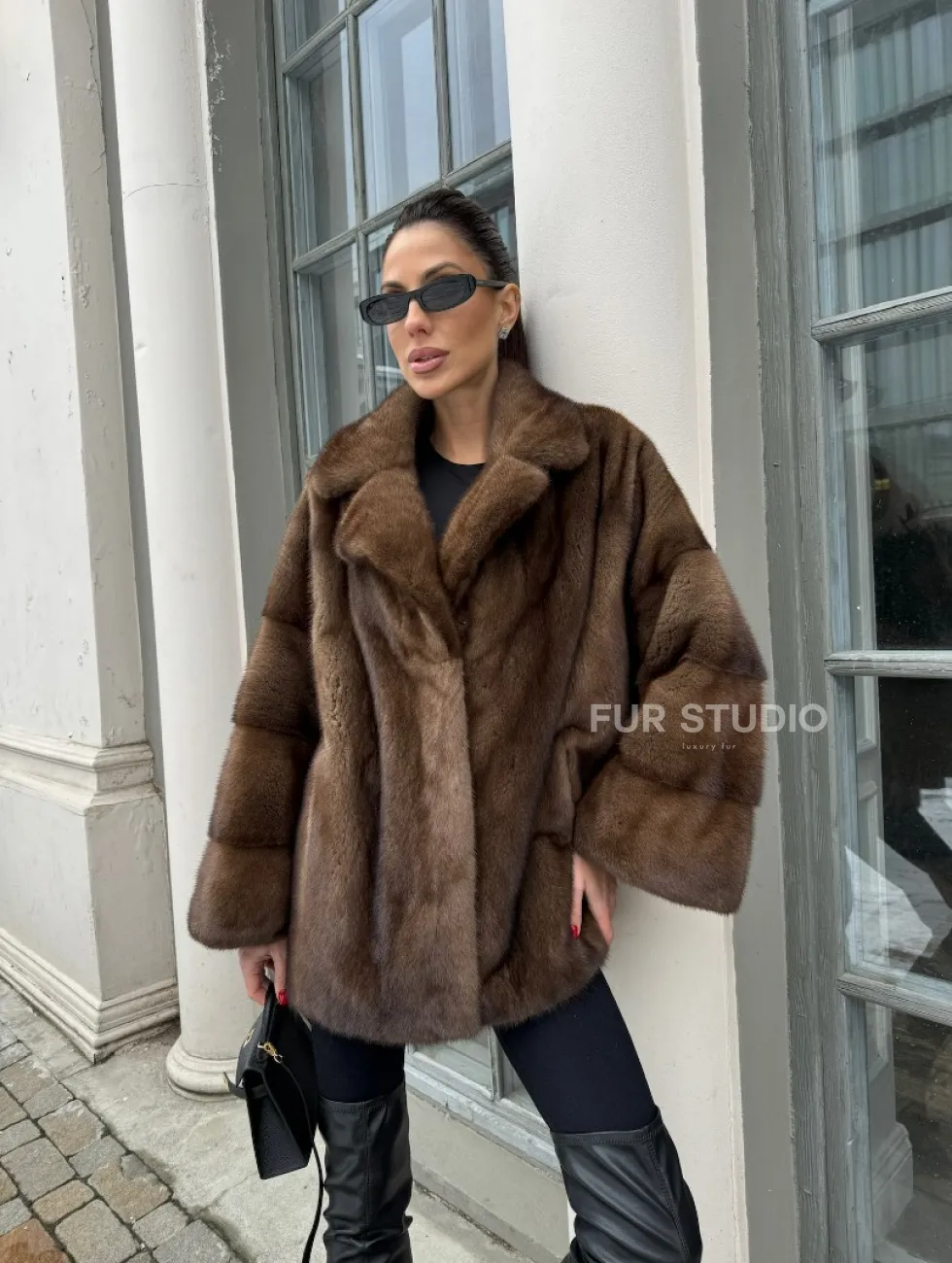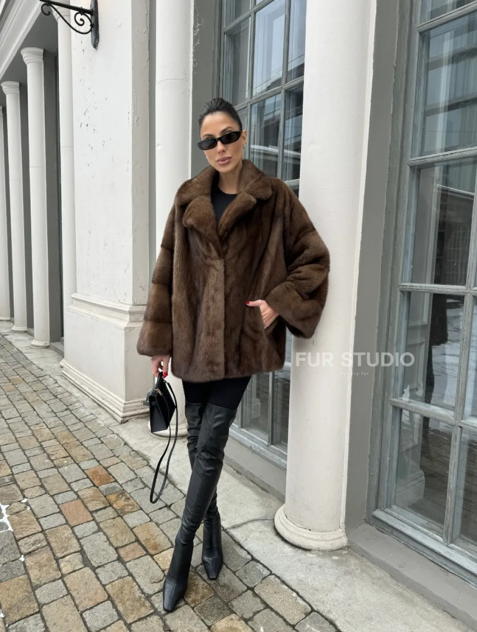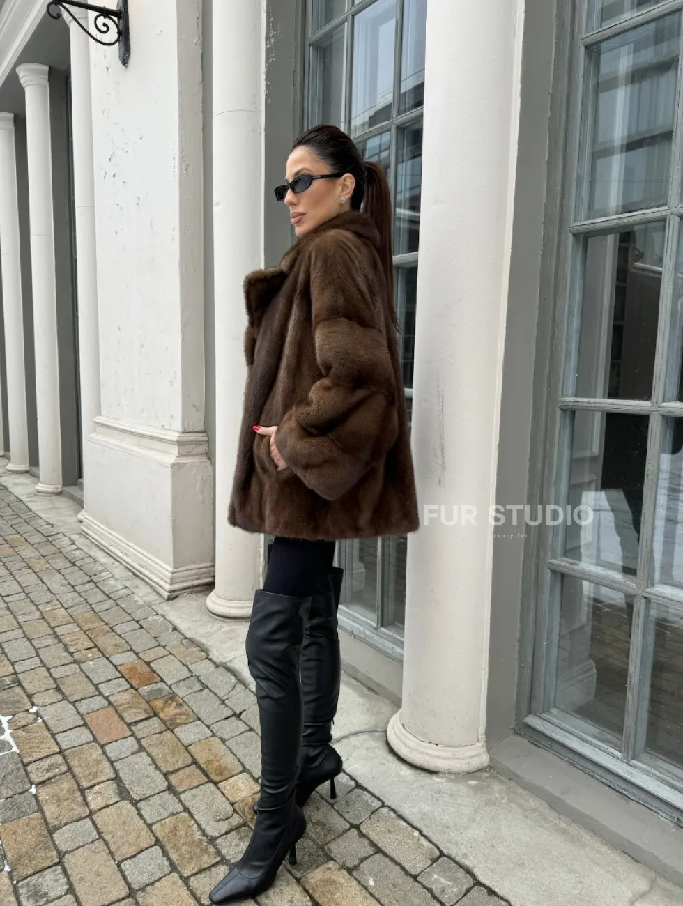Мех данной шубы аукционная норка , цвет коричневый. Предлагается в размерах от 40 до 52. Длина модели 60-65 см, что выгодно подчеркивает фигуру девушек. Эта модель идеально подойдет для девушек и женщин, предпочитающих роскошные натуральные меха.