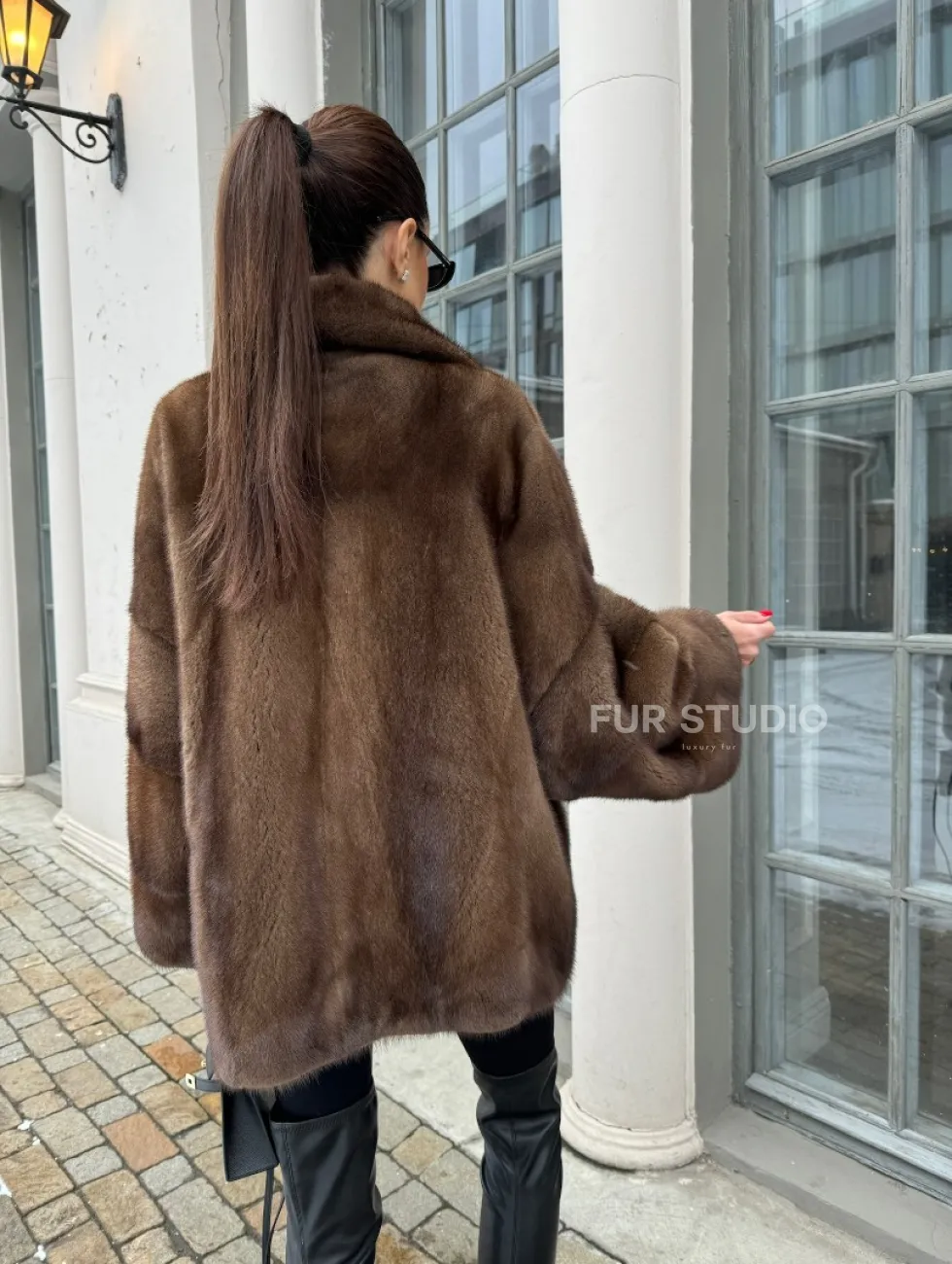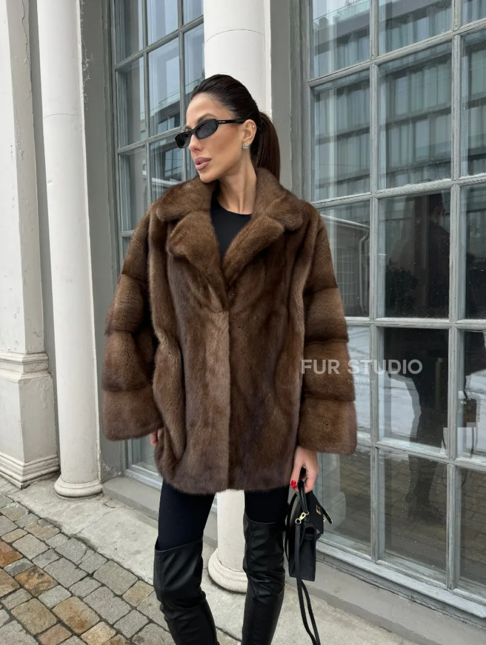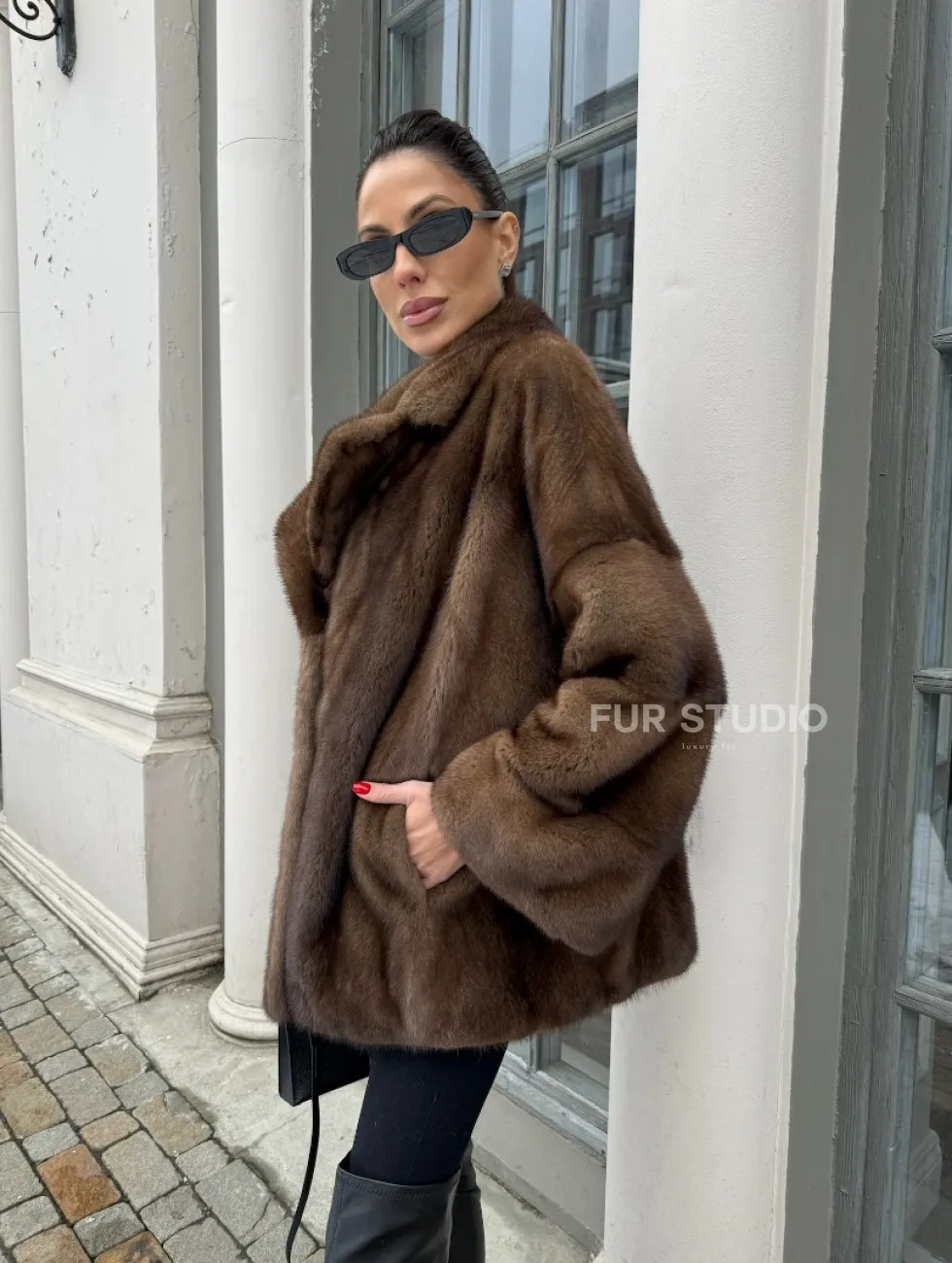 Мех данной шубы аукционная норка , цвет коричневый. Предлагается в размерах от 40 до 52. Длина модели 60-65 см, что выгодно подчеркивает фигуру девушек. Эта модель идеально подойдет для девушек и женщин, предпочитающих роскошные натуральные меха.