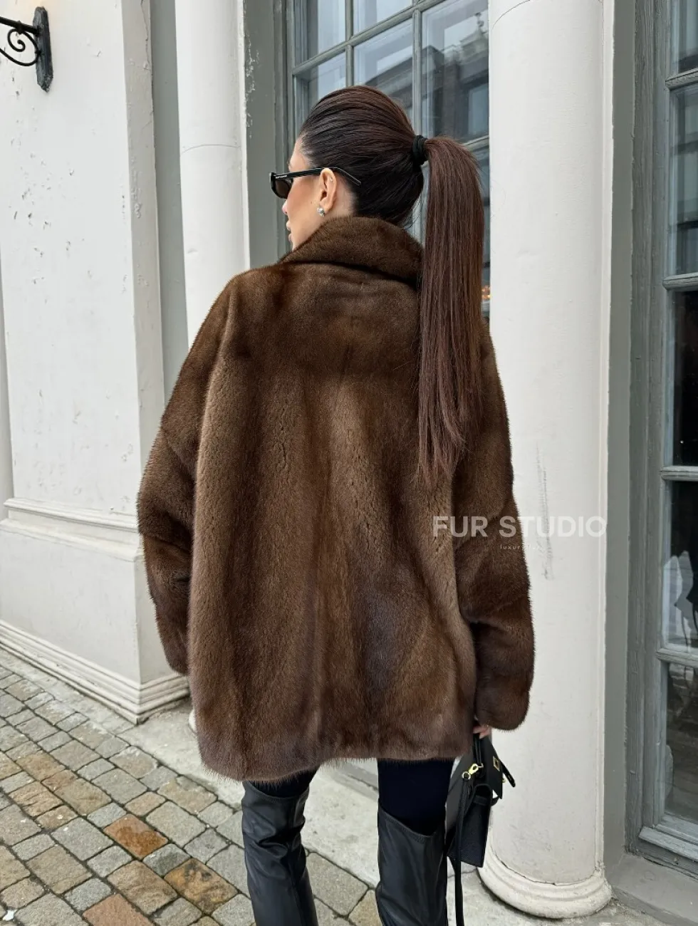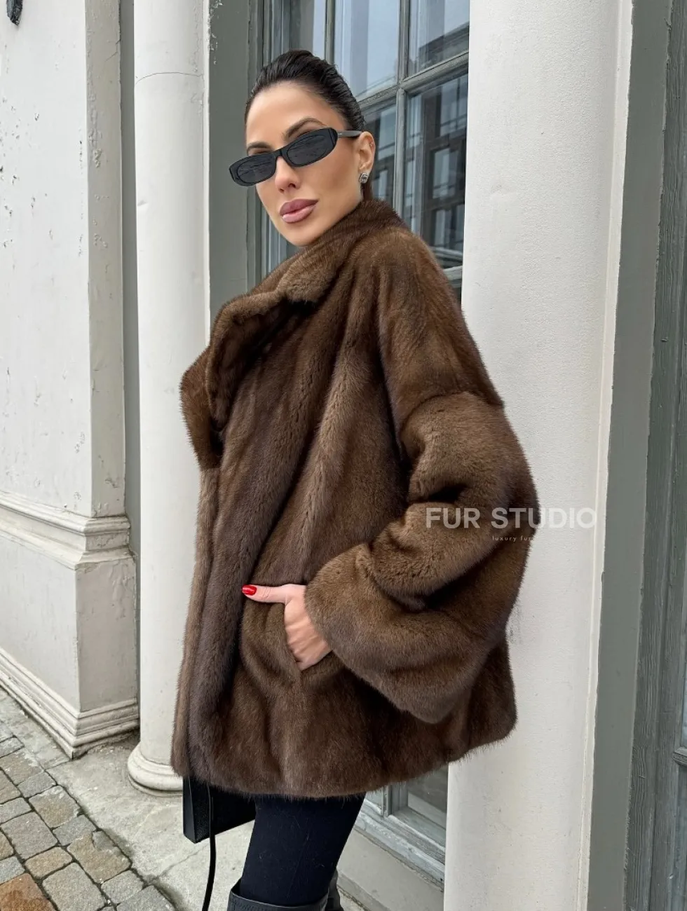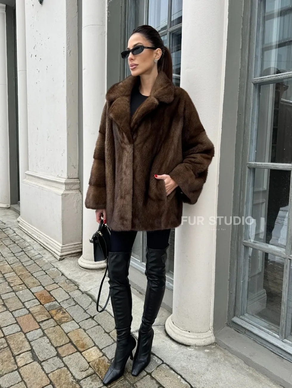 Мех данной шубы аукционная норка , цвет коричневый. Предлагается в размерах от 42 до 52. Длина модели 65-70 см, что выгодно подчеркивает фигуру девушек. Эта модель идеально подойдет для девушек и женщин, предпочитающих роскошные натуральные меха.