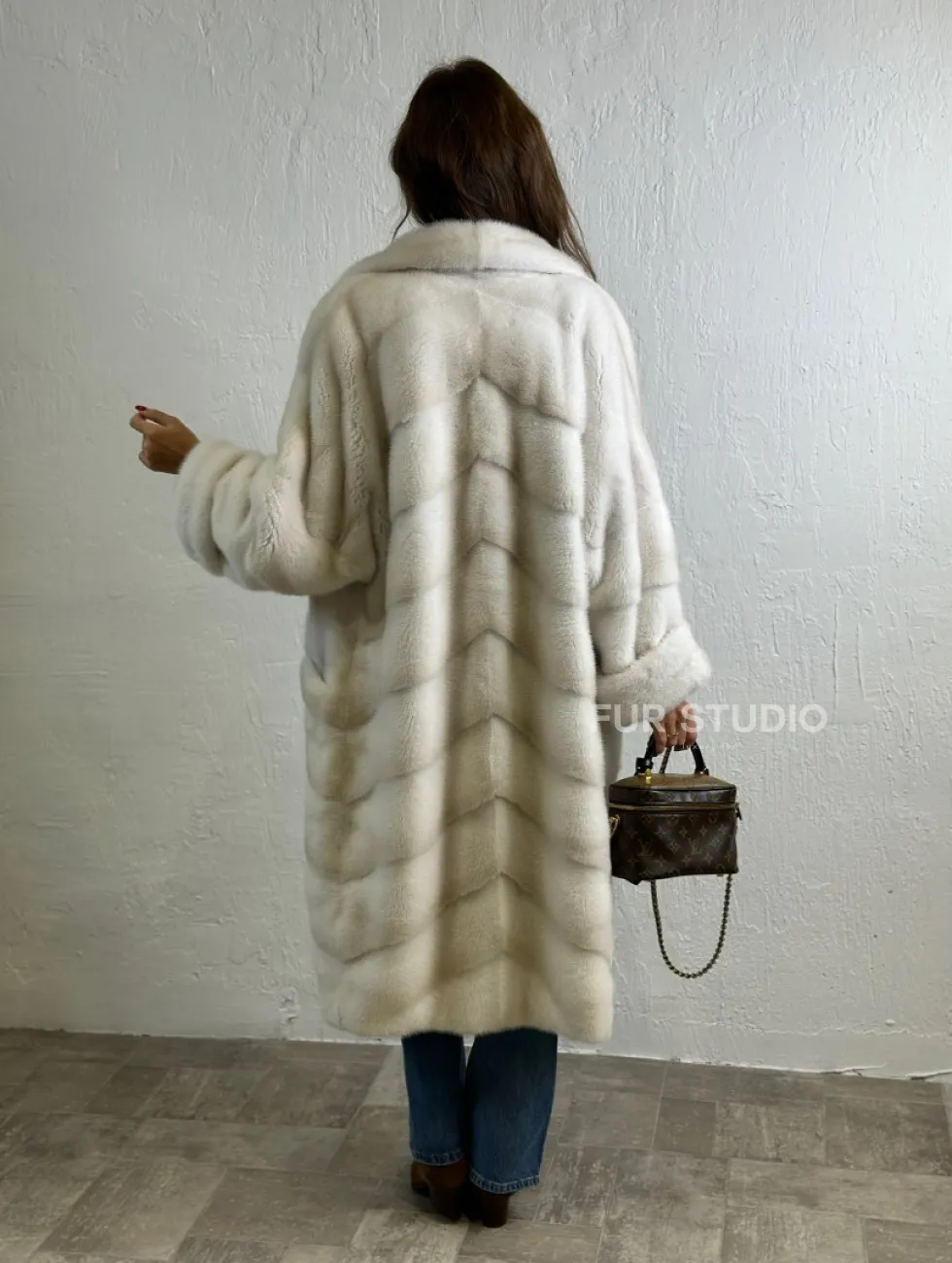 Мех данной шубы аукционная норка, цвет белый. Предлагается в размерах от 40 до 50. Длина модели 105-110 см, что выгодно подчеркивает фигуру девушек. Эта модель идеально подойдет для девушек и женщин, предпочитающих роскошные натуральные меха.