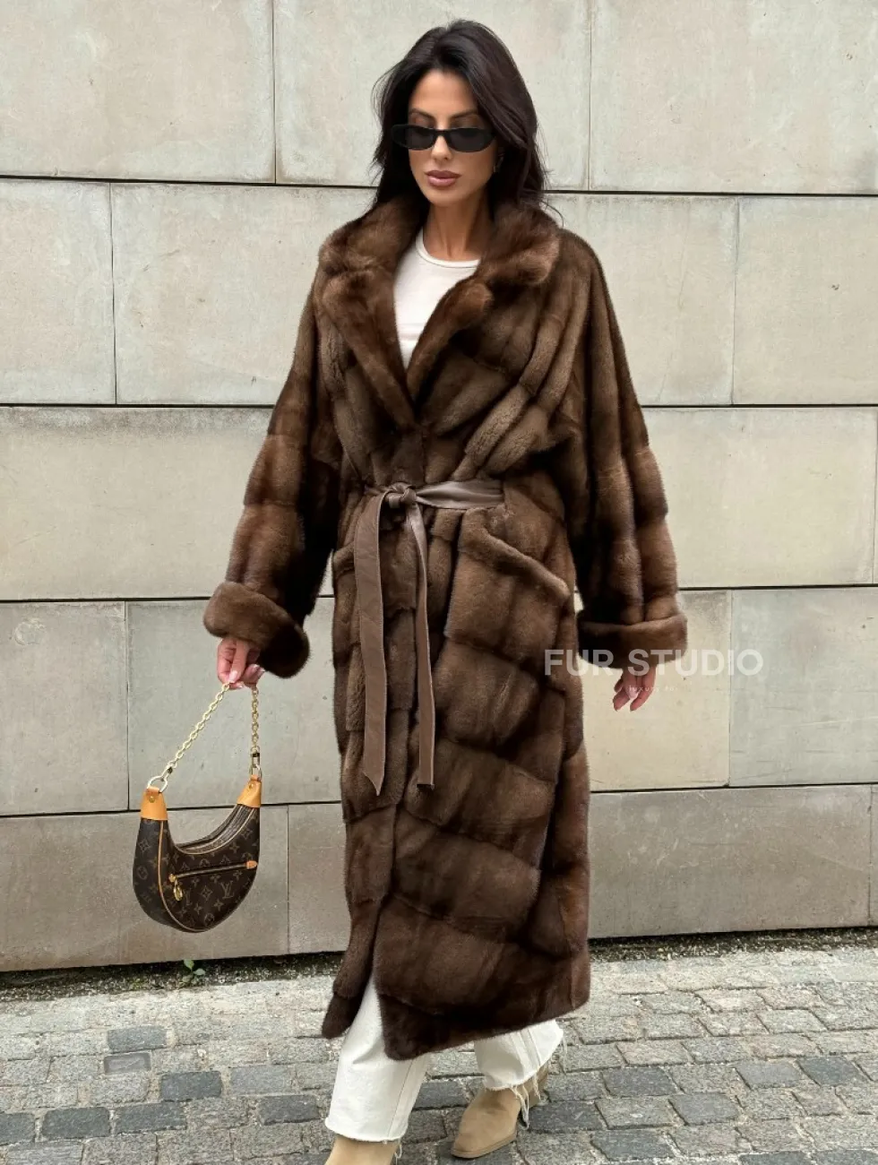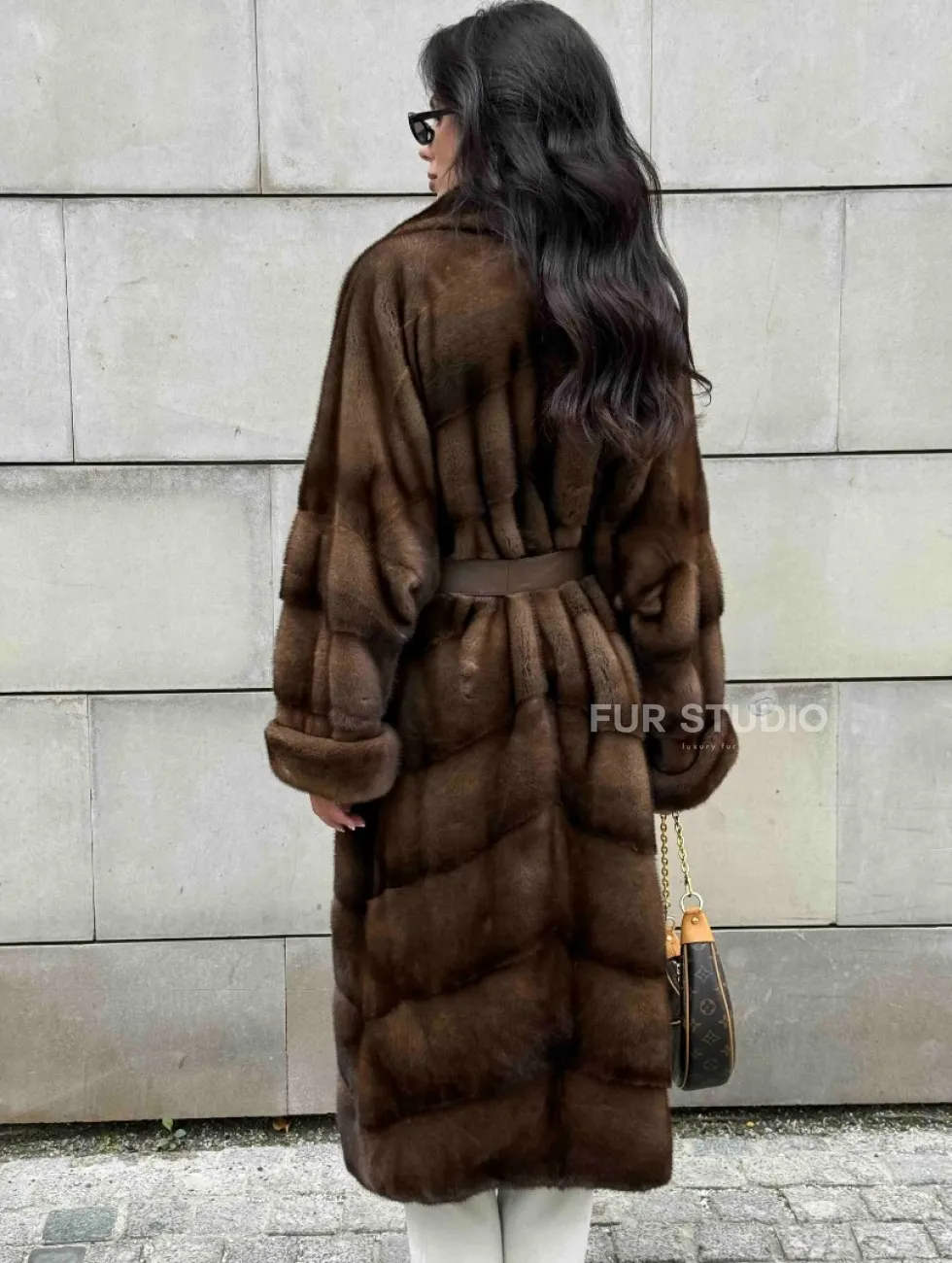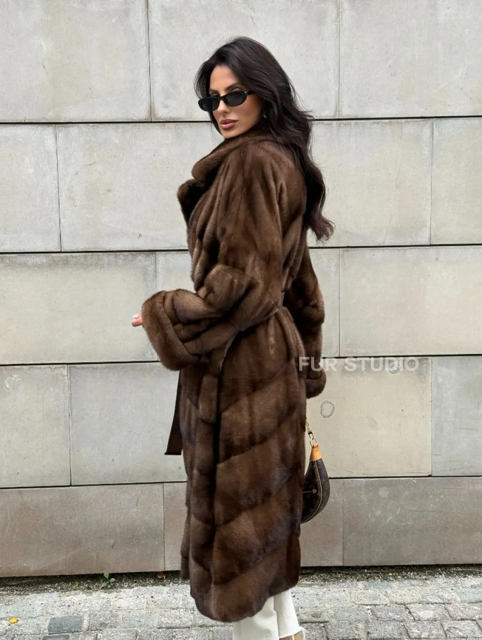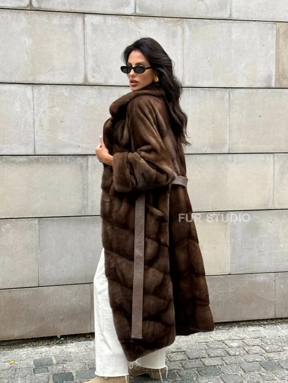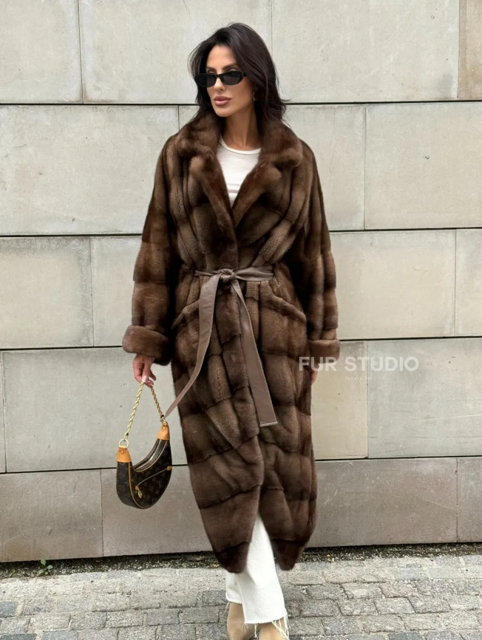 Мех данной шубы аукционная норка, цвет коричневый. Предлагается в размерах от 42 до 50 с 52 до 60 возможен отшив по индивидуальным параметрам. Длина модели 115-120 см, что выгодно подчеркивает фигуру девушек. Эта модель идеально подойдет для девушек и женщин, предпочитающих роскошные натуральные меха.