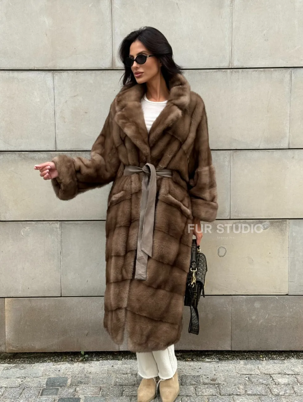 Мех данной шубы аукционная норка, цвет коричневый. Предлагается в размерах от 42 до 50. Длина модели 115-120 см, что выгодно подчеркивает фигуру девушек. Эта модель идеально подойдет для девушек и женщин, предпочитающих роскошные натуральные меха.