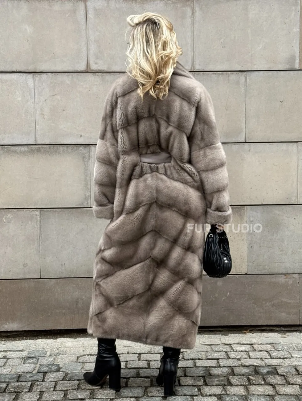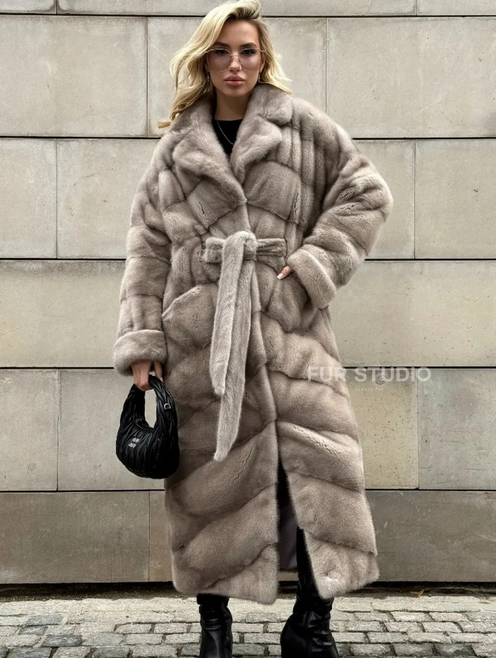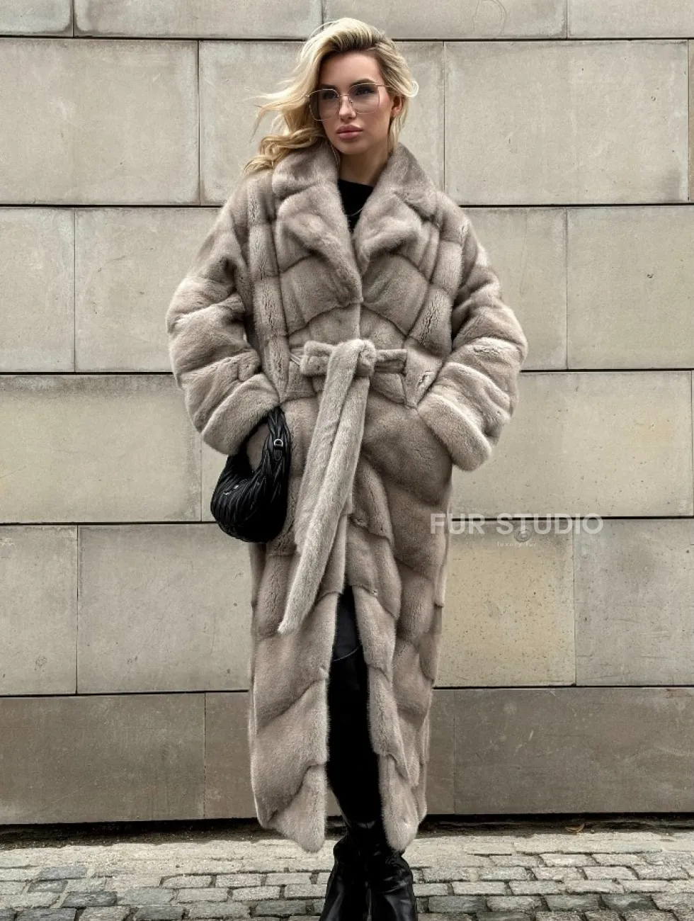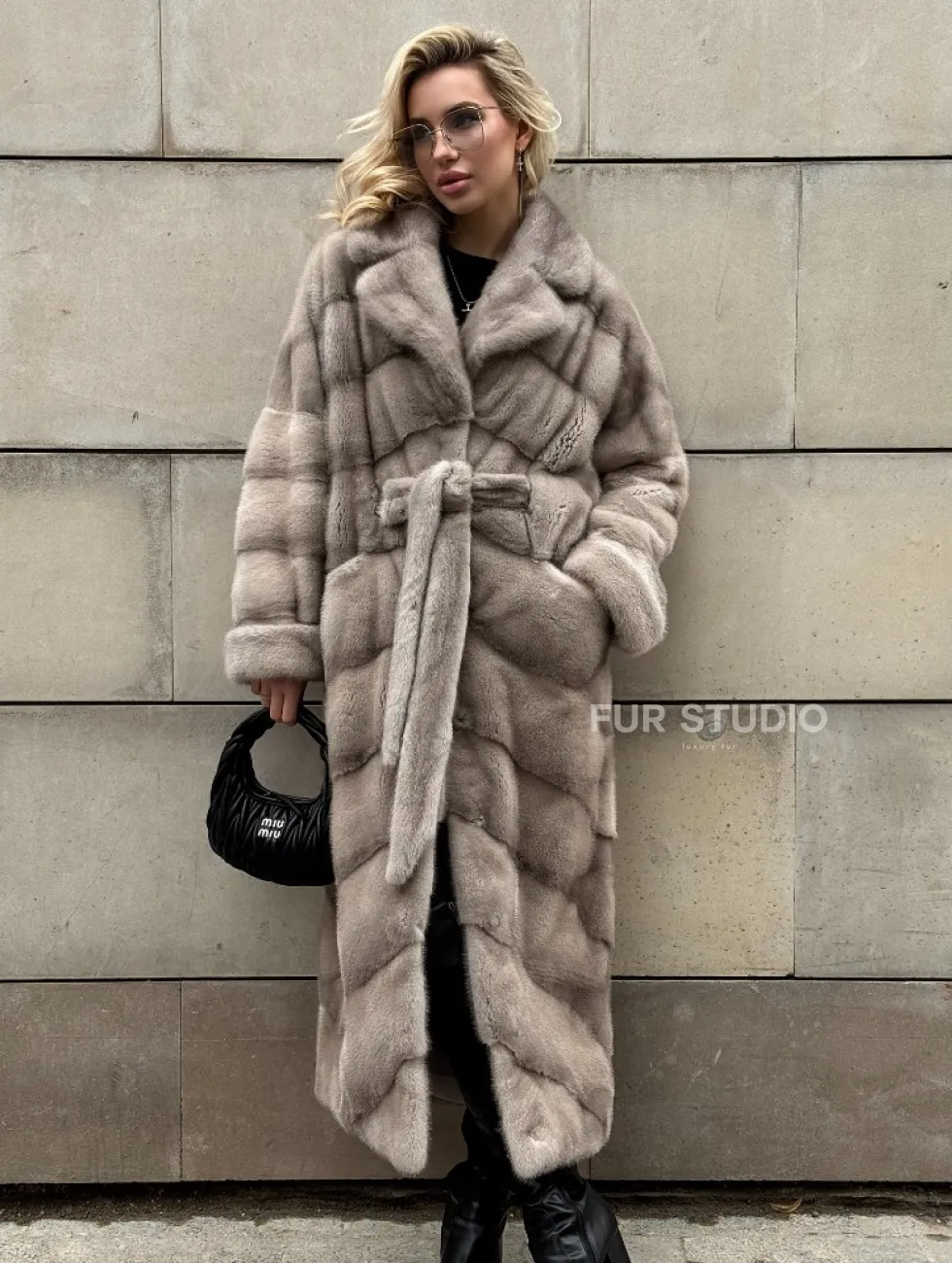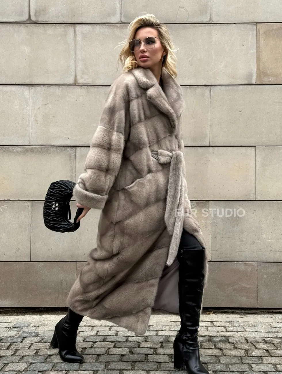 Мех данной шубы аукционная норка, цвет серый. Предлагается в размерах от 42 до 52. Длина модели 125-130 см, что выгодно подчеркивает фигуру девушек. Эта модель идеально подойдет для девушек и женщин, предпочитающих роскошные натуральные меха.