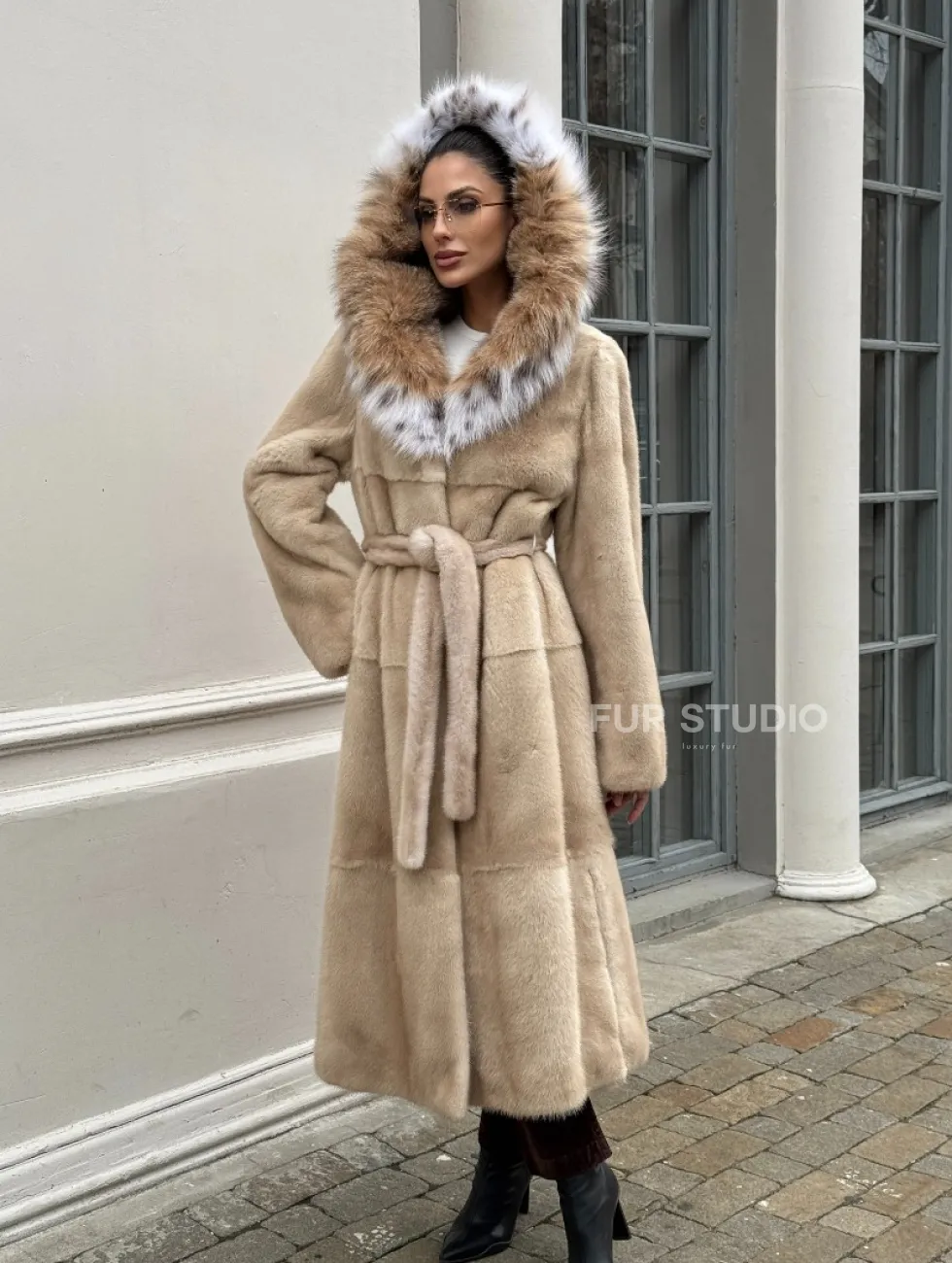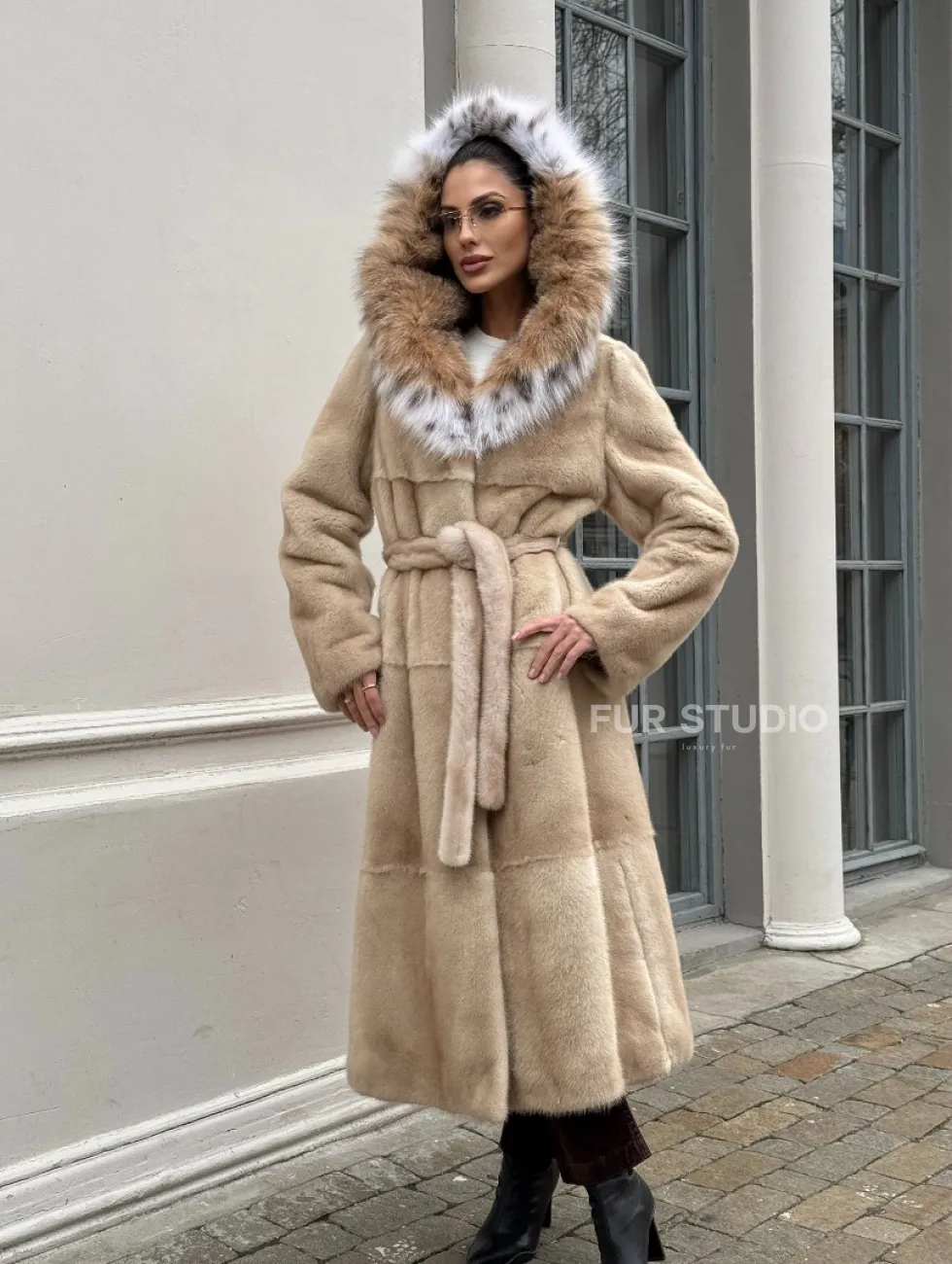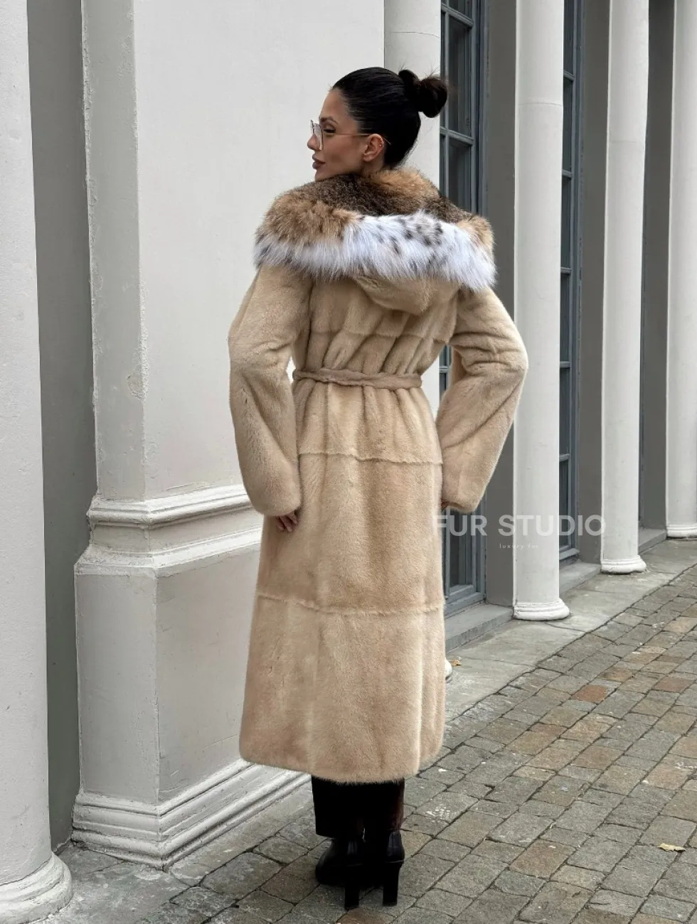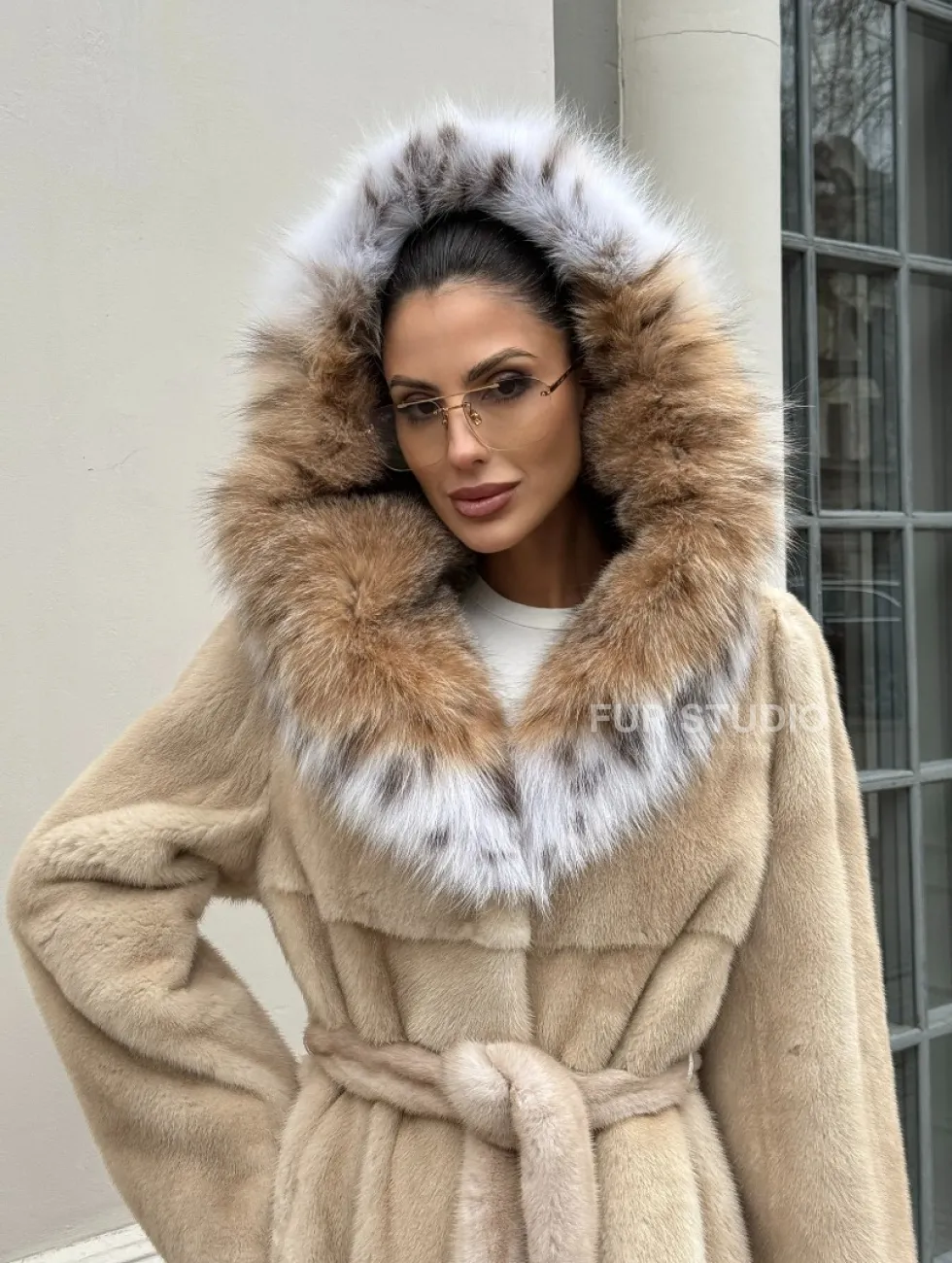 Классическая шуба из меха норки Champagne с капюшоном из рыси доступна для покупки в нашем шоуруме Furs Studio в Чите. У нас так же есть доставка во все города России. Добавьте немного роскоши в свой гардероб с этой шубой, которая будет служить вам многие годы.