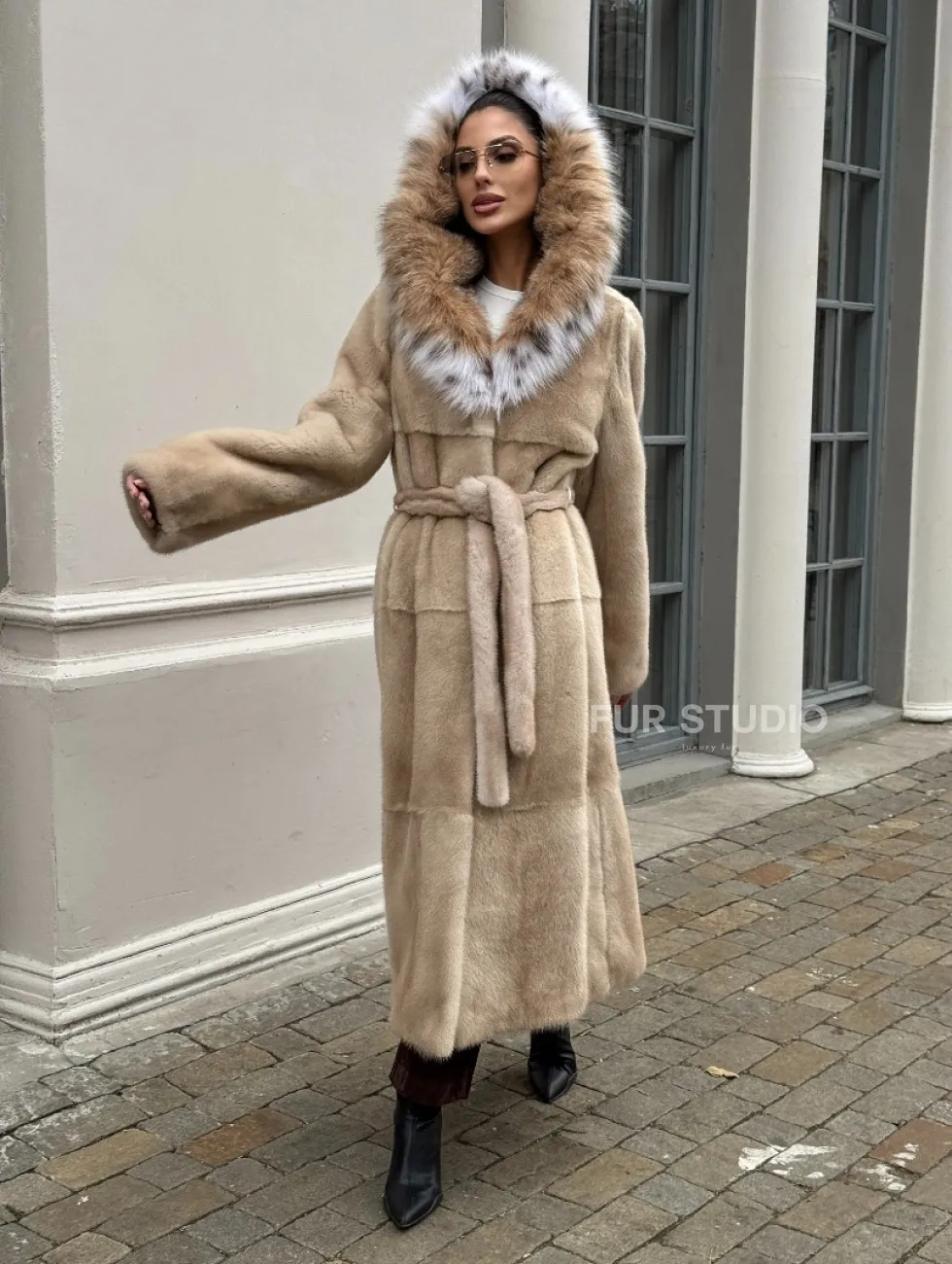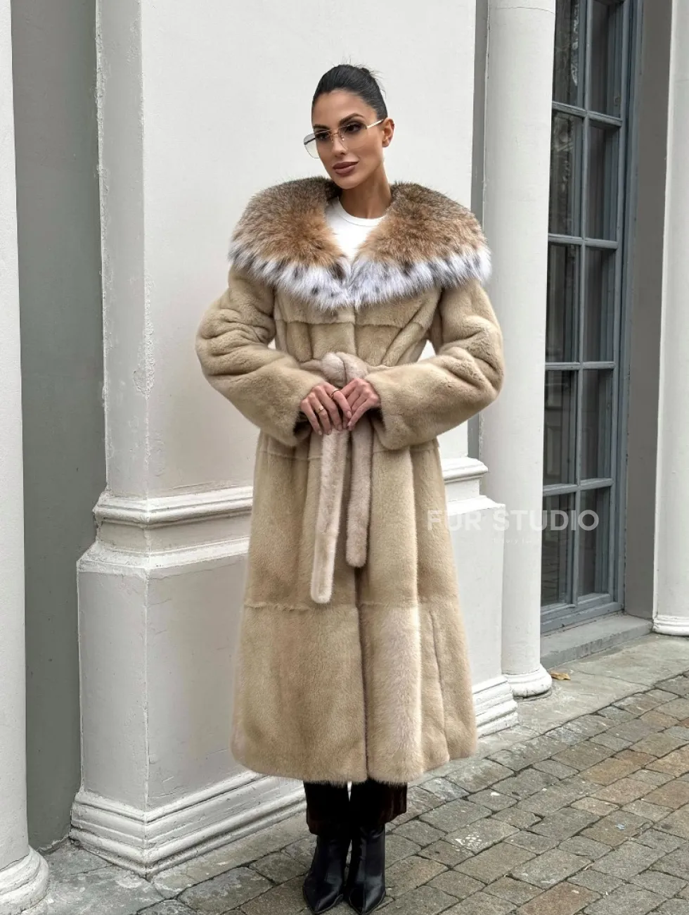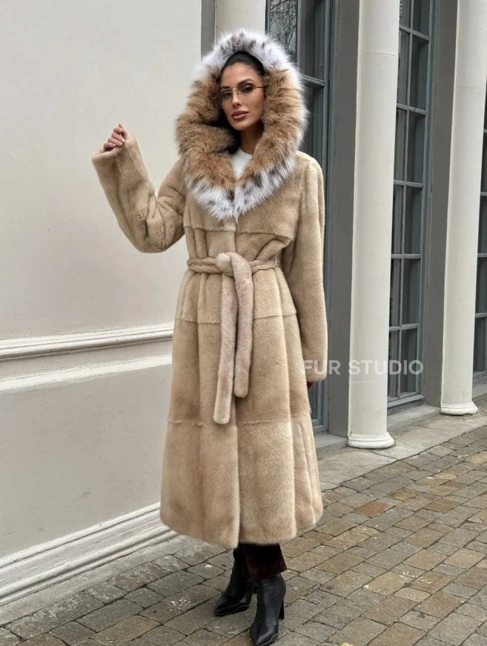 Классическая шуба из меха норки Champagne с капюшоном из рыси доступна для покупки в нашем шоуруме Furs Studio в Чите. У нас так же есть доставка во все города России. Добавьте немного роскоши в свой гардероб с этой шубой, которая будет служить вам многие годы.