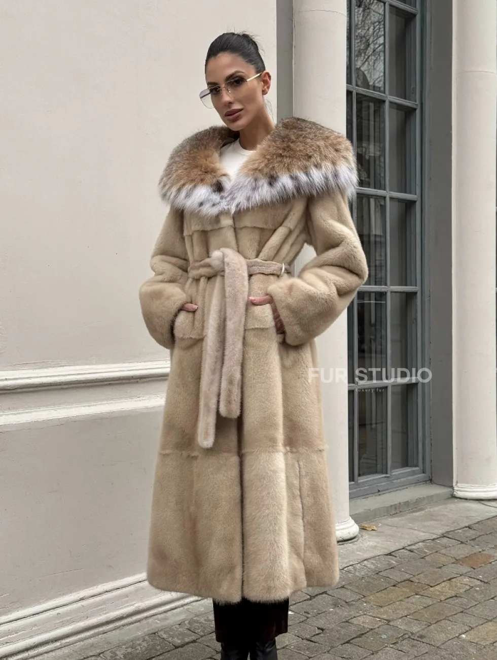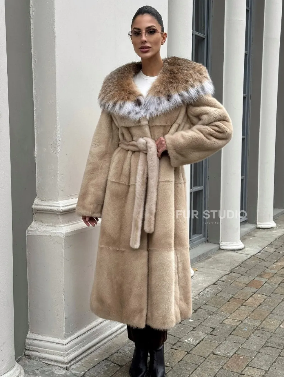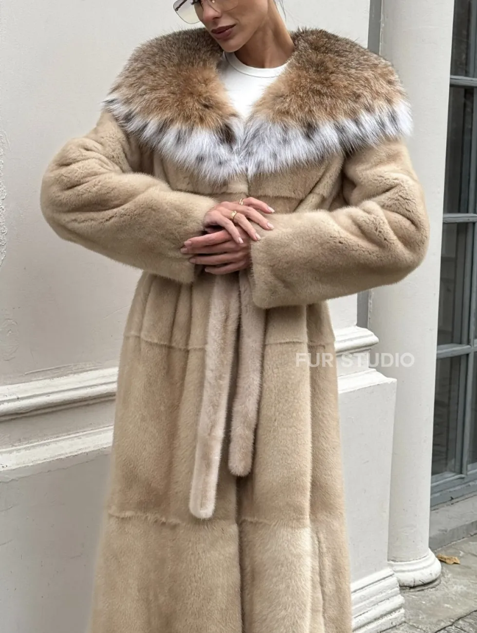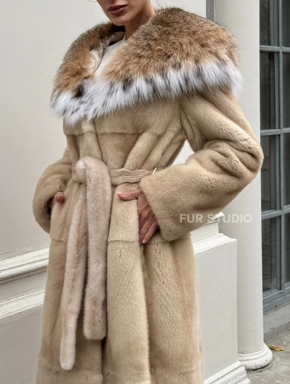 Классическая шуба из меха норки Champagne с капюшоном из рыси доступна для покупки в нашем шоуруме Furs Studio в Чите. У нас так же есть доставка во все города России. Добавьте немного роскоши в свой гардероб с этой шубой, которая будет служить вам многие годы.