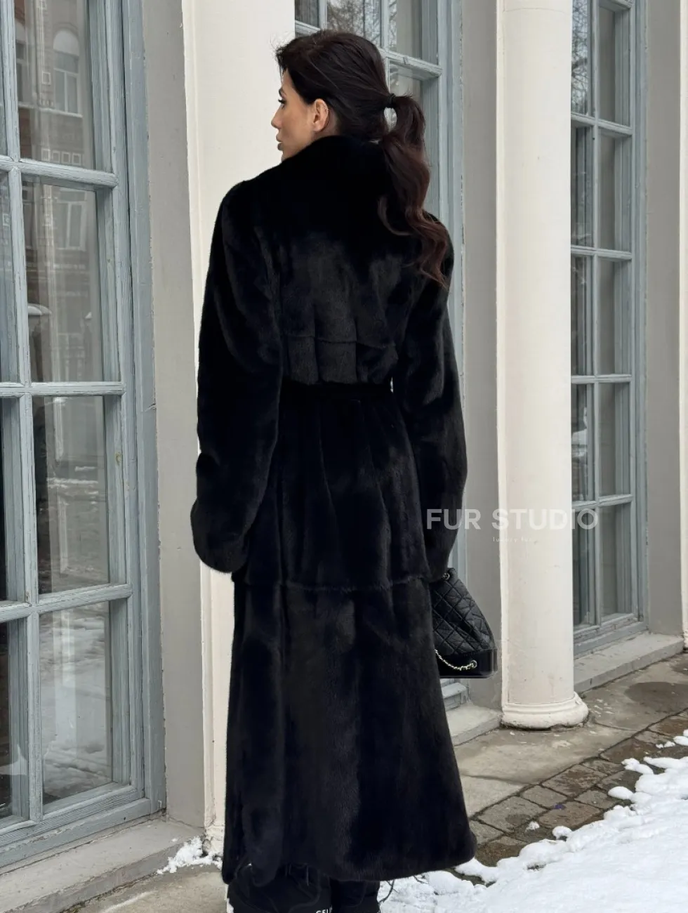 Мех данной шубы норка Blackglama , цвет черный. Предлагается в размерах от 40 до 52. Длина модели 125-130 см, что выгодно подчеркивает фигуру девушек. Эта модель идеально подойдет для девушек и женщин, предпочитающих роскошные натуральные меха.