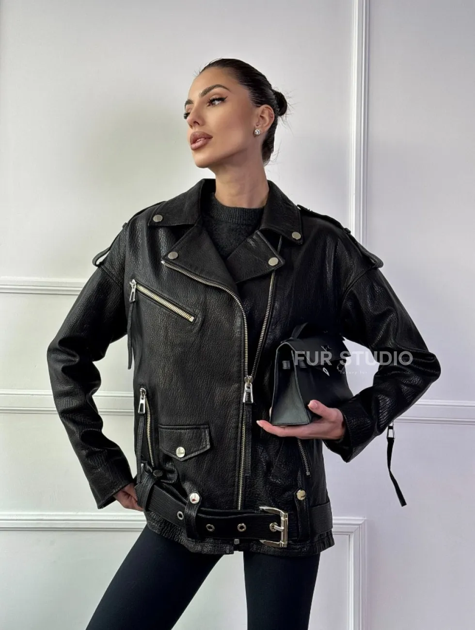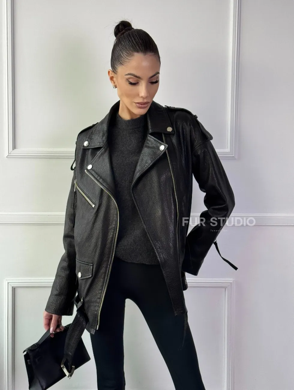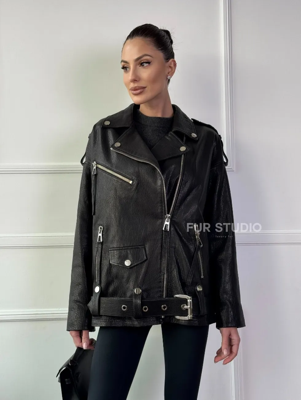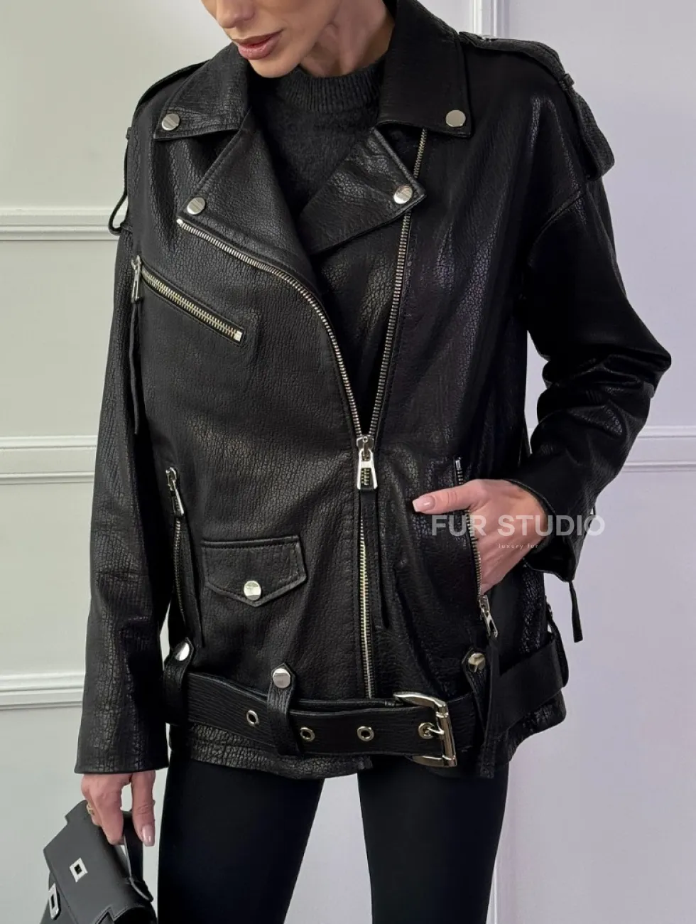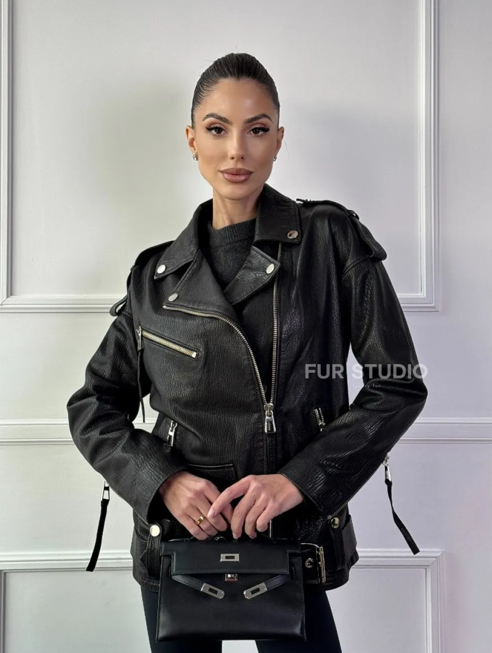 Классическая женская байкерская куртка - косуха из натуральной черной кожи Jumbo доступна для покупки в нашем шоуруме Furs Studio в Чите, где также предоставляется удобная доставка во все города России.
