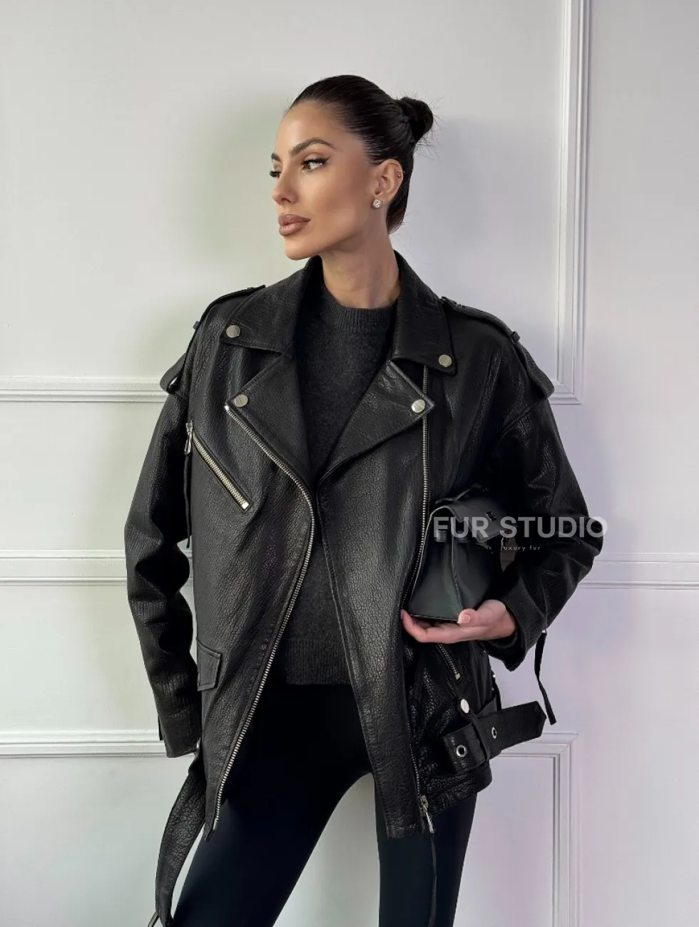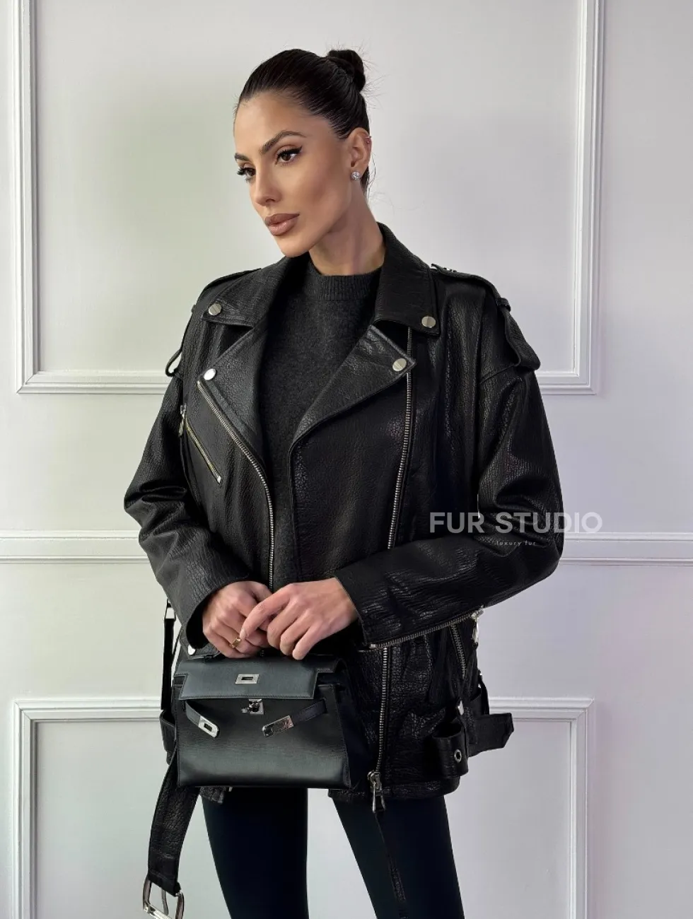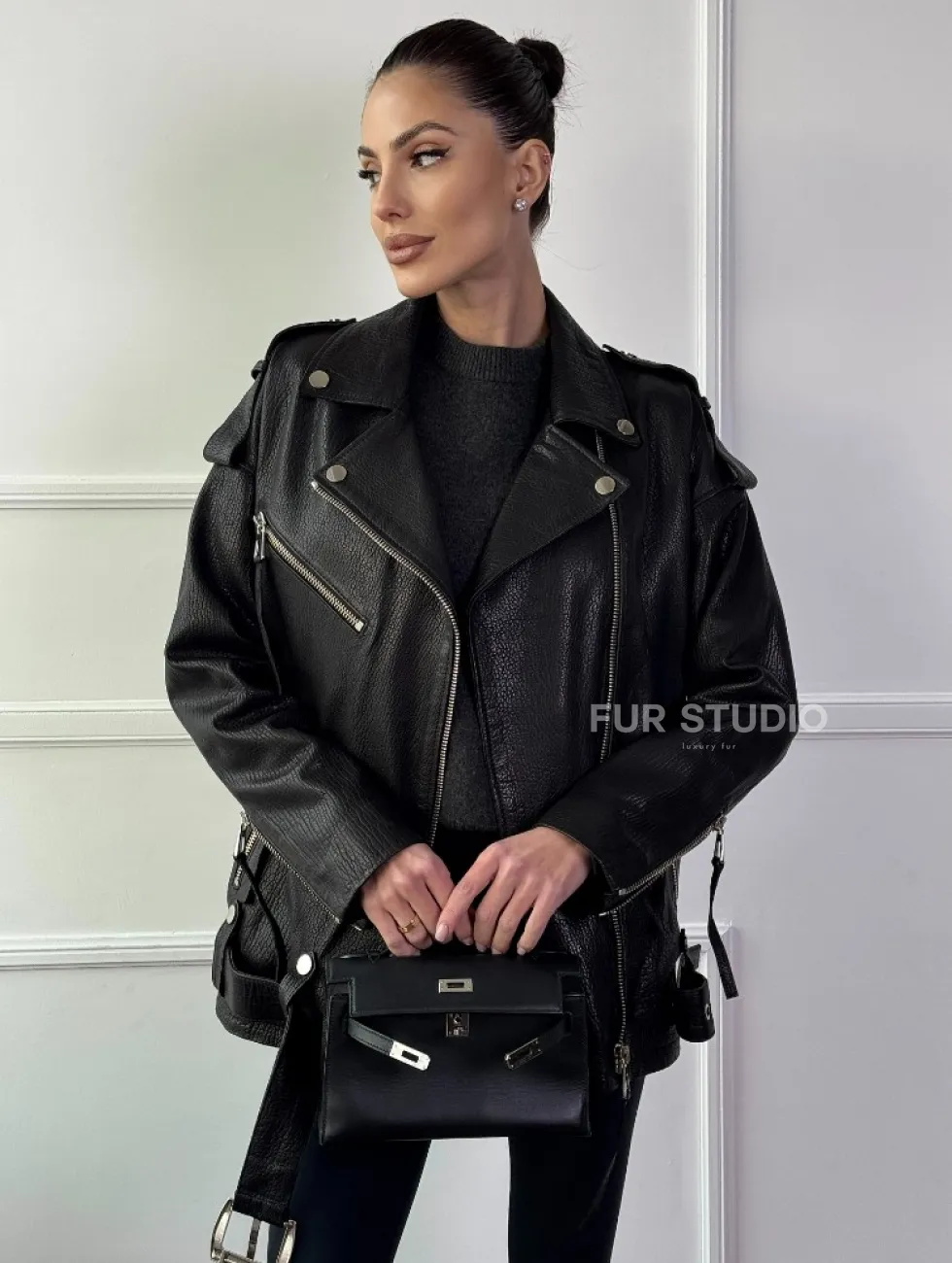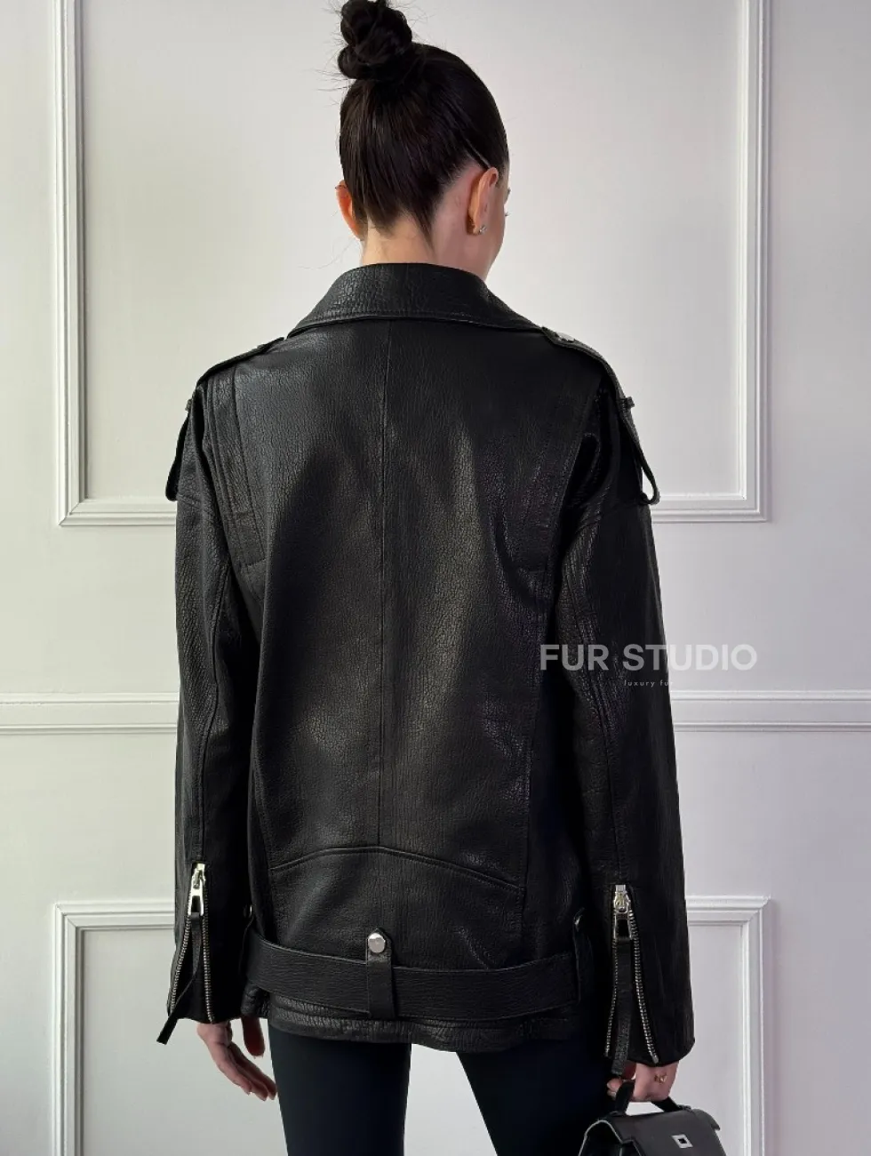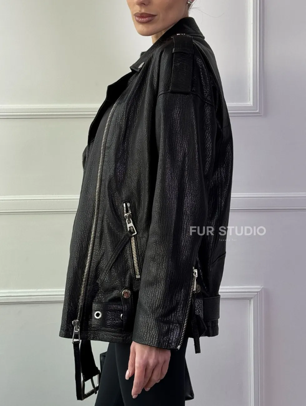 Классическая женская байкерская куртка - косуха из натуральной черной кожи Jumbo доступна для покупки в нашем шоуруме Furs Studio в Чите, где также предоставляется удобная доставка во все города России.