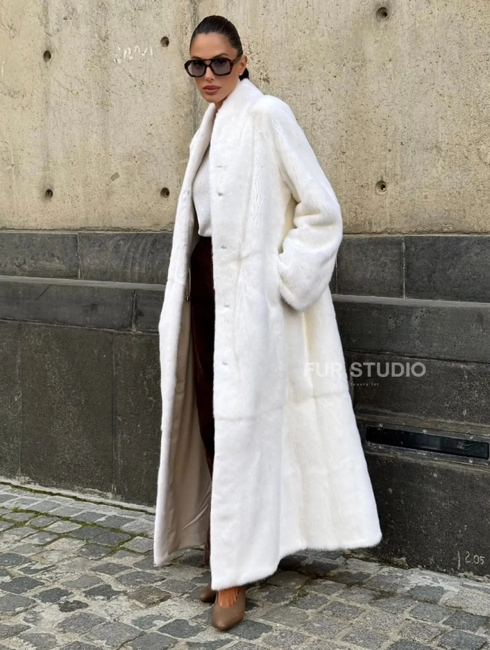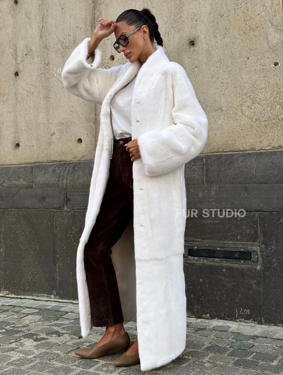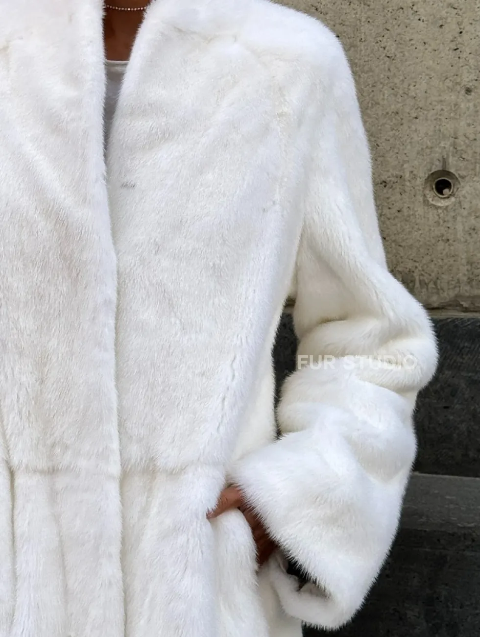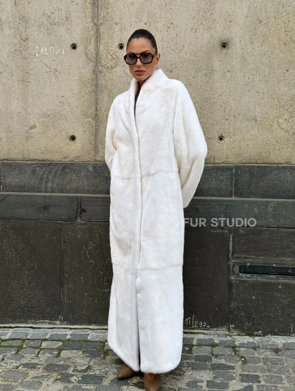 Мех данной шубы аукционная норка, цвет белый. Предлагается в размерах от 42 до 52 (инд.пошив от 54 до 66). Длина модели 125-130 см, что выгодно подчеркивает фигуру девушек. Эта модель идеально подойдет для девушек и женщин, предпочитающих роскошные натуральные меха.