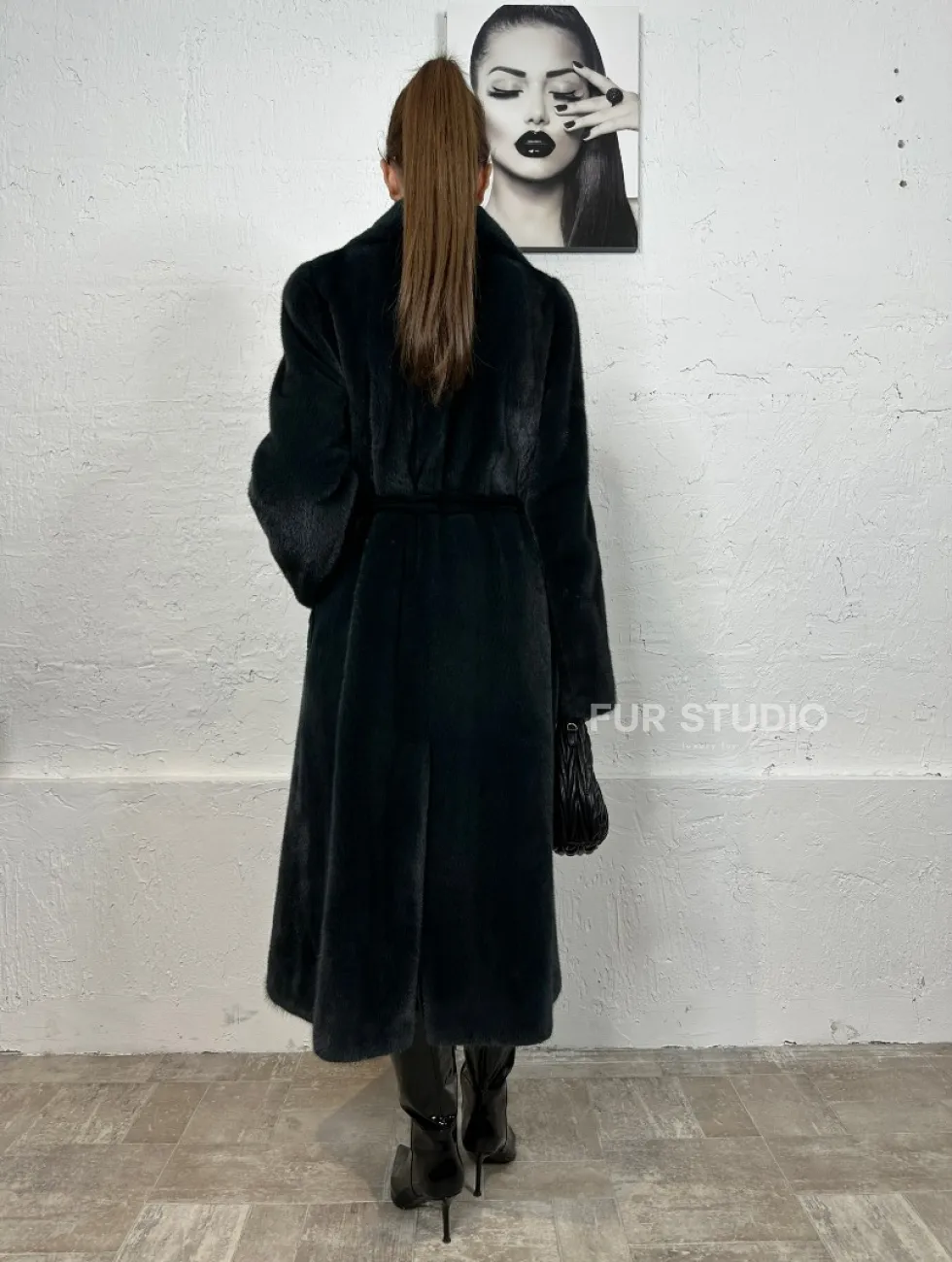 Мех данной шубы аукционная норка, цвет зеленый. Предлагается в размерах от 40 до 54. Длина модели 115-120 см, что выгодно подчеркивает фигуру девушек. Эта модель идеально подойдет для девушек и женщин, предпочитающих роскошные натуральные меха.
