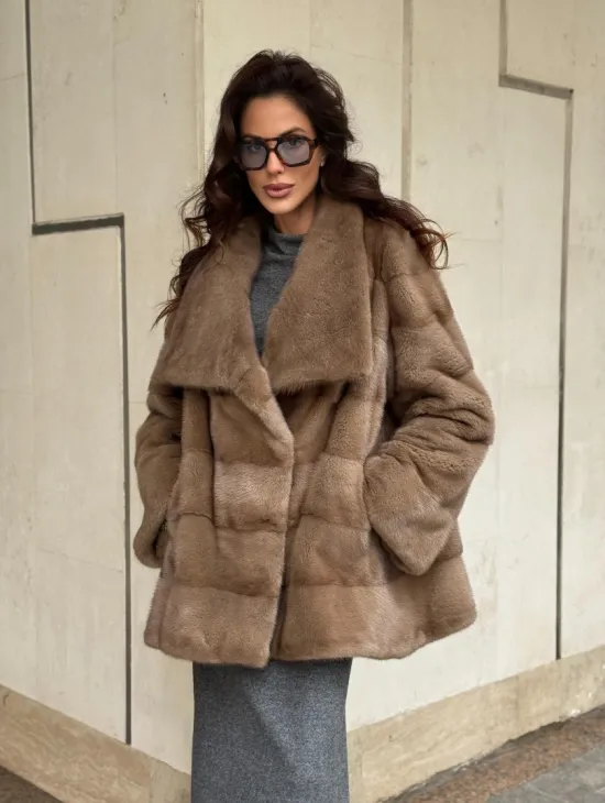 Мех данной шубы аукционная норка, цвет коричневый. Предлагается в размерах от 42 до 64. Длина модели 75-80 см, что выгодно подчеркивает фигуру девушек. Эта модель идеально подойдет для девушек и женщин, предпочитающих роскошные натуральные меха.