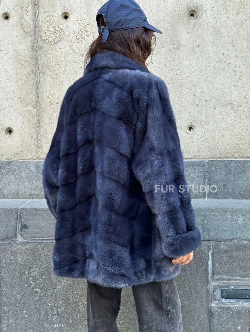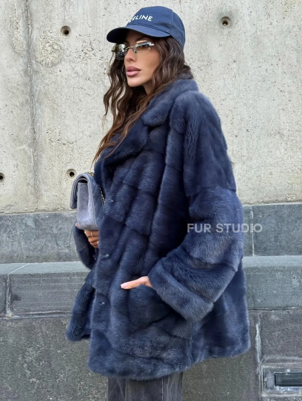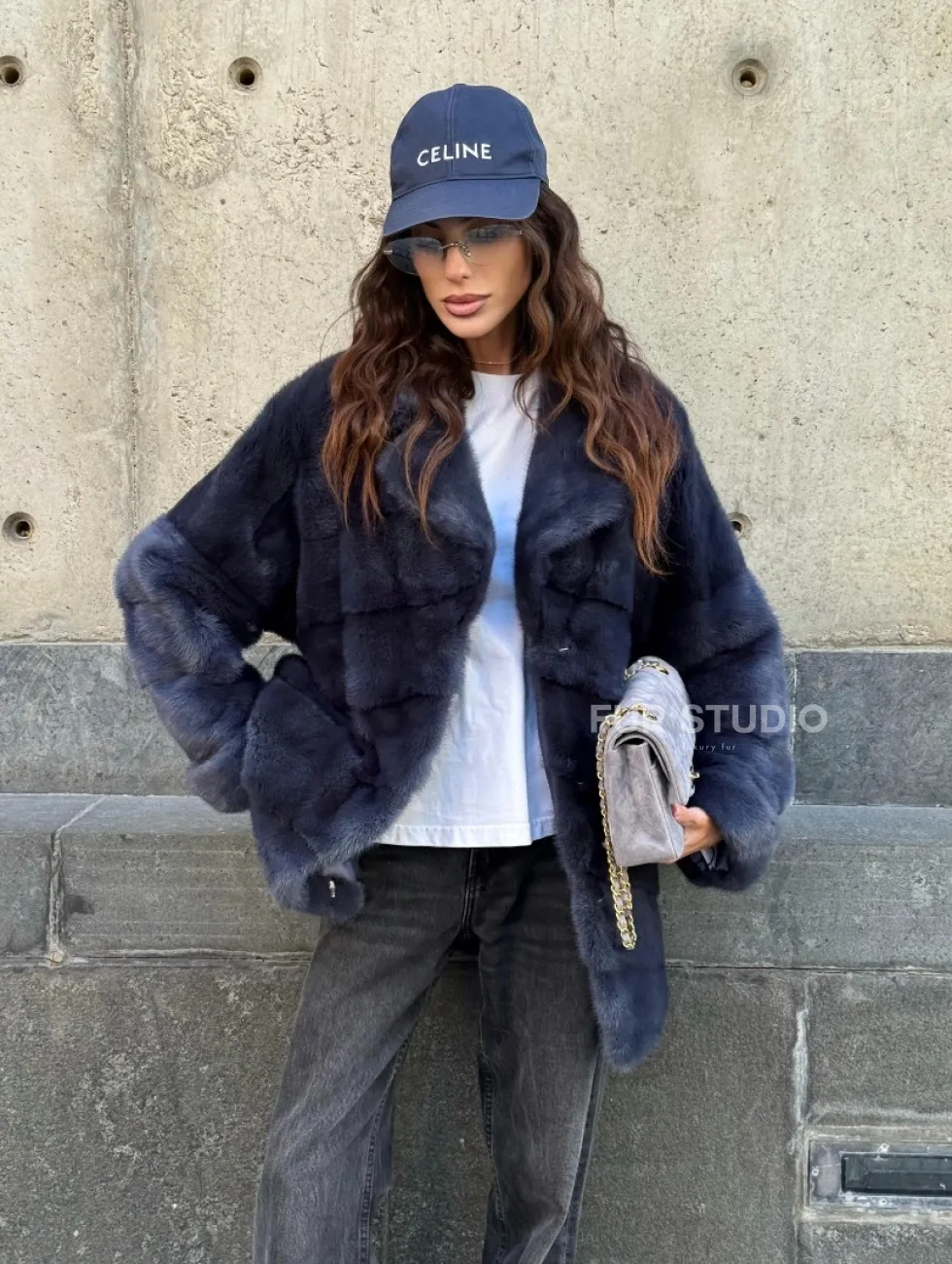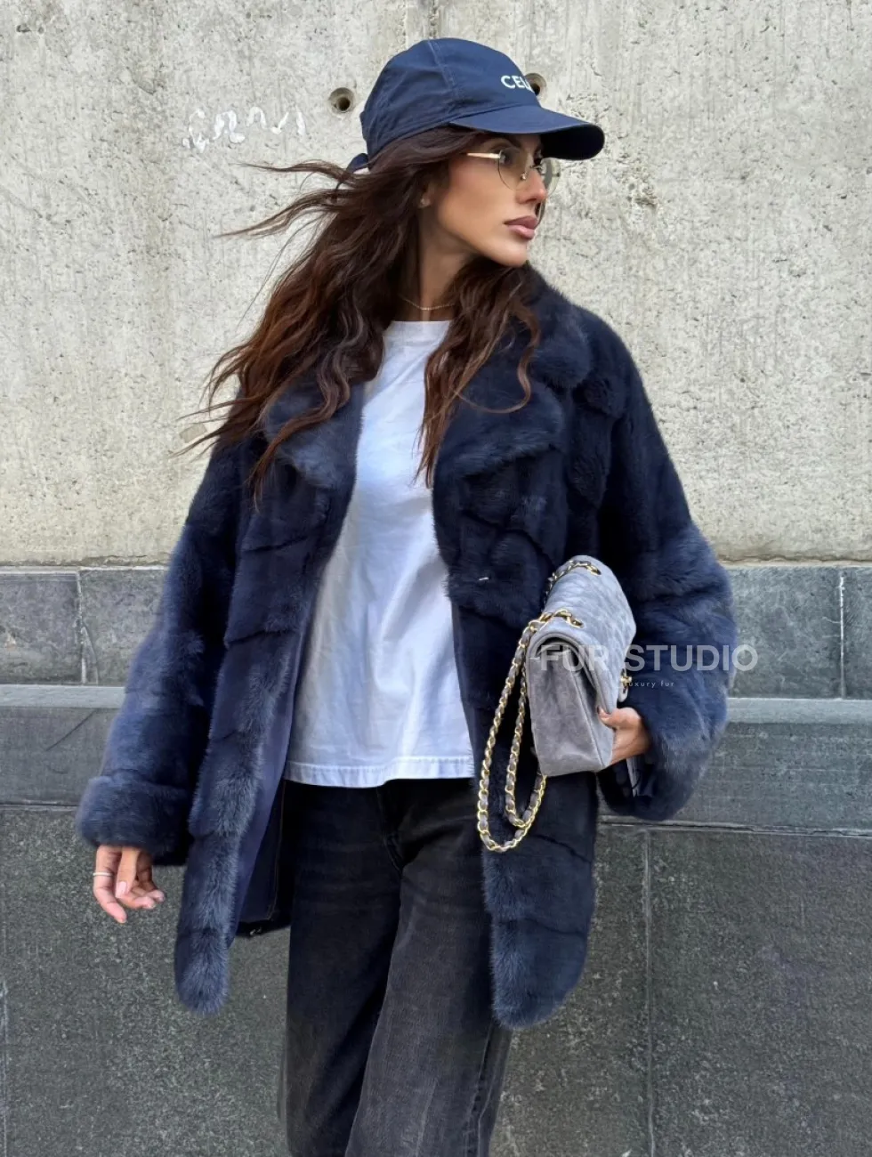 Мех данной шубы аукционная норка, цвет синий. Предлагается в размерах от 42 до 50. Длина модели 70-75 см, что выгодно подчеркивает фигуру девушек. Эта модель идеально подойдет для девушек и женщин, предпочитающих роскошные натуральные меха.