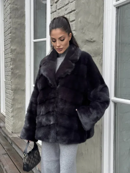 Мех данной шубы аукционная норка, цвет синий. Предлагается в размерах от 42 до 52. Длина модели 65-70 см, что выгодно подчеркивает фигуру девушек. Эта модель идеально подойдет для девушек и женщин, предпочитающих роскошные натуральные меха.