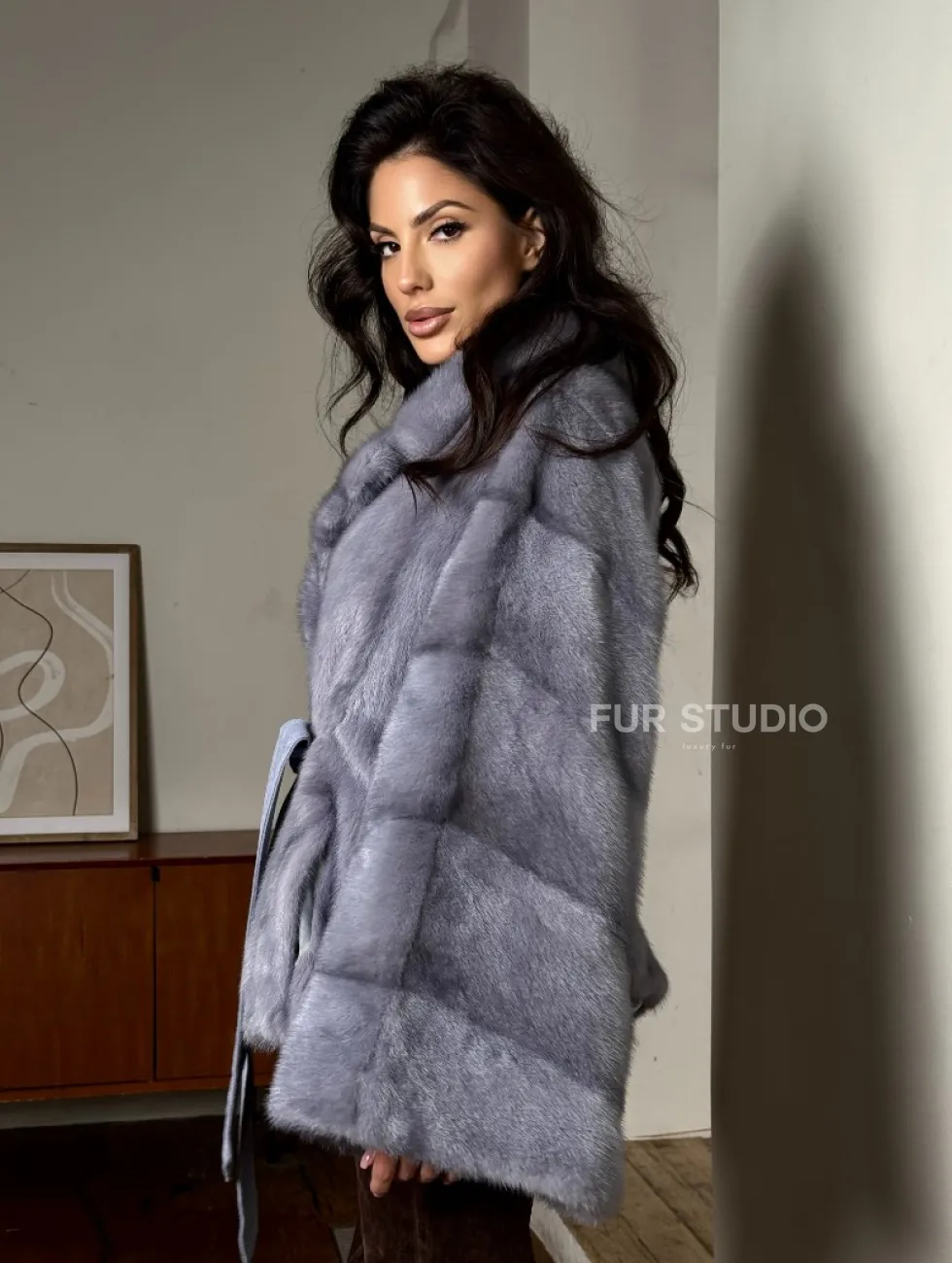 Мех данной шубы аукционная норка , цвет голубой. Предлагается в размерах от 40 до 52. Длина модели 55-60 см, что выгодно подчеркивает фигуру девушек. Эта модель идеально подойдет для девушек и женщин, предпочитающих роскошные натуральные меха.