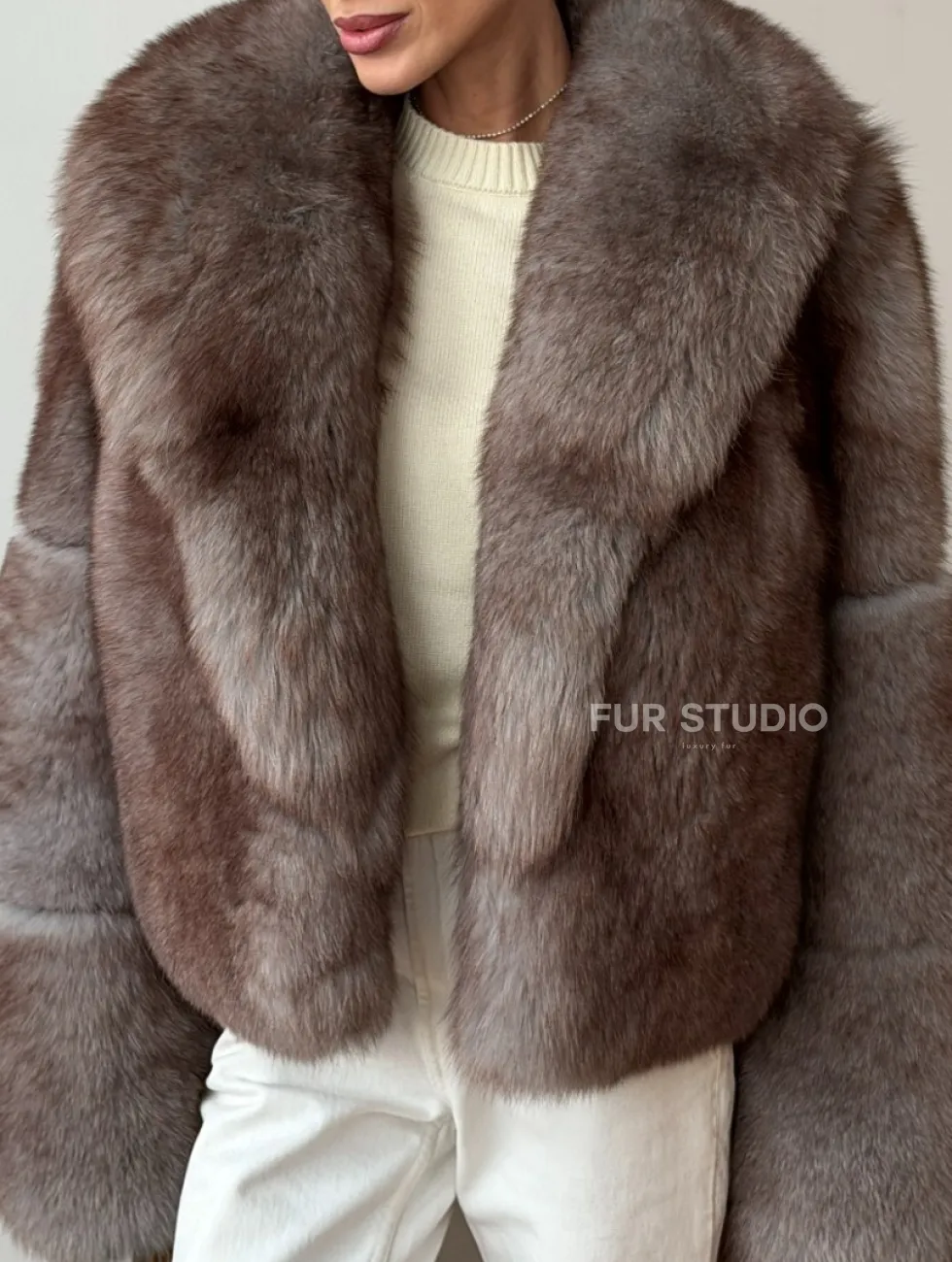 Мех данной шубы финский песец, цвет коричневый. Предлагается в размерах от 40 до 48. Длина модели 55-60 см, что выгодно подчеркивает фигуру девушек. Эта модель идеально подойдет для девушек и женщин, предпочитающих роскошные натуральные меха.