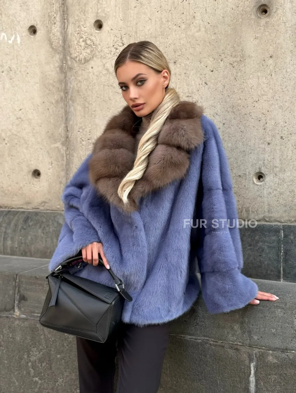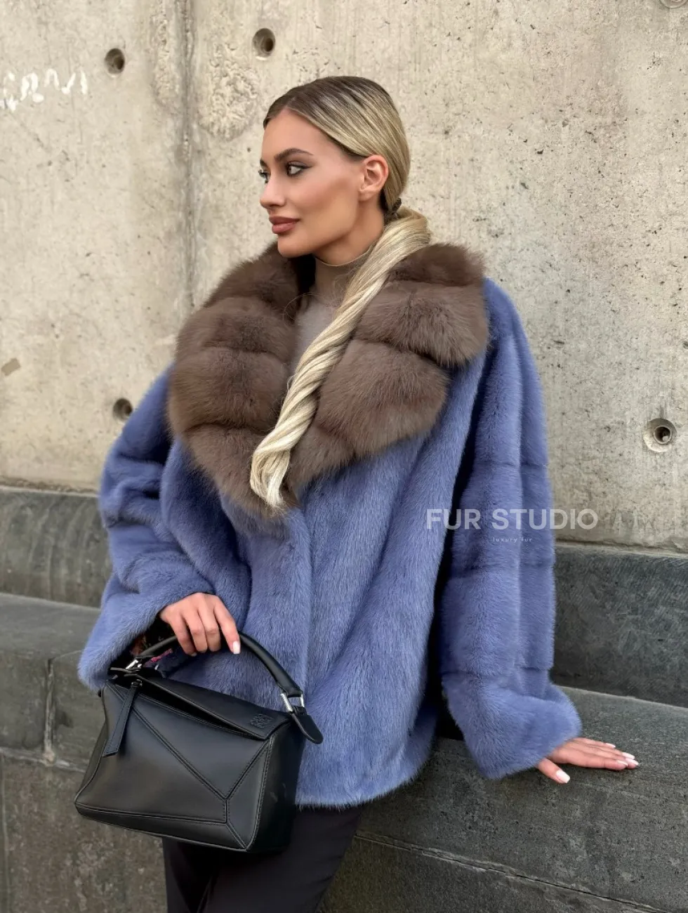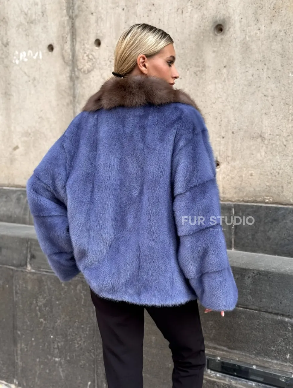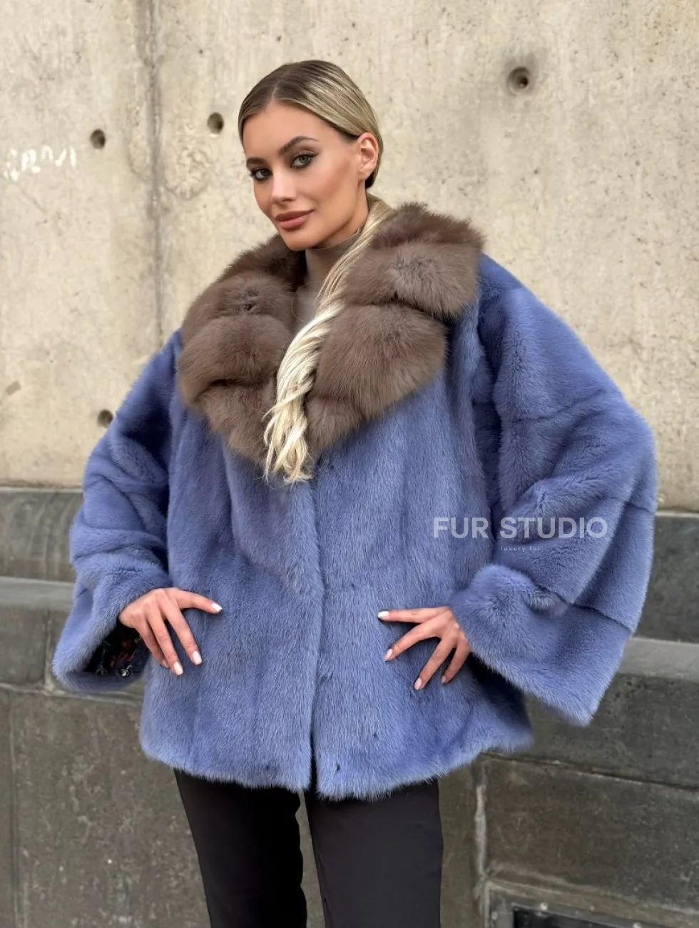 Мех данной шубы аукционная норка , цвет голубой. Предлагается в размерах от 42 до 50. Длина модели 55-60 см, что выгодно подчеркивает фигуру девушек. Эта модель идеально подойдет для девушек и женщин, предпочитающих роскошные натуральные меха.